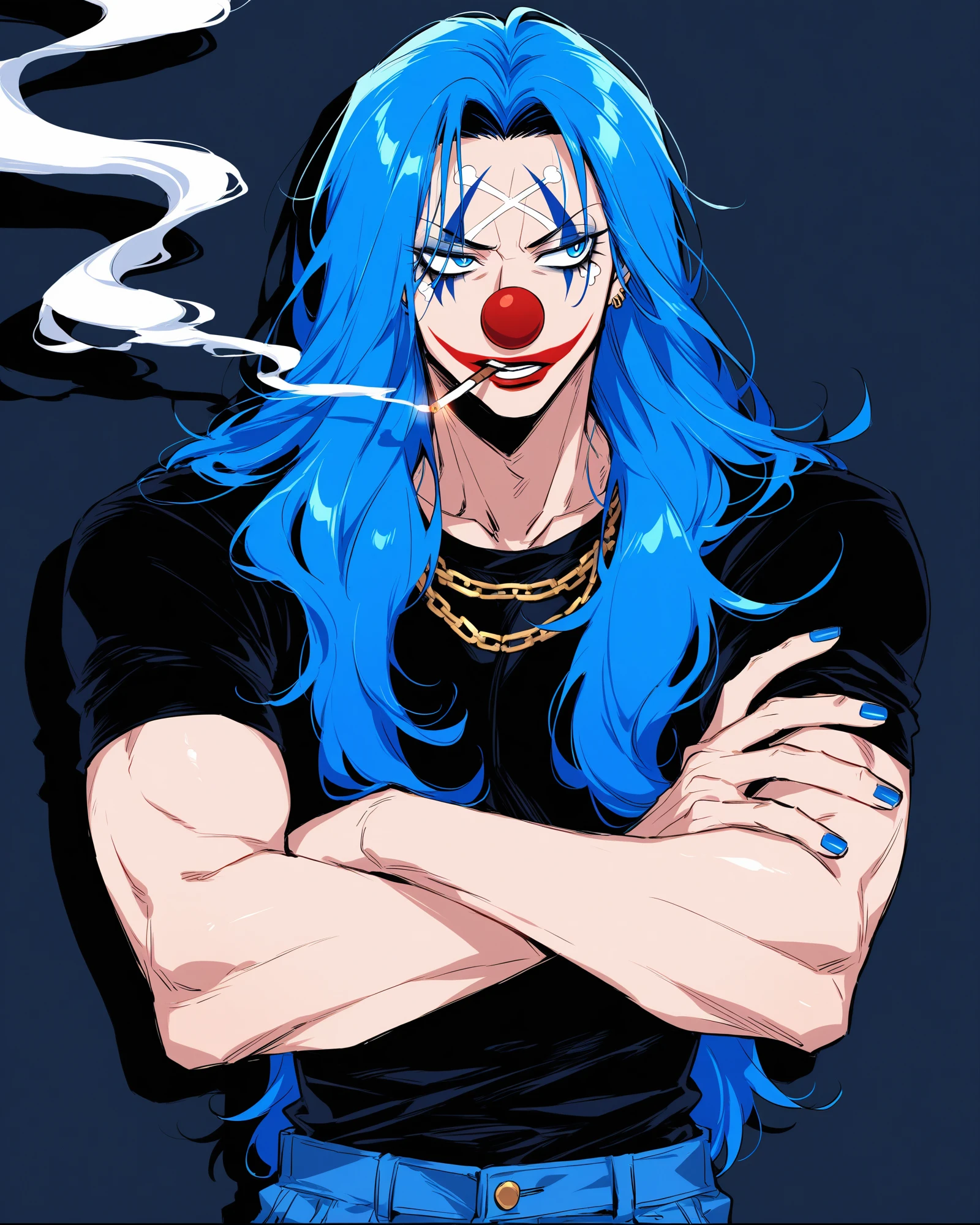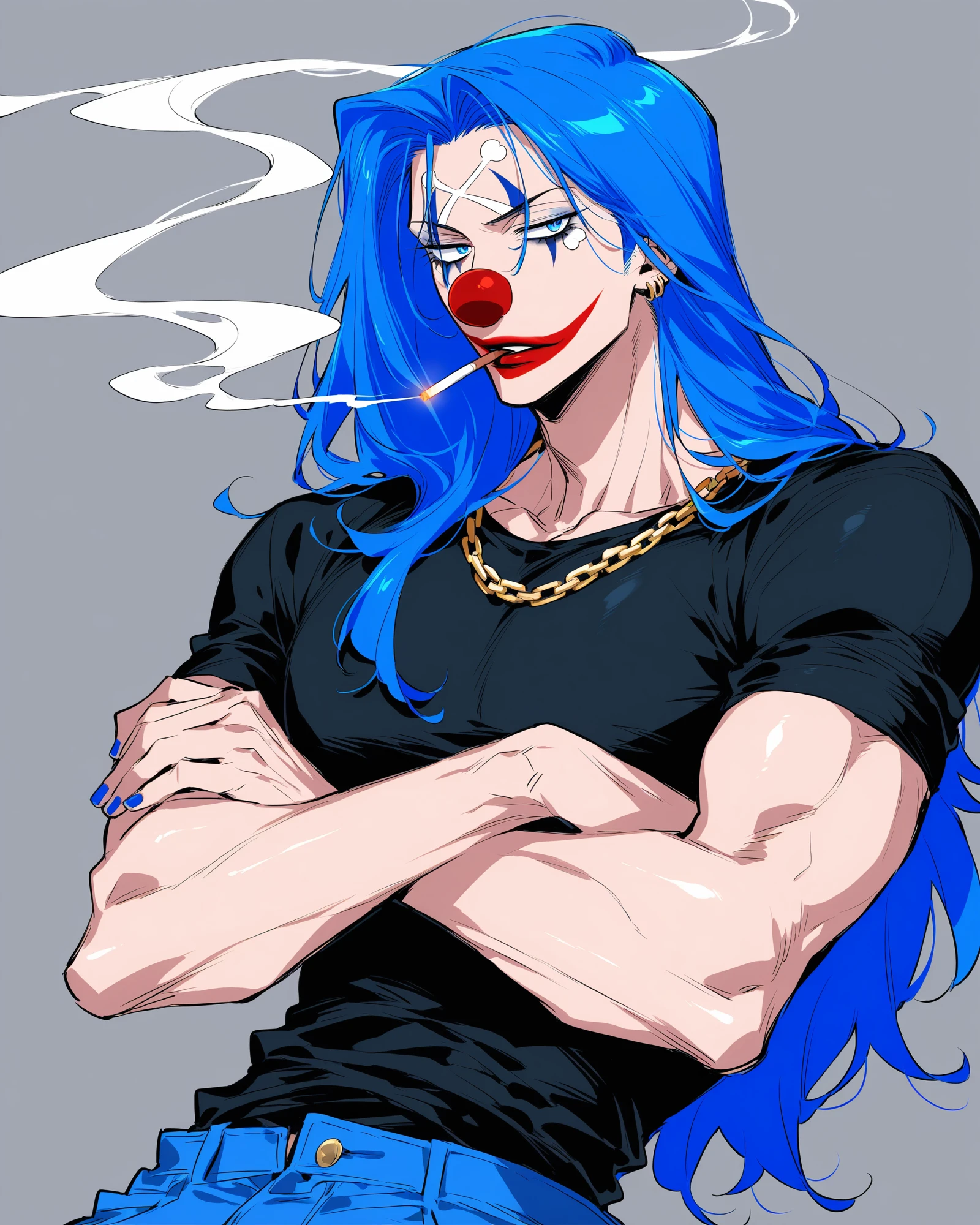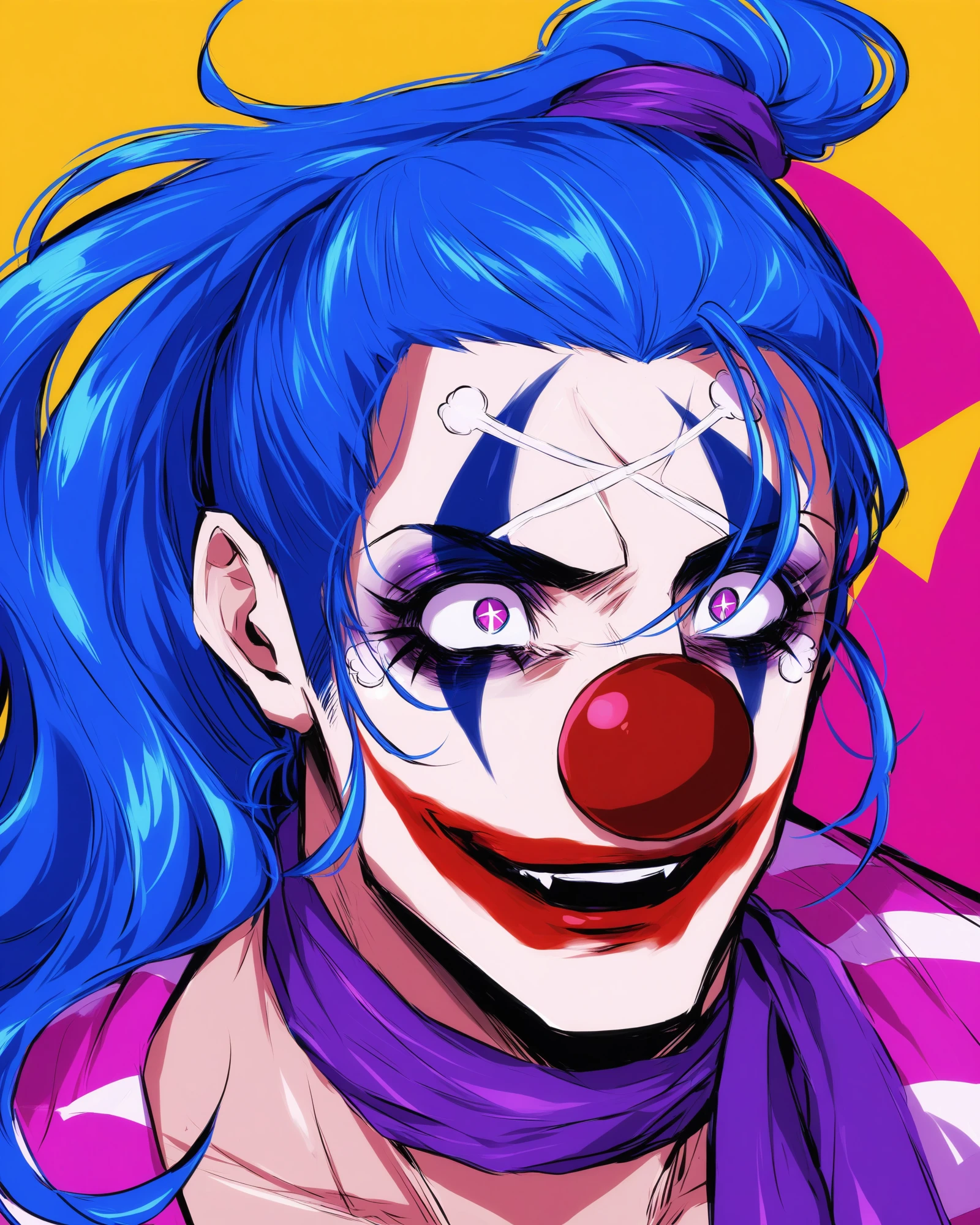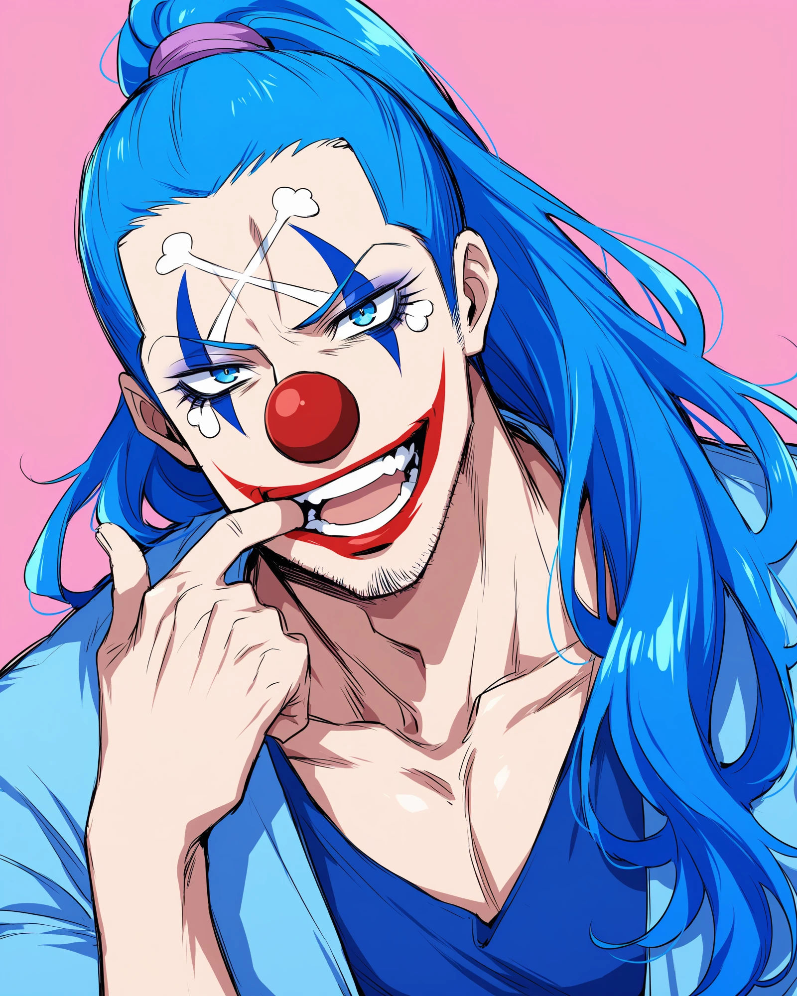 Tags: buggy, red nose, blue hair, makeup, clown, facepaint, smile, blue eyes, facial hair, facial mark, teeth, long hair, stubble, ponytail, gloves