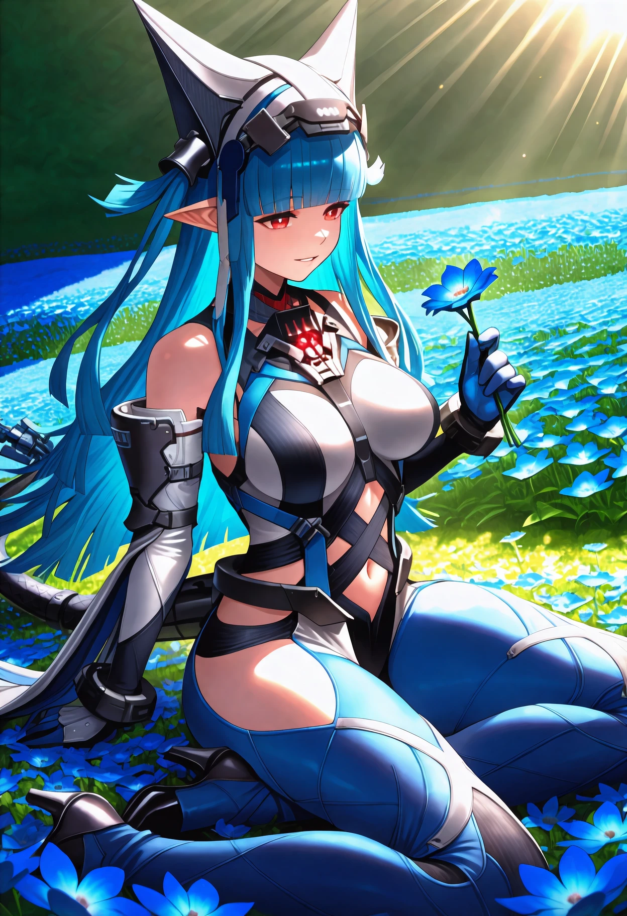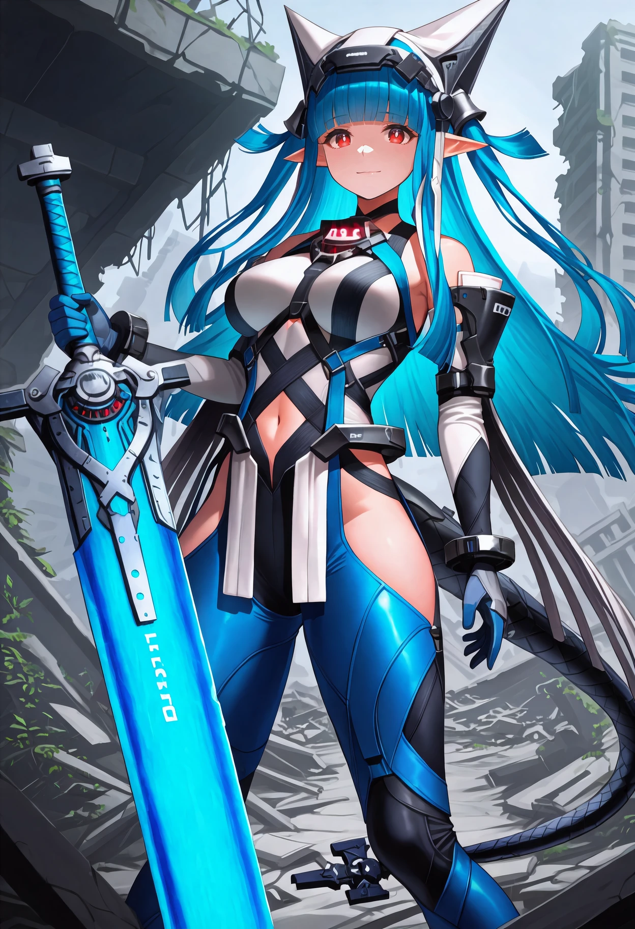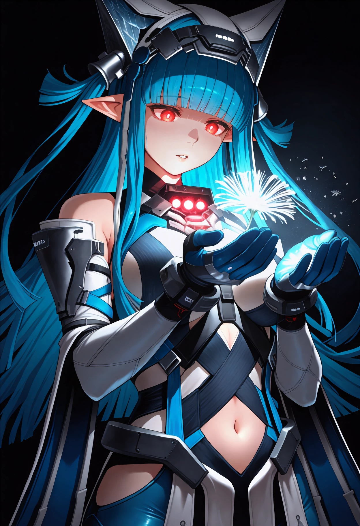 Witch Hour | escoffion, headgear, blue hair, blunt bangs, sidelocks, long hair, two side up, red eyes, pointy ears, sleeveless , clothing cutout, navel cutout, pauldrons, detached sleeves, gloves, thigh cutout, high heels, mechanical tail