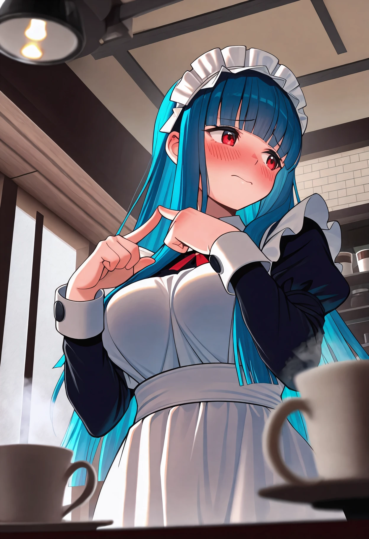 escoffion, headgear, blue hair, blunt bangs, sidelocks, long hair, two side up, red eyes, pointy ears,