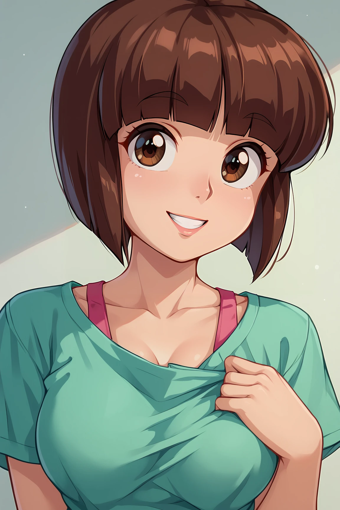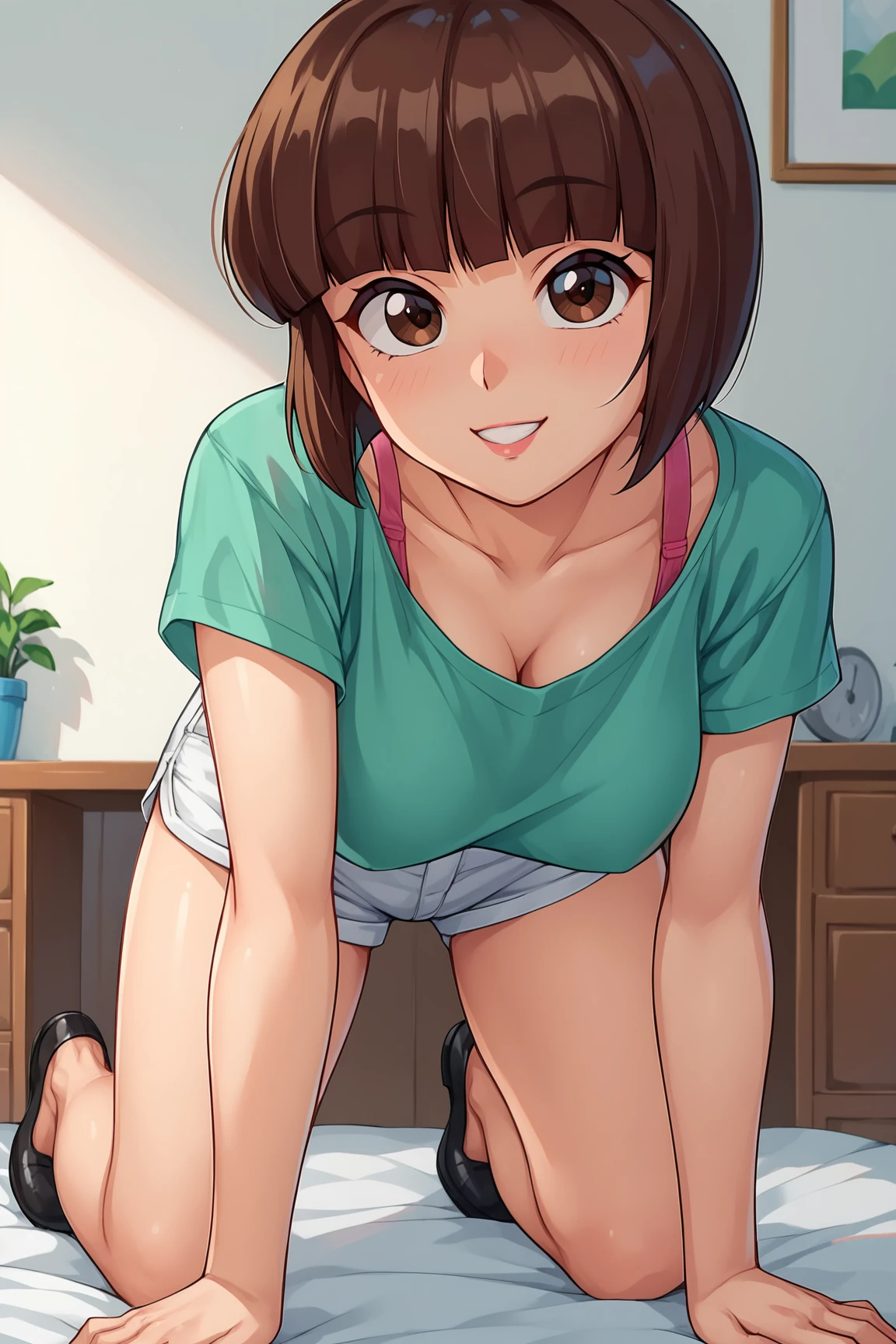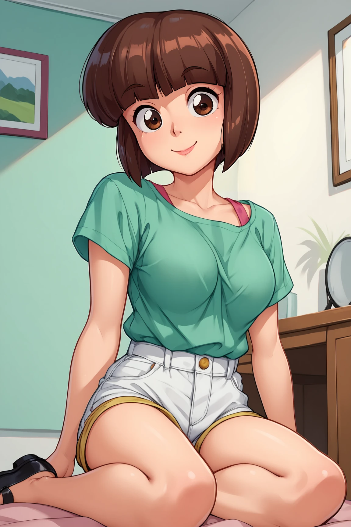NabikiTendoRXLv3, mature female, big eyes, brown eyes, brown hair, short hair, bob cut, blunt bangs, medium breasts, short sleeves, loose shirt, pink strap, green shirt, white shorts, black shoes