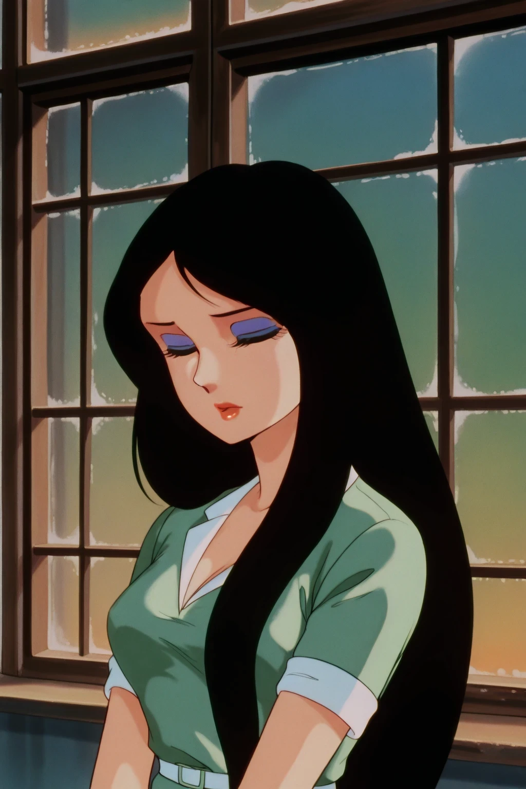 green lipstick, thinking, retro artstyle,