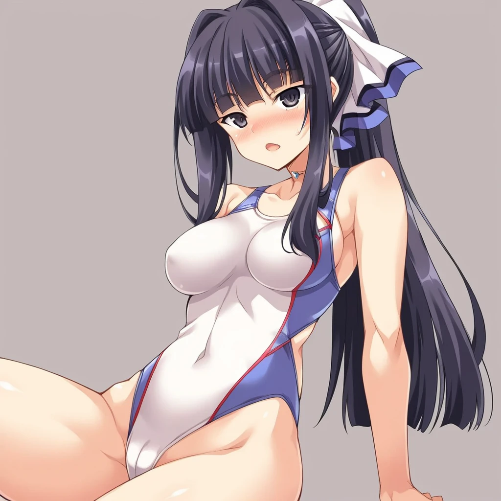 Doumyouji,no hat,1girl,solo,one-piece swimsuit,competition swimsuit,long hair,breasts,ponytail,black hair,black eyes,medium breasts,impossible shirt,gym uniform,blue buruma,