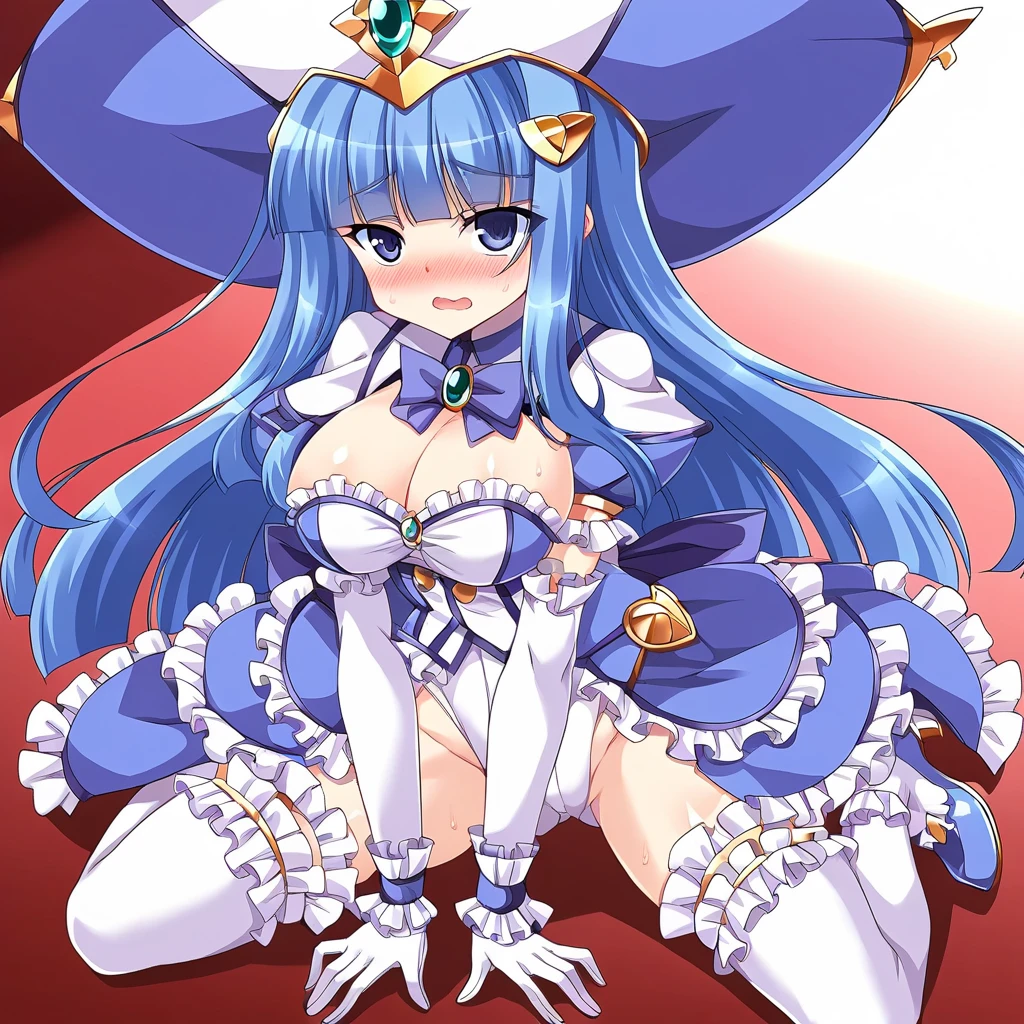 Doumyouji,1girl,solo,gloves,long hair,hat,breasts,blue hair,blue eyes,leotard,elbow gloves,white thighhighs,white gloves,frills,cleavage,very long hair,wrist cuffs,large breasts,magical girl,bangs,blue bow,magical girl,high heels,frilled,frilled thighhighs,skirt,blue footwear,