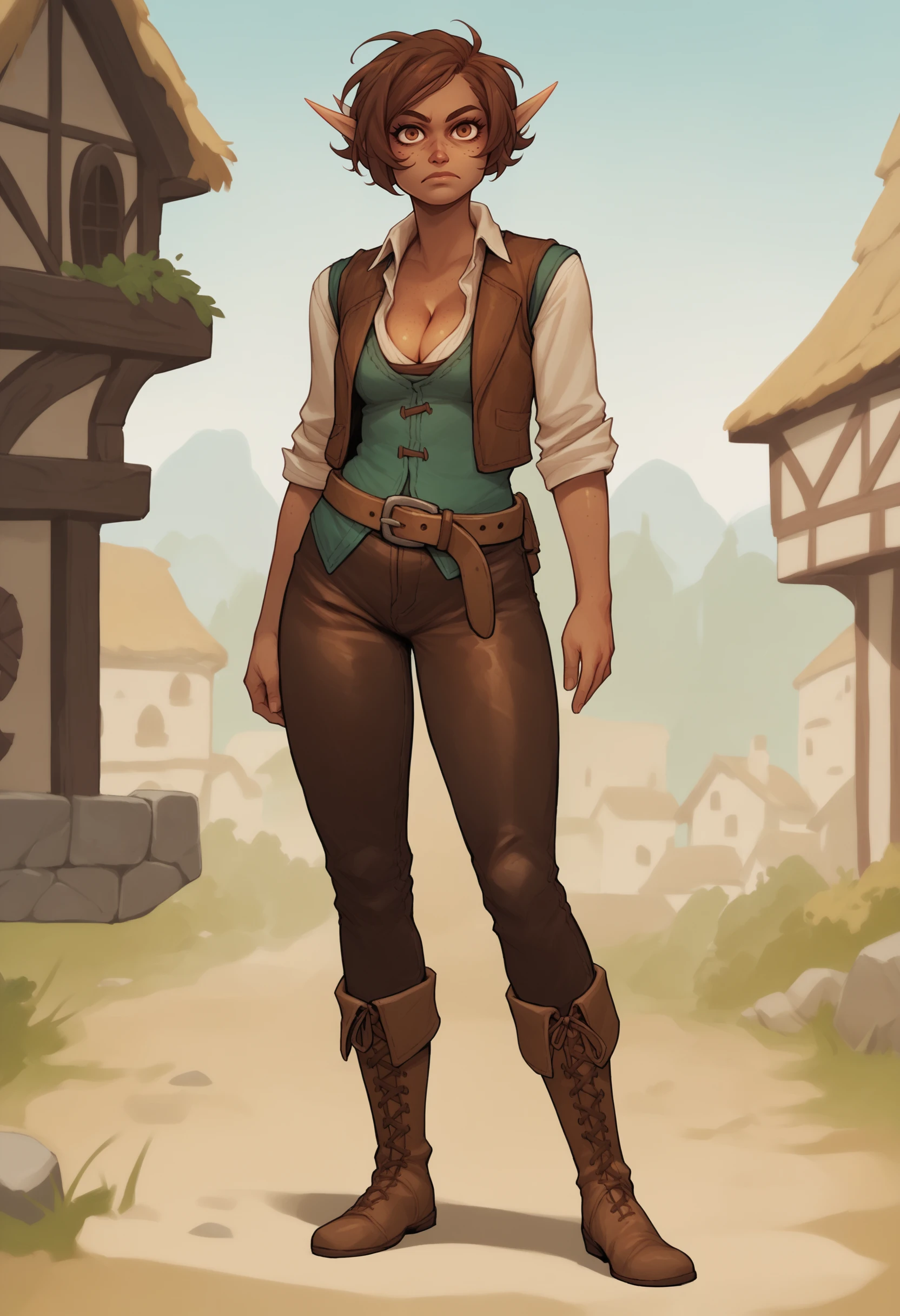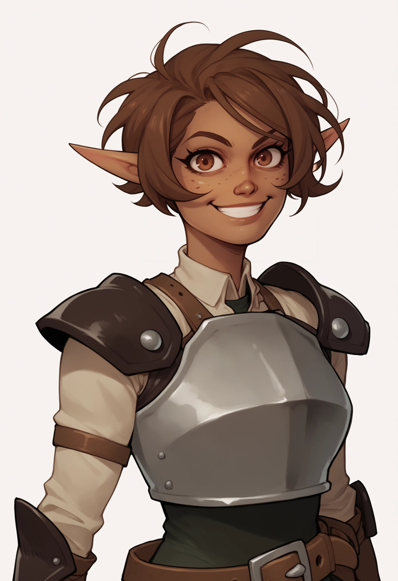 Basic prompts : 1girl, cinder, brown hair, short hair, brown eyes, dark skin, elf, pointy ears, freckles