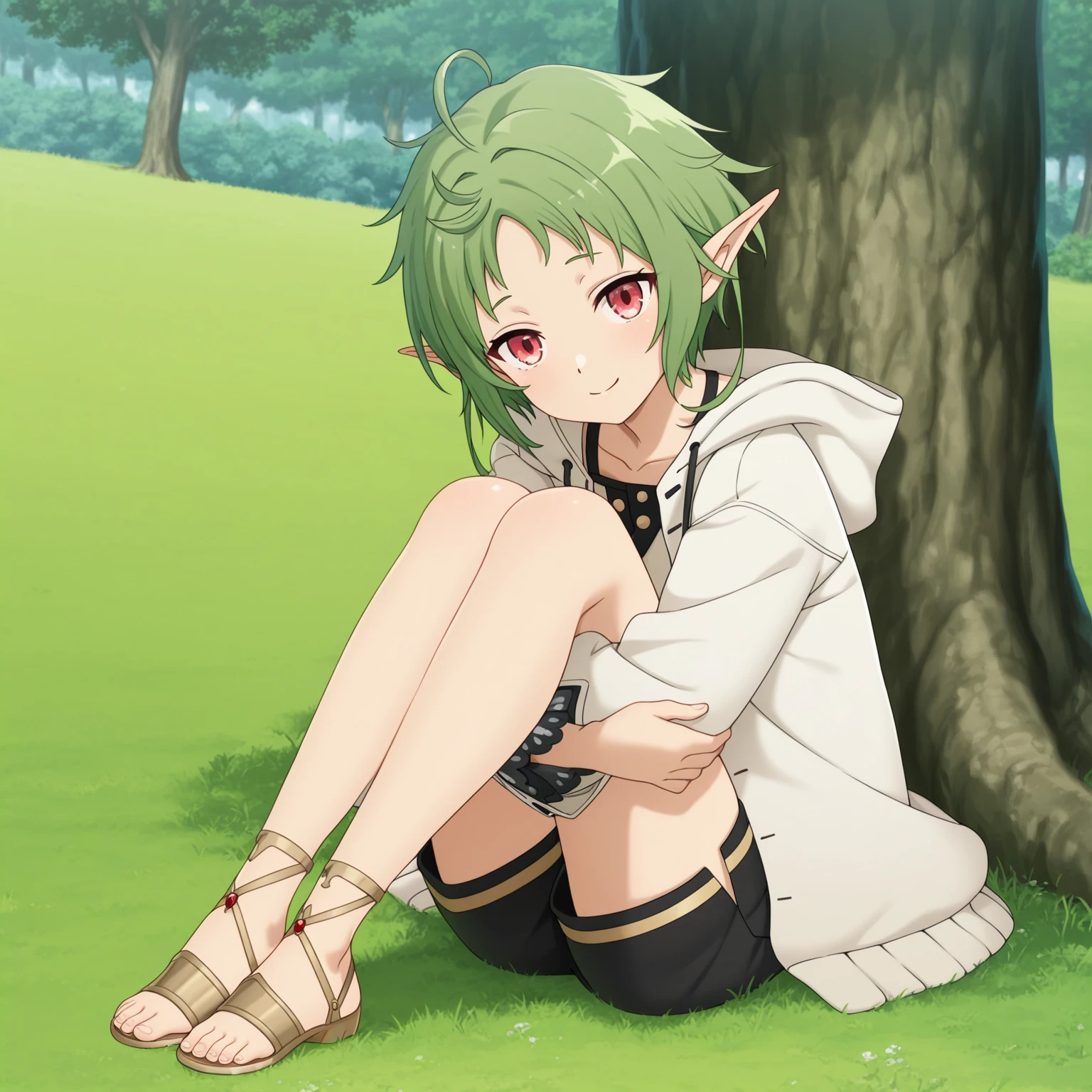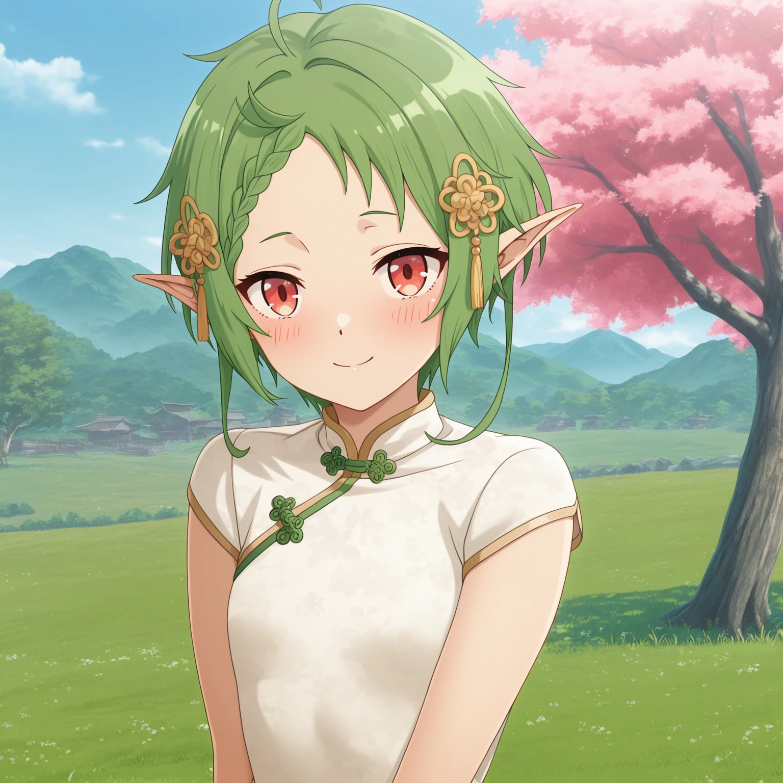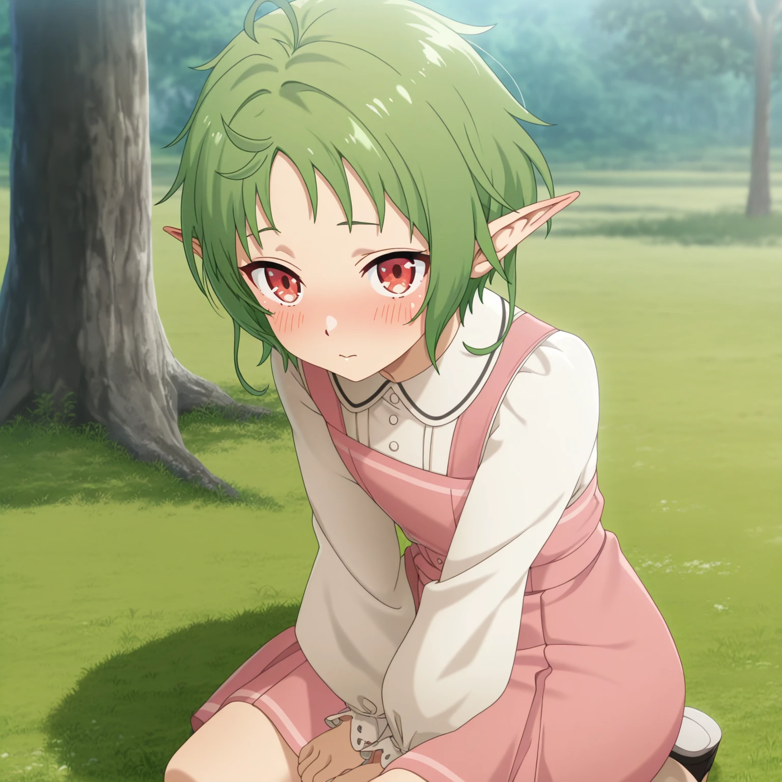 sylphiette, 1girl, red eyes, pointy ears, green hair, short hair,
