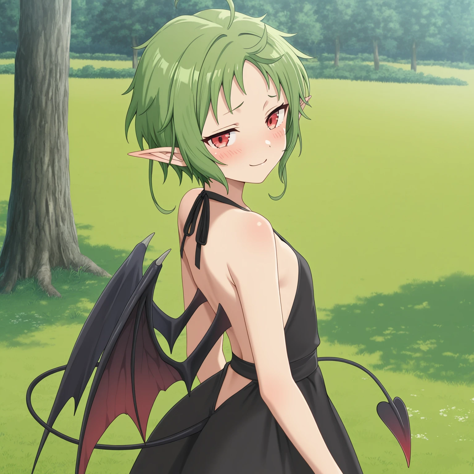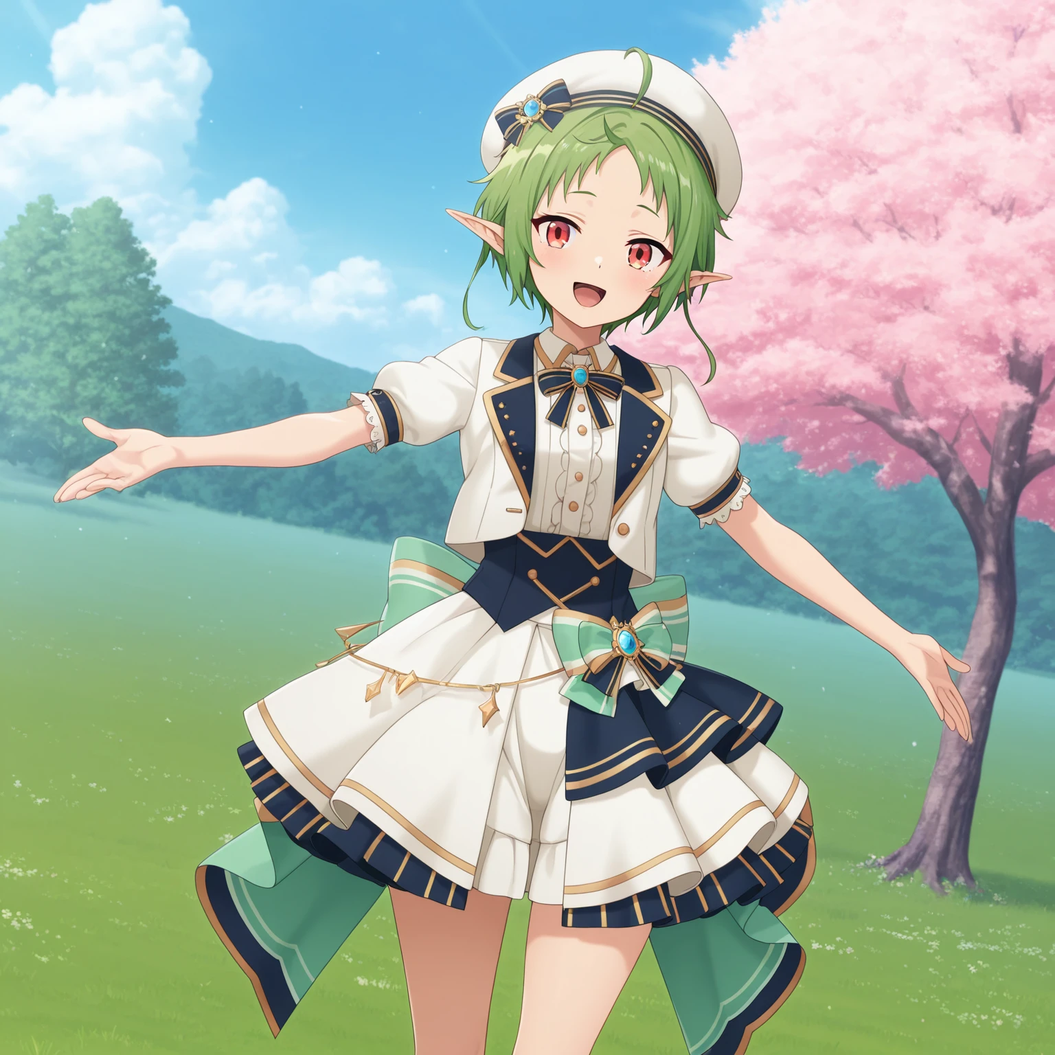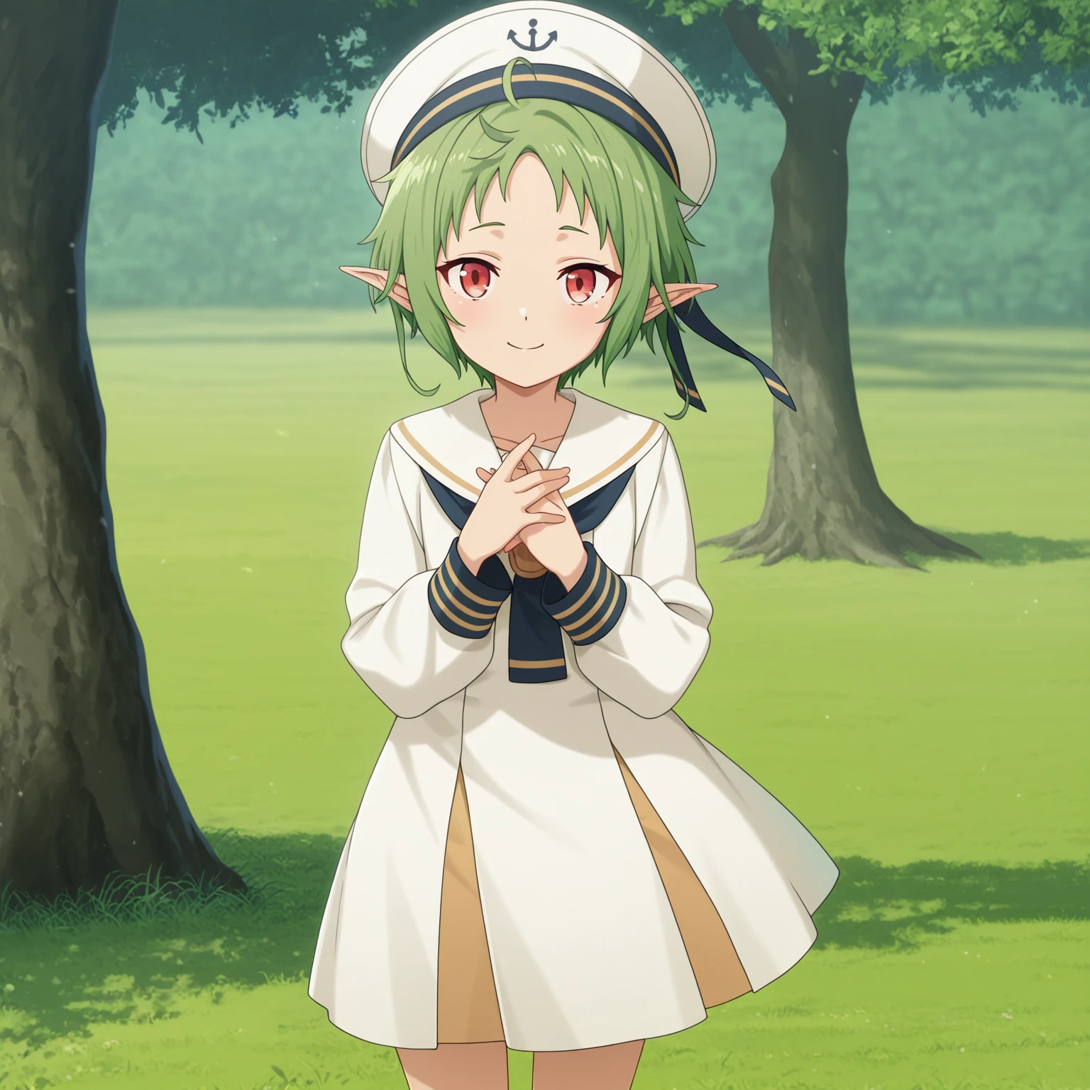 sylphiette, 1girl, red eyes, pointy ears, green hair, short hair,