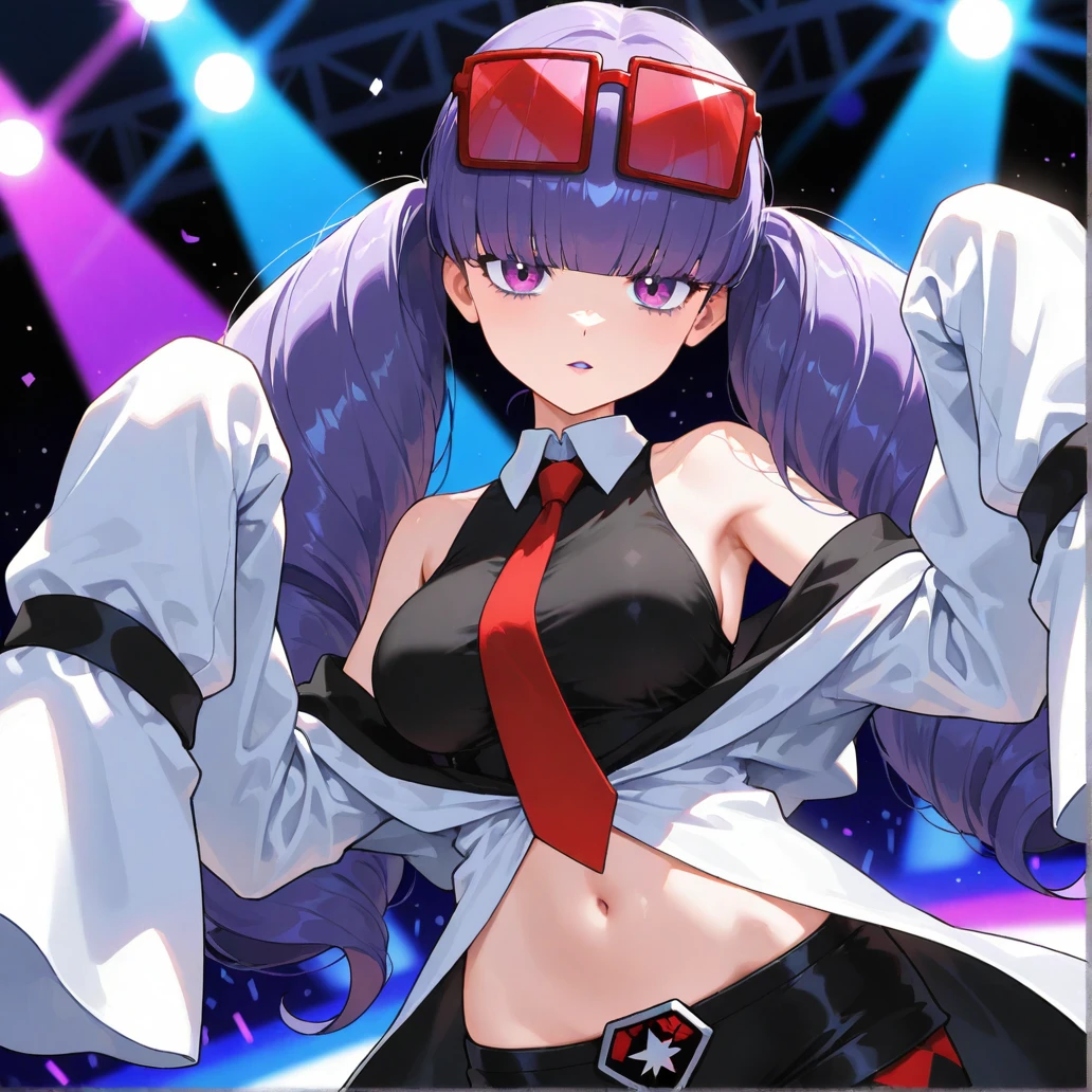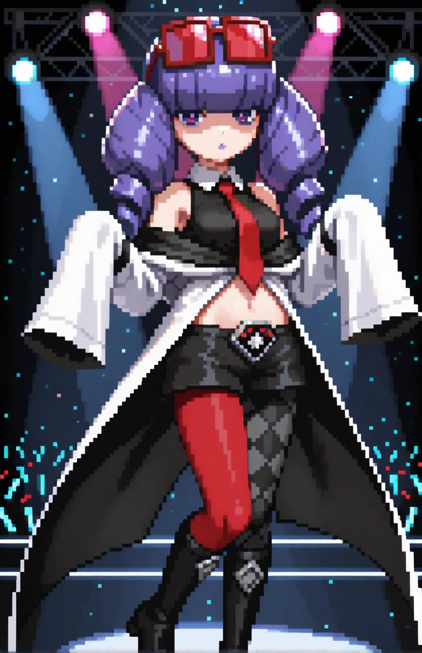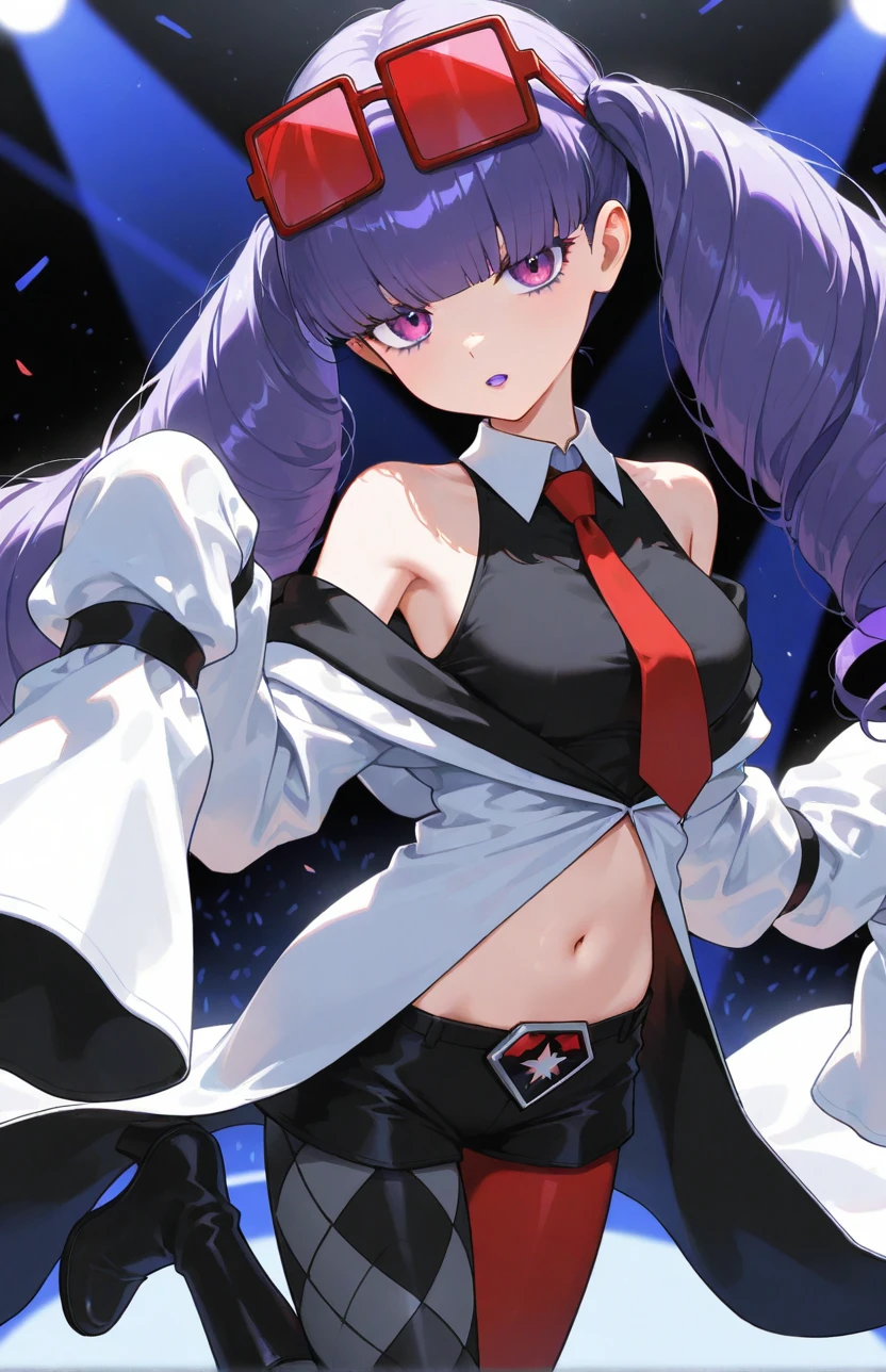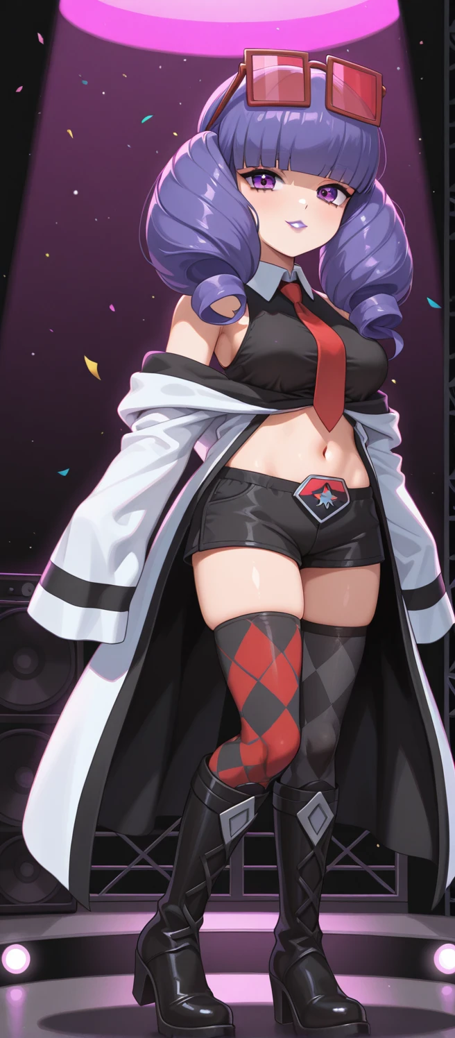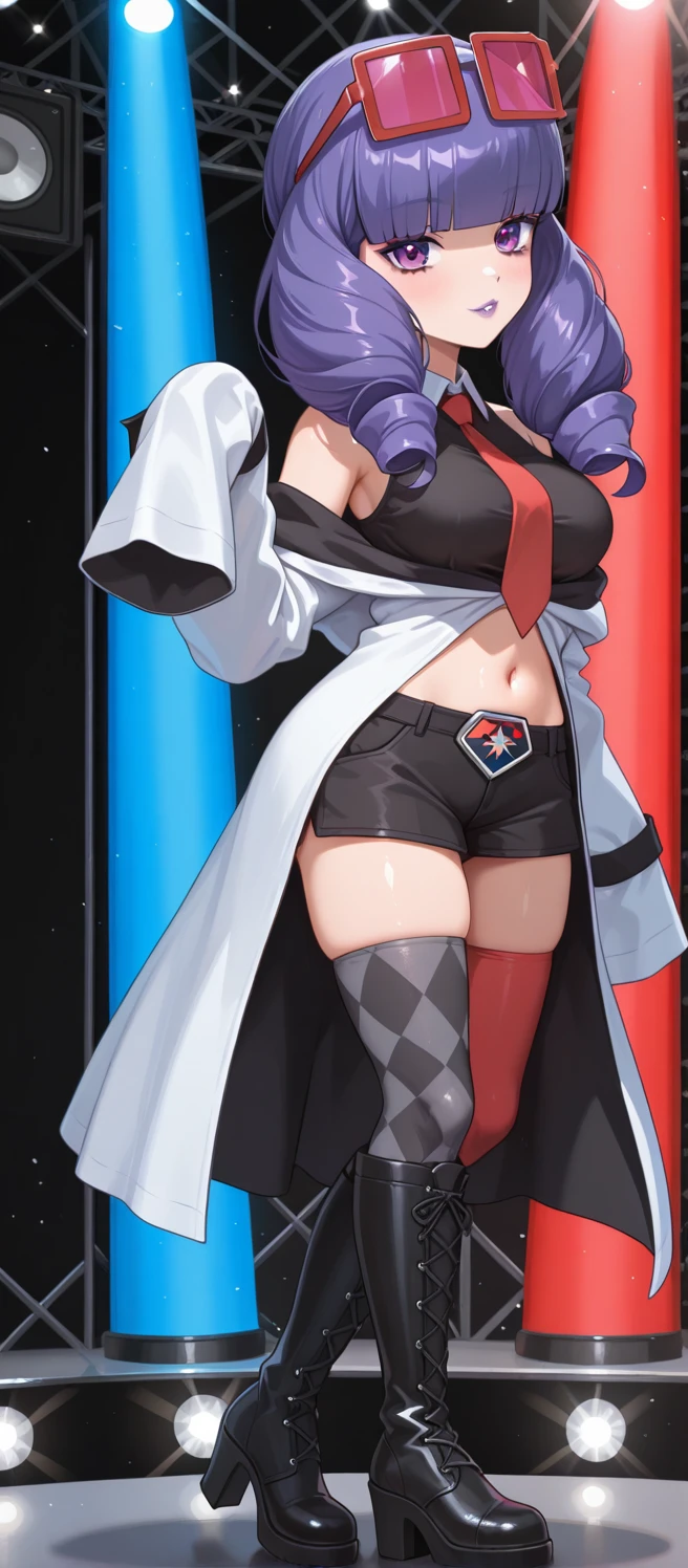 pmrachel, rachel \(pokemon\), purple hair, blunt bangs, twin drills, purple eyes, purple lips, purple eyeshadow, eyewear on head, red tinted eyewear, black shirt, sleeveless shirt, collared shirt, red necktie, off-shoulder coat, bare shoulders, white coat, sleevees past fingers, midriff, black shorts, short shorts, mismatched legwear, argyle legwear, pantyhose, knee boots, high heel boots, black footwear