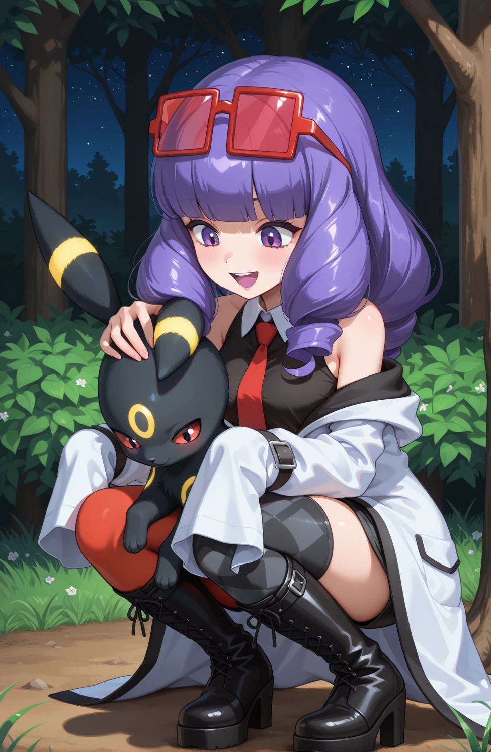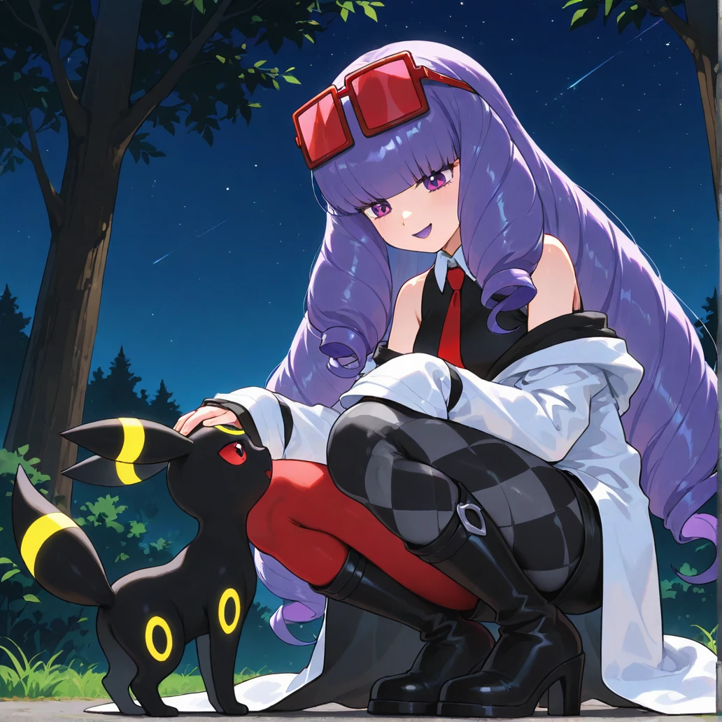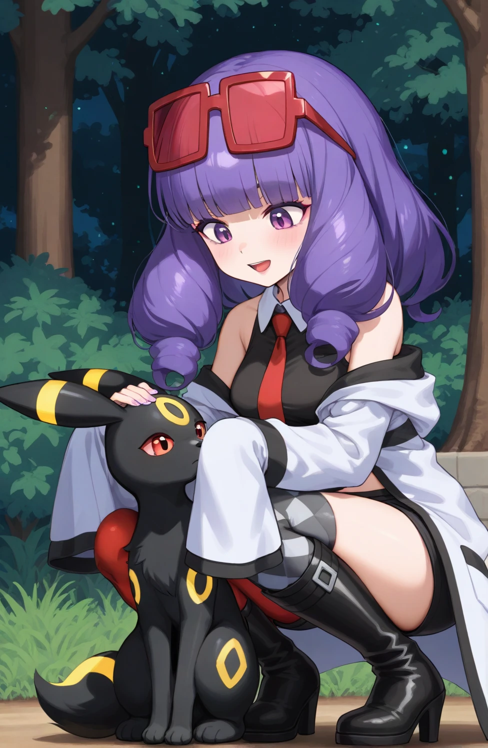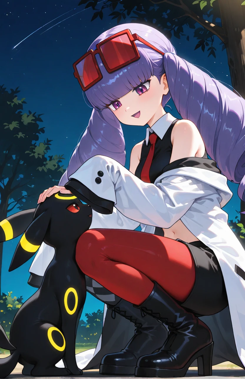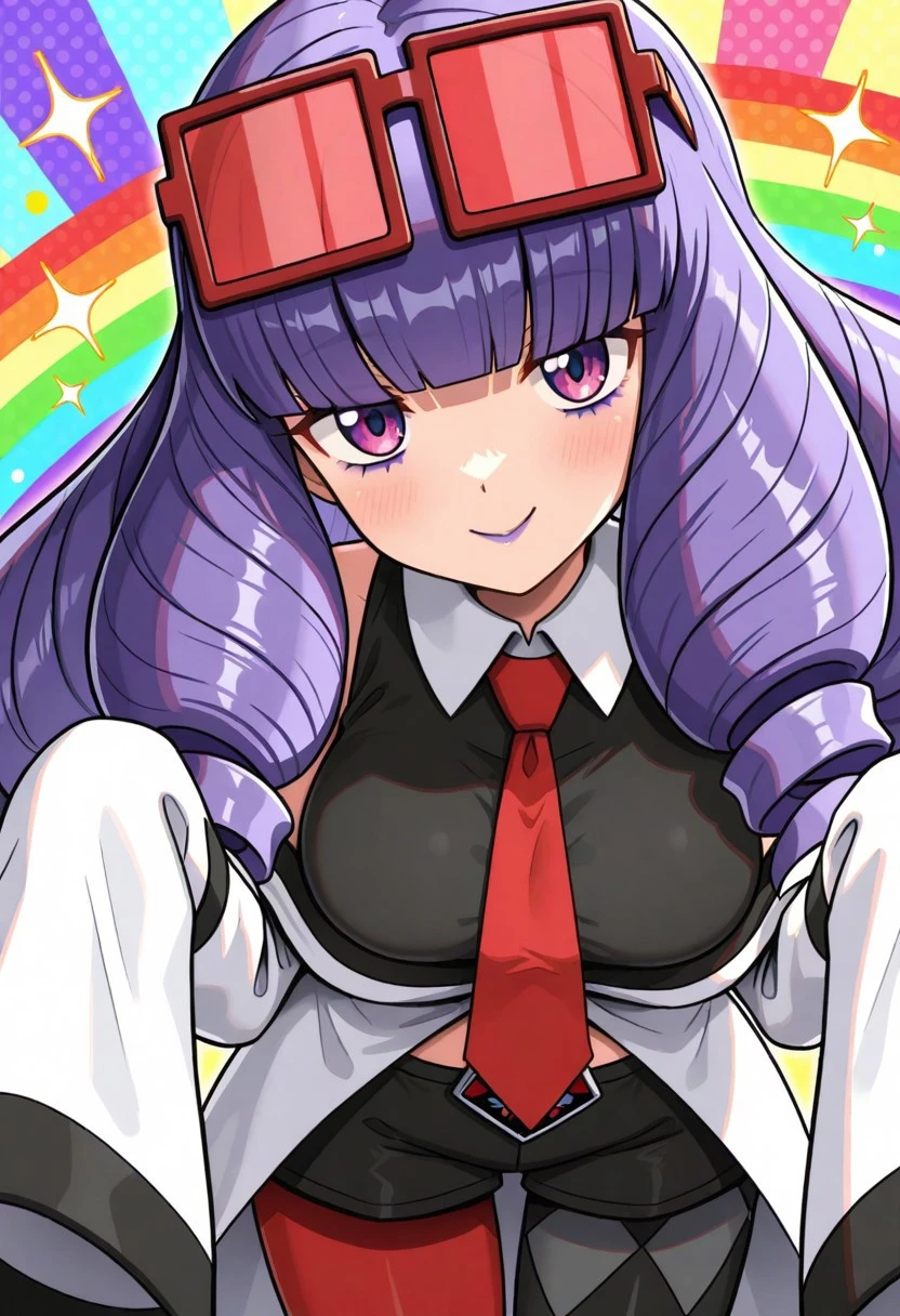 pmrachel, rachel \(pokemon\), purple hair, blunt bangs, twin drills, purple eyes, purple lips, purple eyeshadow, eyewear on head, red tinted eyewear, black shirt, sleeveless shirt, collared shirt, red necktie, off-shoulder coat, bare shoulders, white coat, sleevees past fingers, midriff, black shorts, short shorts, mismatched legwear, argyle legwear, pantyhose, knee boots, high heel boots, black footwear