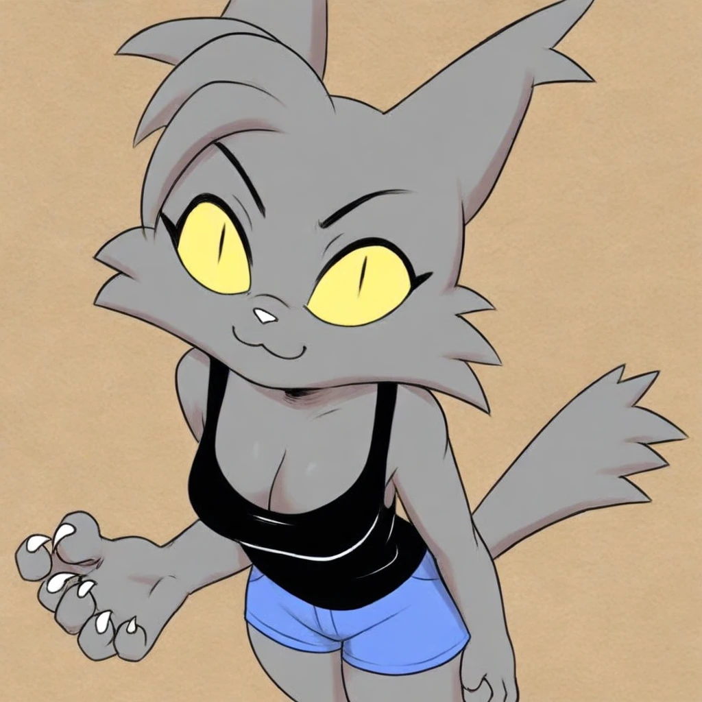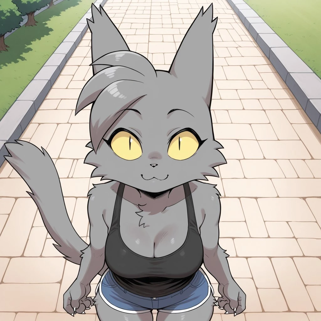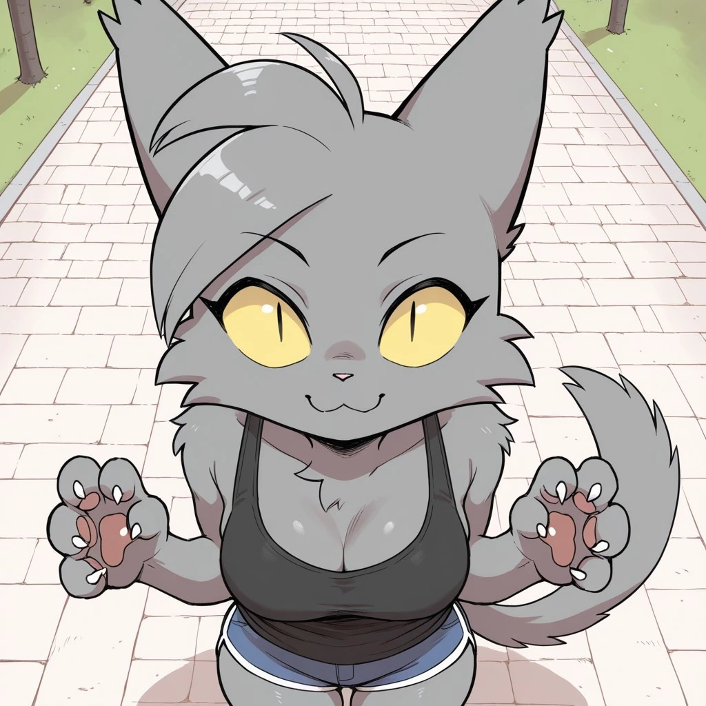cat, cat girl, grey fur, black eyes, slit pupils, black nose, ahoge, cat ears, cat tail, claws, medium breasts,