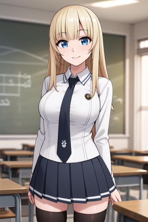 maria fianna albert, maria, ore dake haireru, bangs, blonde_hair, blue_eyes,breasts, long_hair,cowboy_shot, dress, armor,skirt,thighhighs, white_dress, white_gloves, black_legwear,