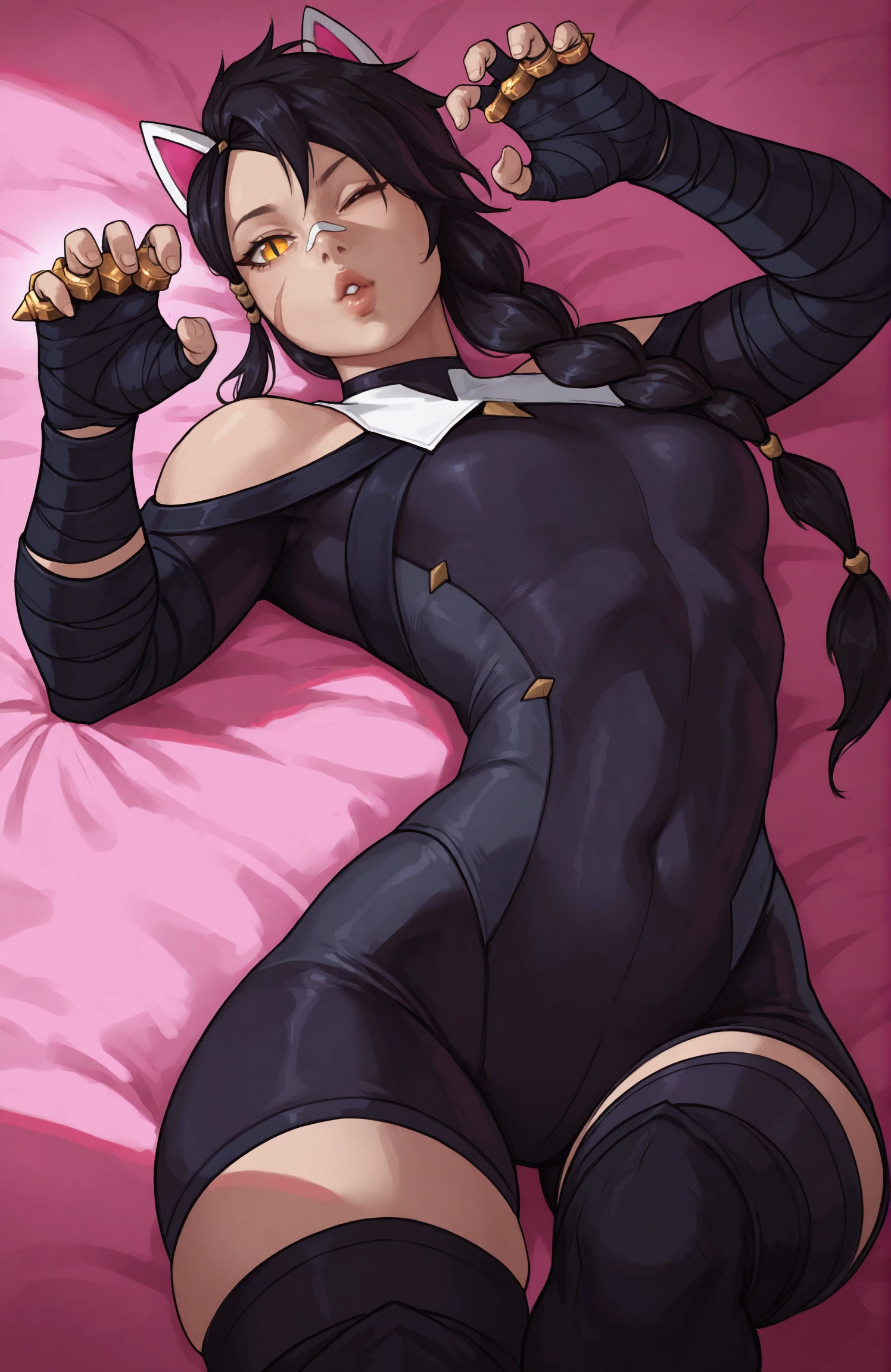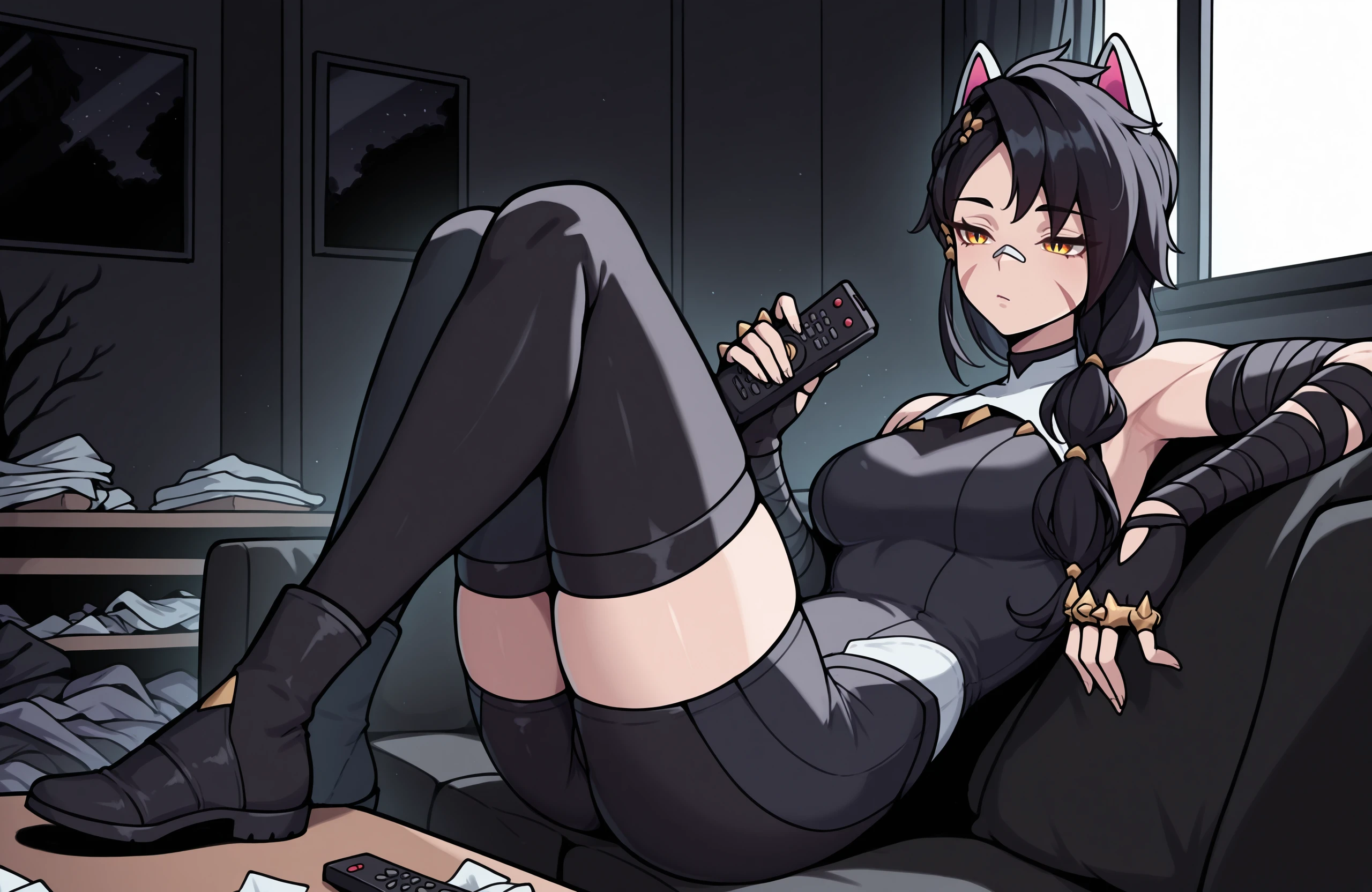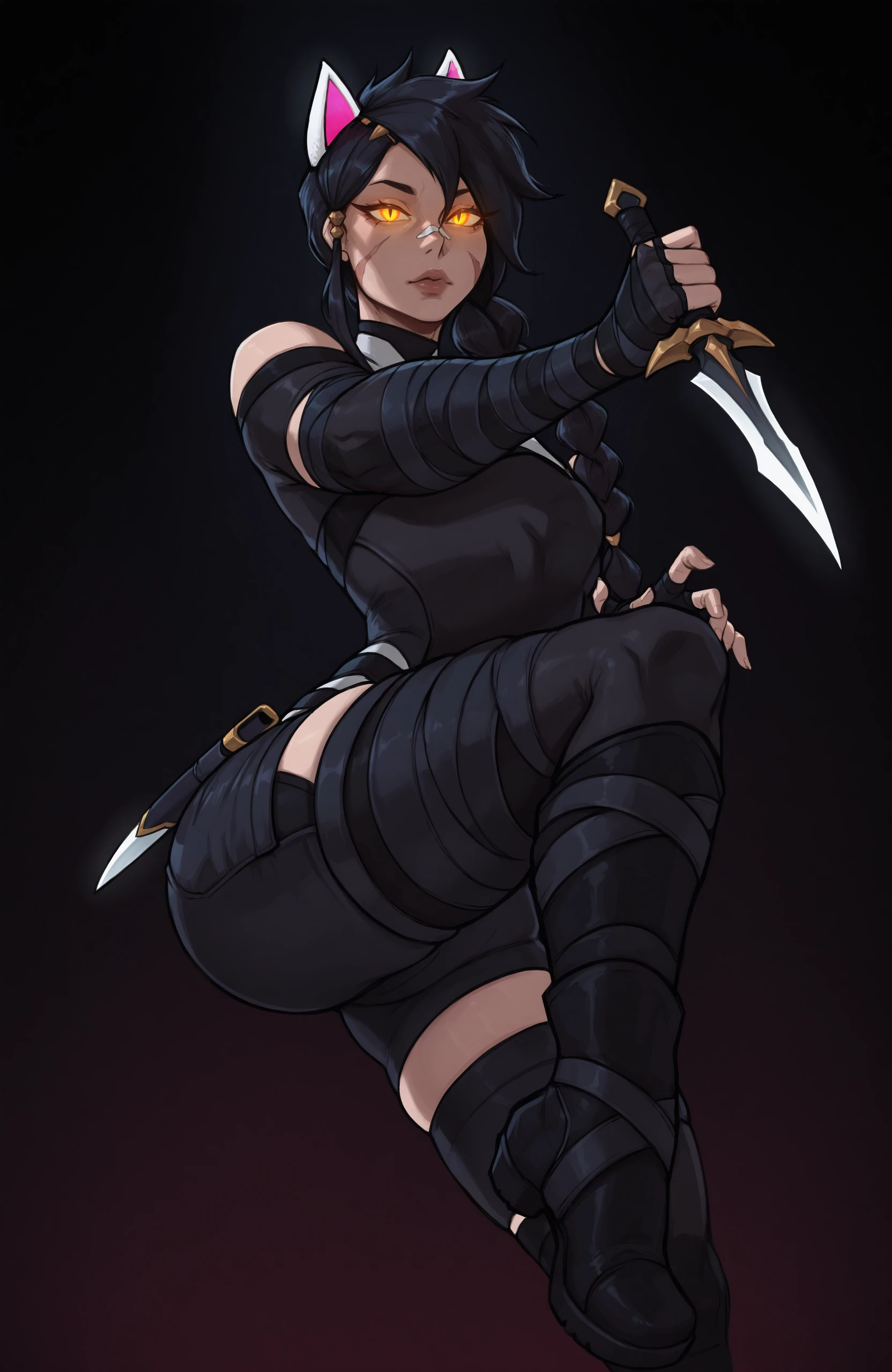 Prompt for character and outfit: erisafn, 1girl, solo, slit pupils, yellow eyes, scar on face, long hair, bandaid on nose, single braid, black hair, white animal ears, fingerless gloves, brass knuckles, black bandages, black bodysuit, shorts, bare shoulders, thighhighs, black boots