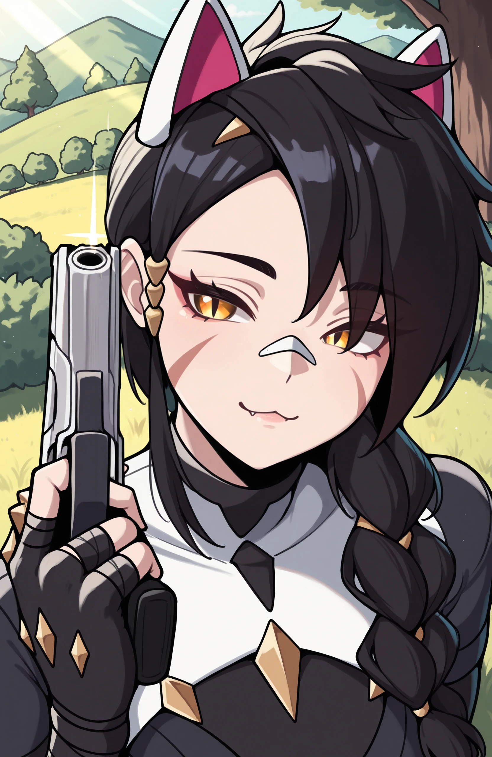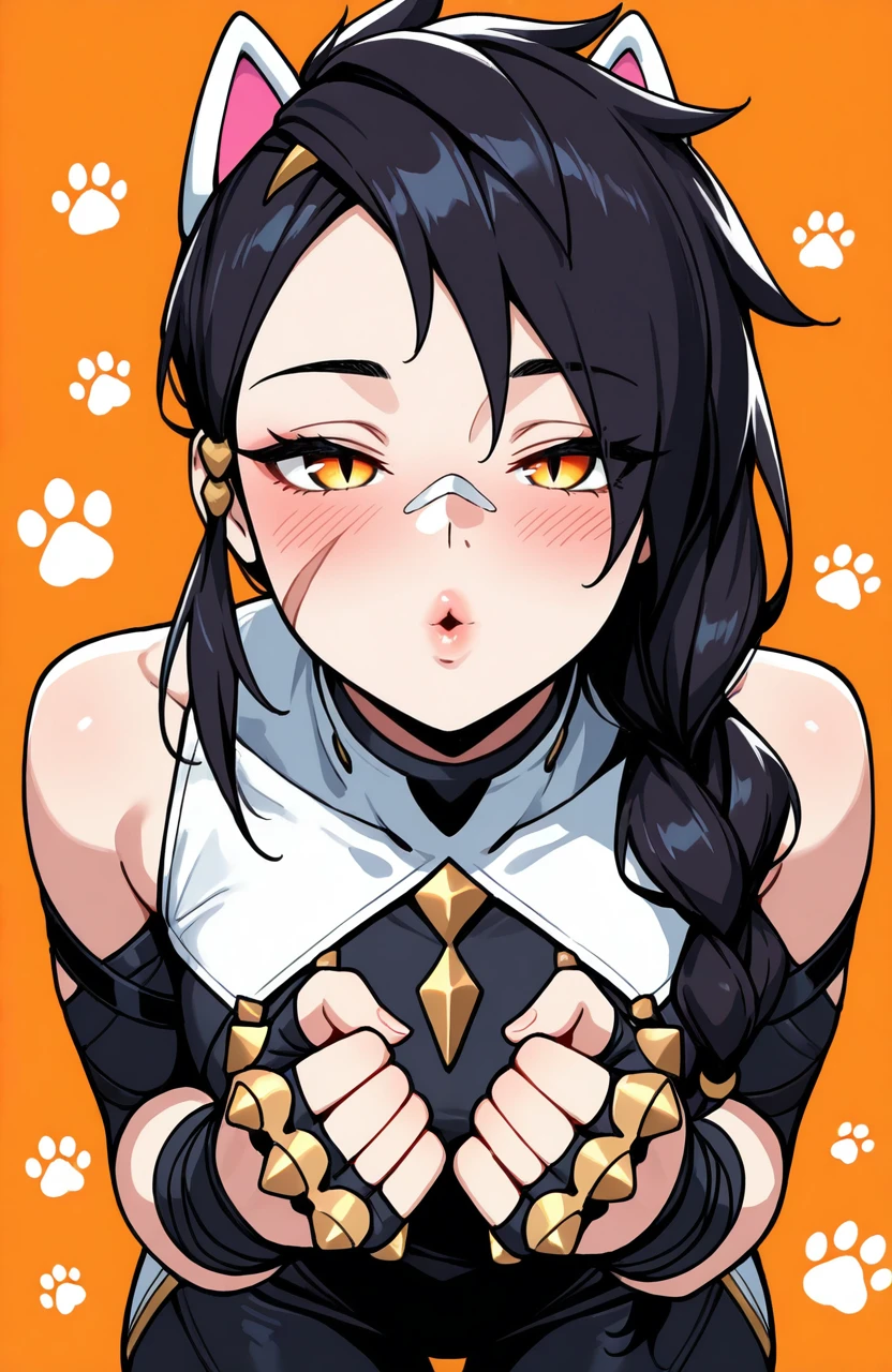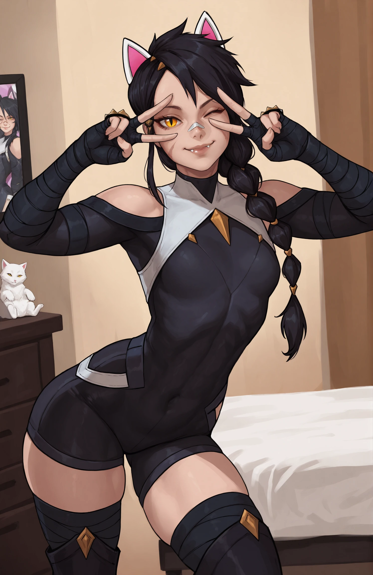 Prompt for character and outfit: erisafn, 1girl, solo, slit pupils, yellow eyes, scar on face, long hair, bandaid on nose, single braid, black hair, white animal ears, fingerless gloves, brass knuckles, black bandages, black bodysuit, shorts, bare shoulders, thighhighs, black boots