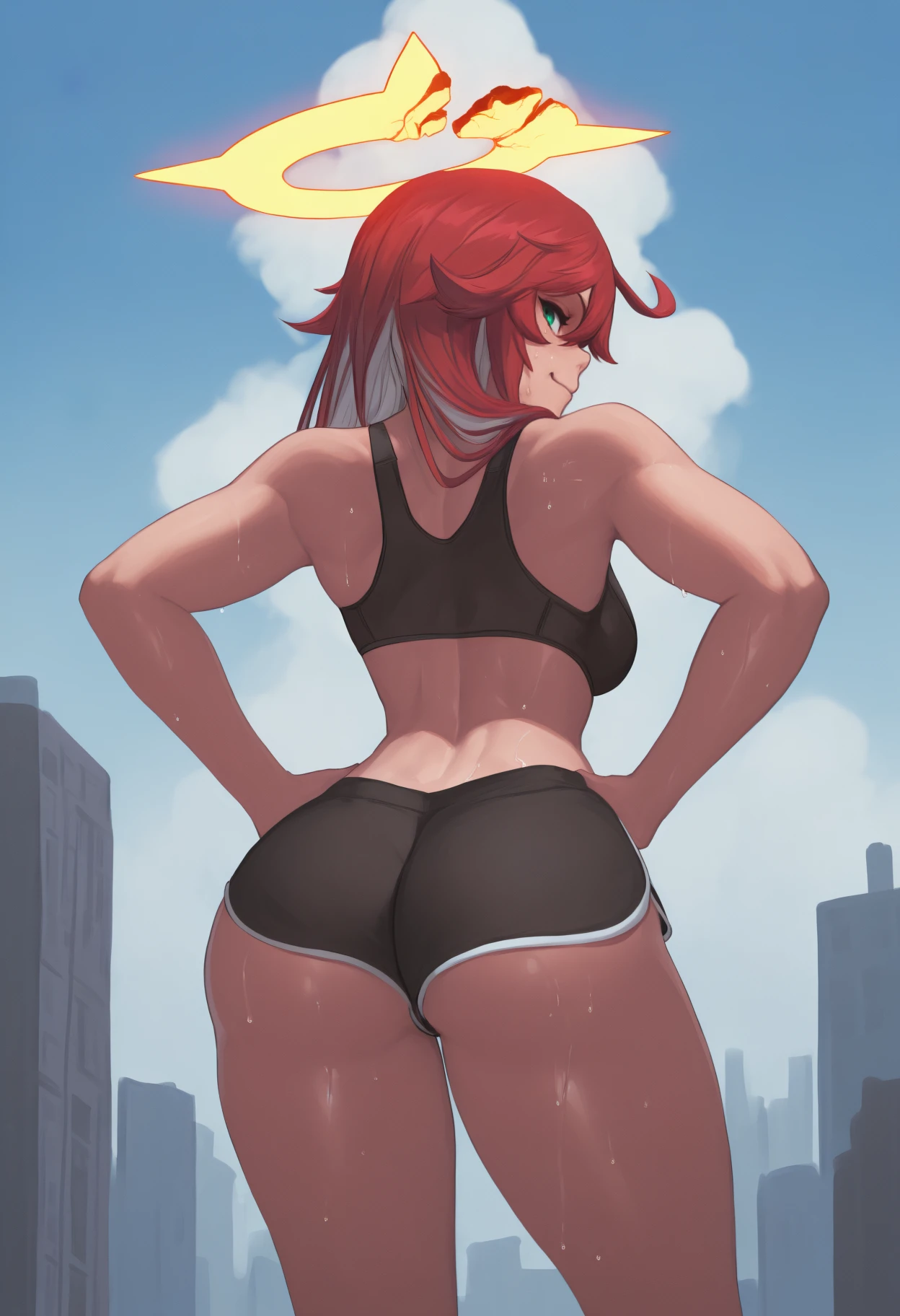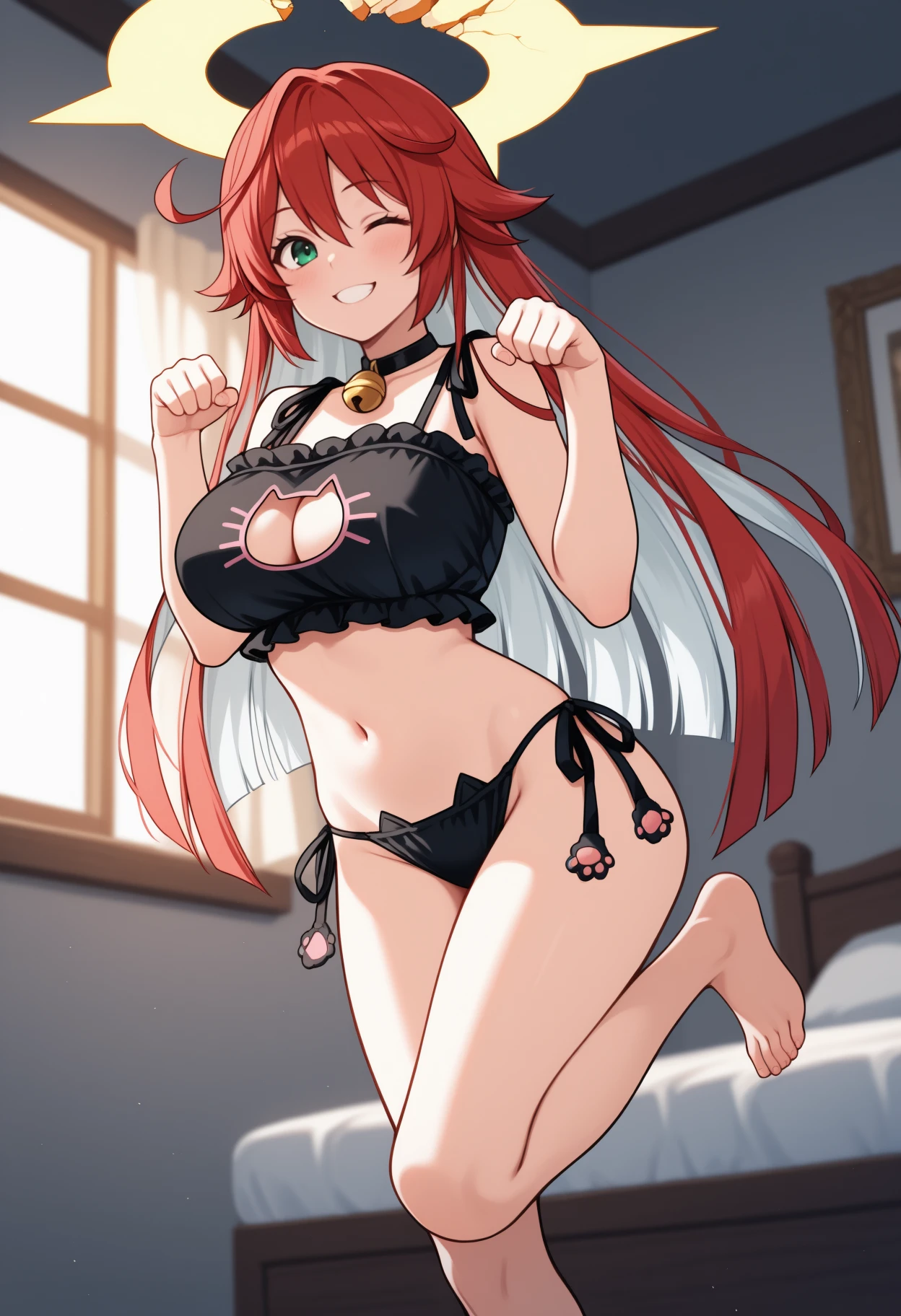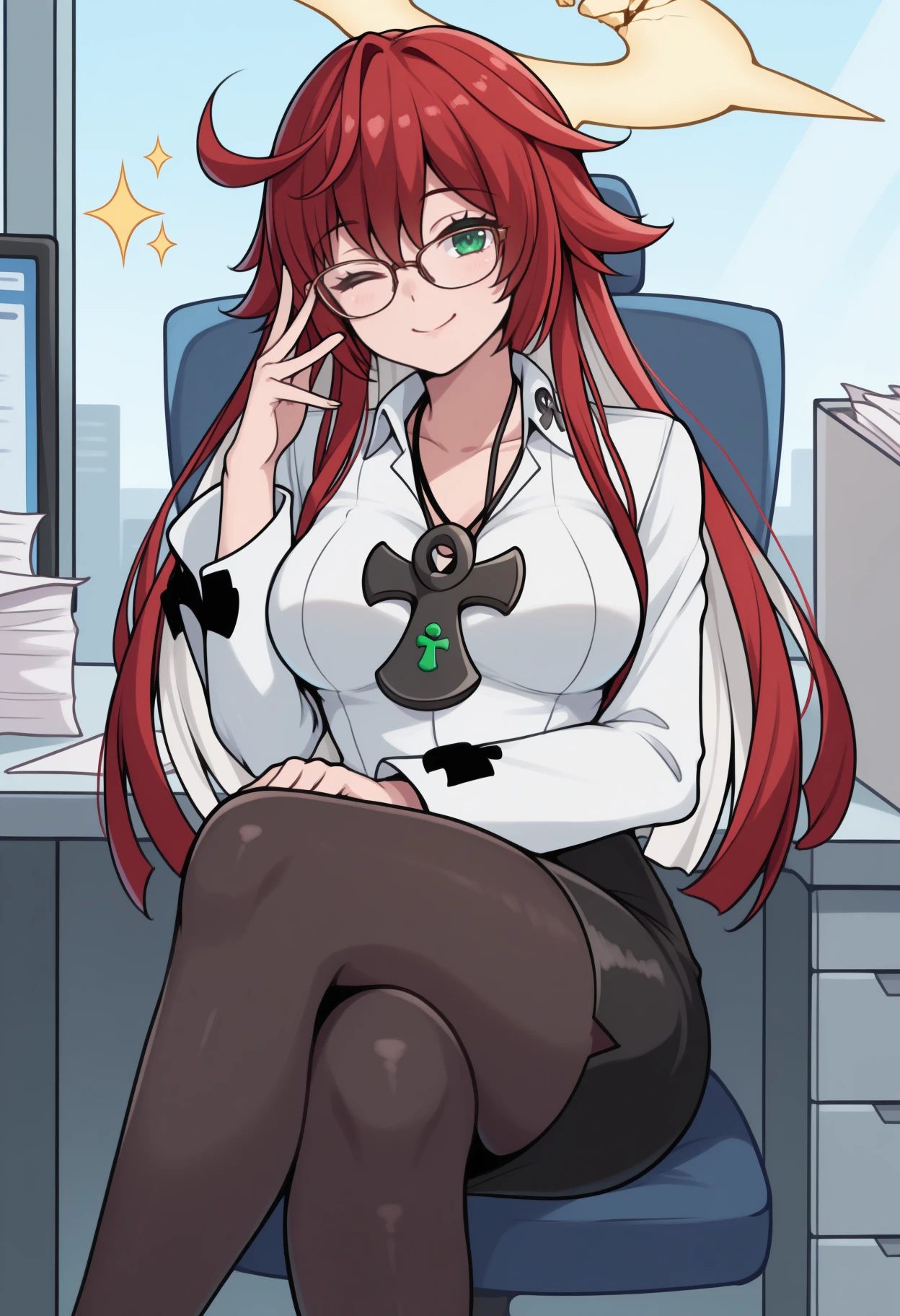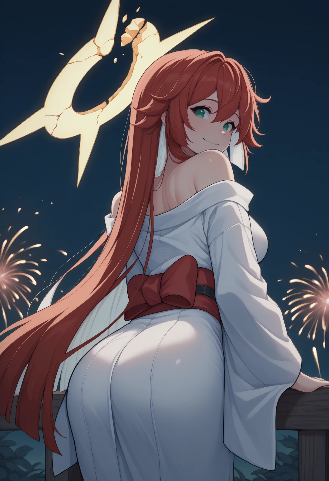 Trigger + Appearance: strivejkvtn, long hair, colored inner hair, red hair, white hair, hair between eyes, blunt ends, compass rose halo, broken halo, green eyes