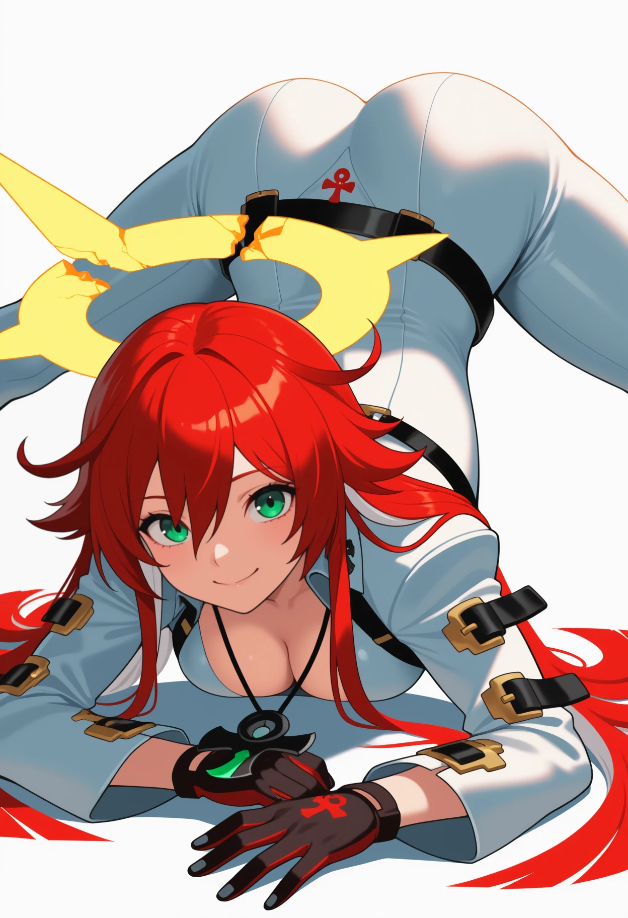Default Outfit: white bodysuit, ankh, center opening, plunging neckline, shoulder belt, long sleeves, studded belt, two-tone gloves, black gloves, red gloves, necklace, cleavage