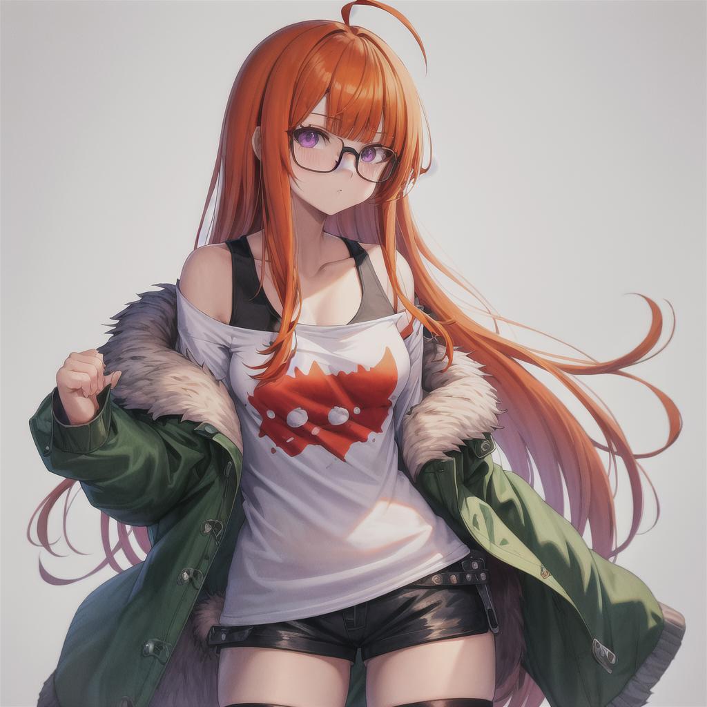 'Futaba Sakura [Persona], green jacket off shoulder, white shirt, fur trim, shorts, belt' - Example prompt for her normal jacket oufit.