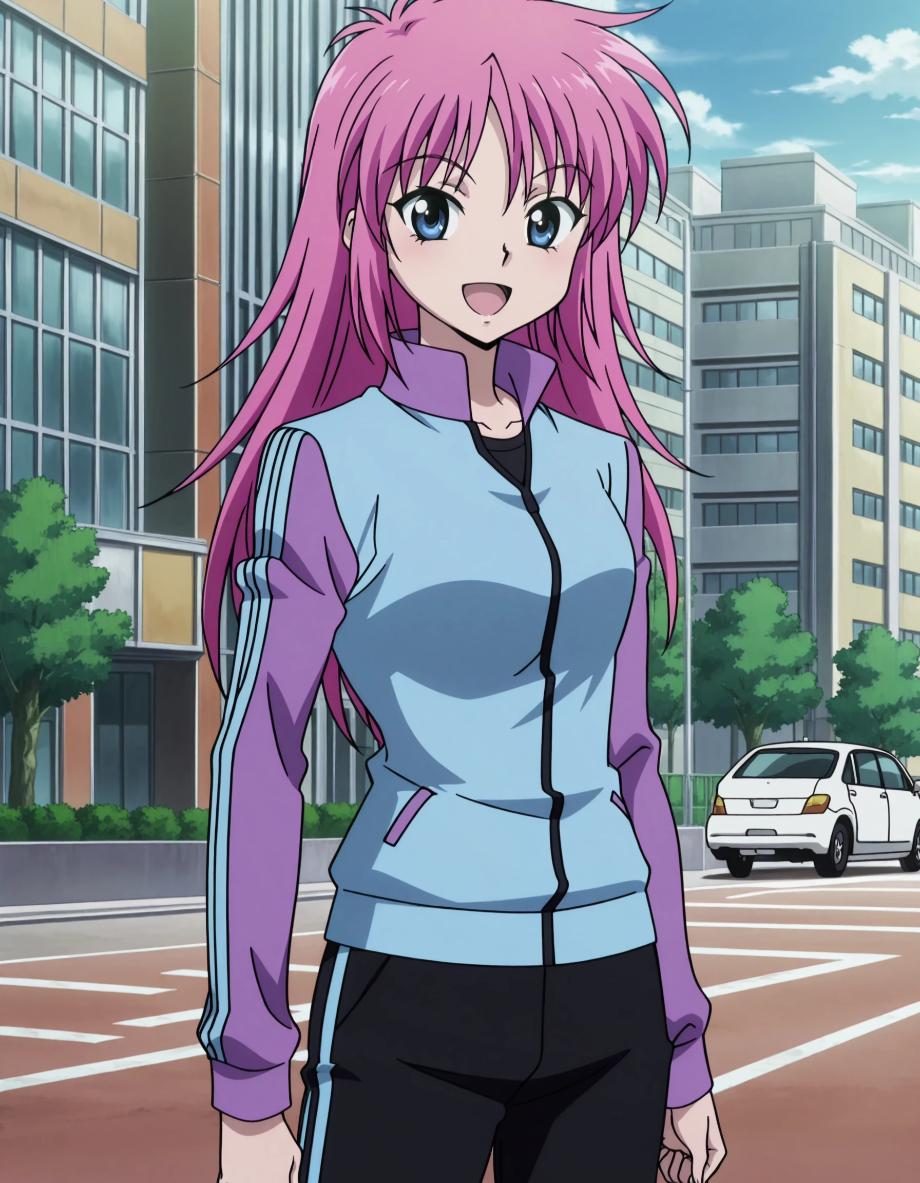 1girl, pink hair, blue eyes