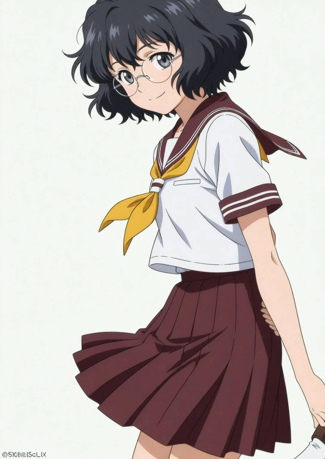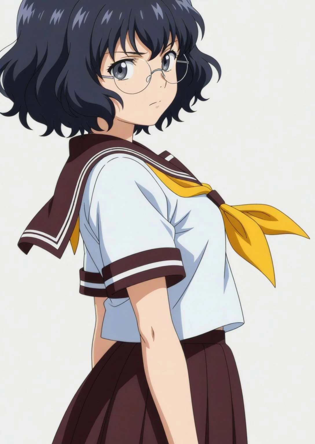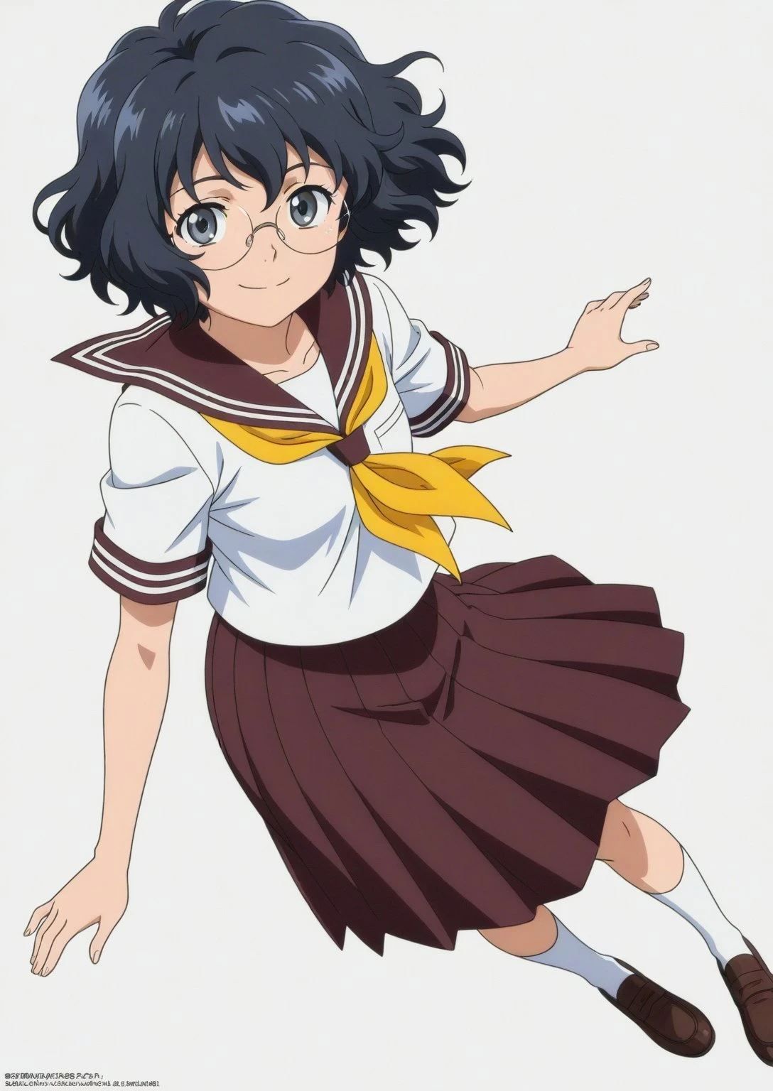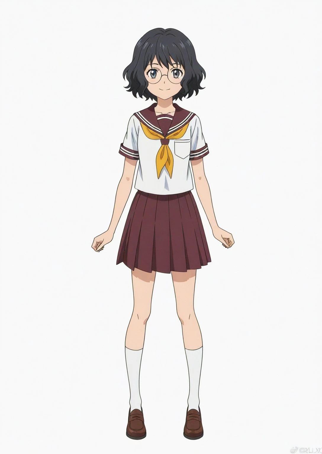 Outfit: nanase-school, school uniform, skirt, sailor collar, serafuku, pleated skirt, neckerchief, yellow neckerchief, brown skirt, shirt short sleeves, brown sailor collar, white shirt, socks, shoes, loafers
