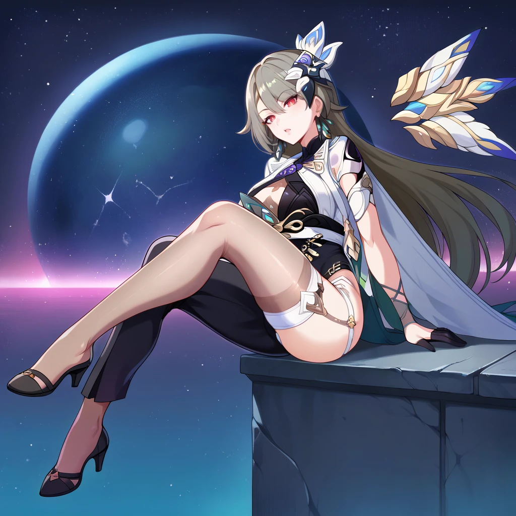 Vi_Def, single leg bodysuit, single pantsleg, black pants, white panties, single thighhigh, brown thighhighs, cleavage, asymmetrical legwear, x thigh strap, single garter strap, black bodysuit, high-waist skirt, half-skirt, black skirt, underbust, peacock feathers, hair ornament, earrings, two-tone cape, white cape, green cape, jewelry, shrug (clothing), white shrug, white sleeves, short sleeves, layered sleeve, black sleeves, long sleeves, asymmetrical sleeves, white armband, black glove, single half glove, wristband, cleavage cutout, asymmetrical clothes,Optional: Add "black footwear, high heels" for her shoes. It's incorrect in V1, so I had to fix it in V2.