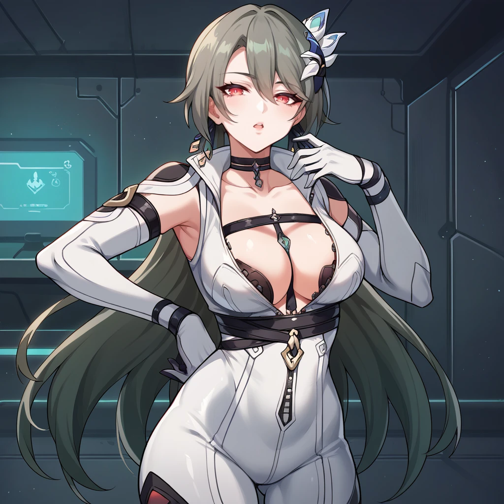Vi_Pg, hair ornament, white bodysuit, alt bodysuit, sleeveless bodysuit, plug suit, alternate underbust, open bodysuit, chest strap, between breasts, partially unzipped, cleavage, black choker, zipper, restraints, arm strap, leg strap, alt detached sleeves, covered shoulders, high collar, different long sleeves, white sleeves, white gloves, black trim, high heel boots, white footwear,Sa