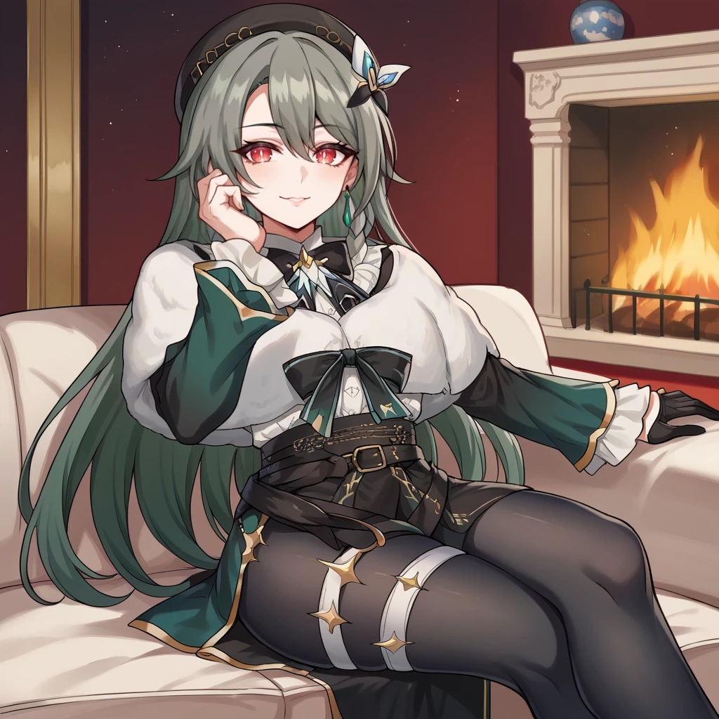 Vi_Xm, black headwear, beret, braid, hair ribbon, alt earrings, jewelry, black bow, big bow, black bowtie, black corset, gold trim, gradient skirt, black skirt, green skirt, layered skirt, frilled skirt, side slit, black belt, buckle, black pantyhose, alt pantyhose, white thigh strap, fur capelet, frilled shirt, white shirt, gradient sleeves, alternate long sleeves, alternative black sleeves, star (symbol), green sleeves, frilled sleeves, alternate black gloves,Bodysuit Outfit: