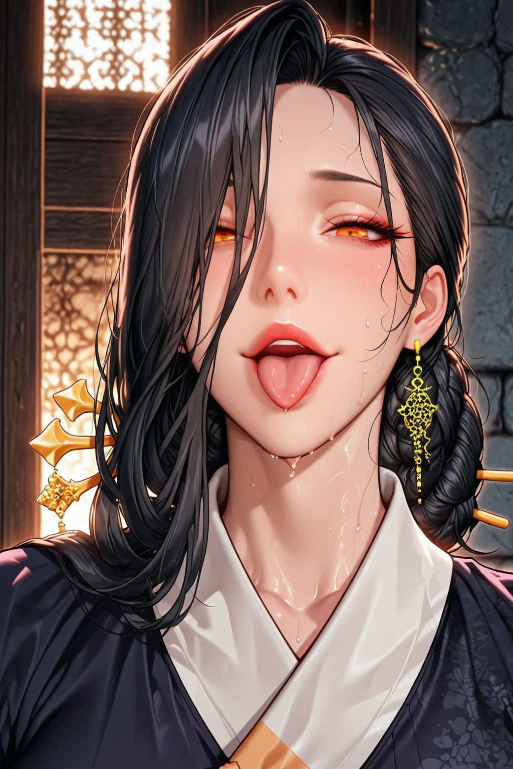 1girl, solo, jiwok, tucked hair, tucked hair, updo, low bun, hair gathered at nape, side parted hair, long side bangs, black hair, slightly wavy hair, long bangs, parted bangs, hair over one eye, golden hairpin, hair strands, hair strands over eyes, long eyelashes, orange eyes, red_lips, golden earrings, hair ornament, red lipstick,