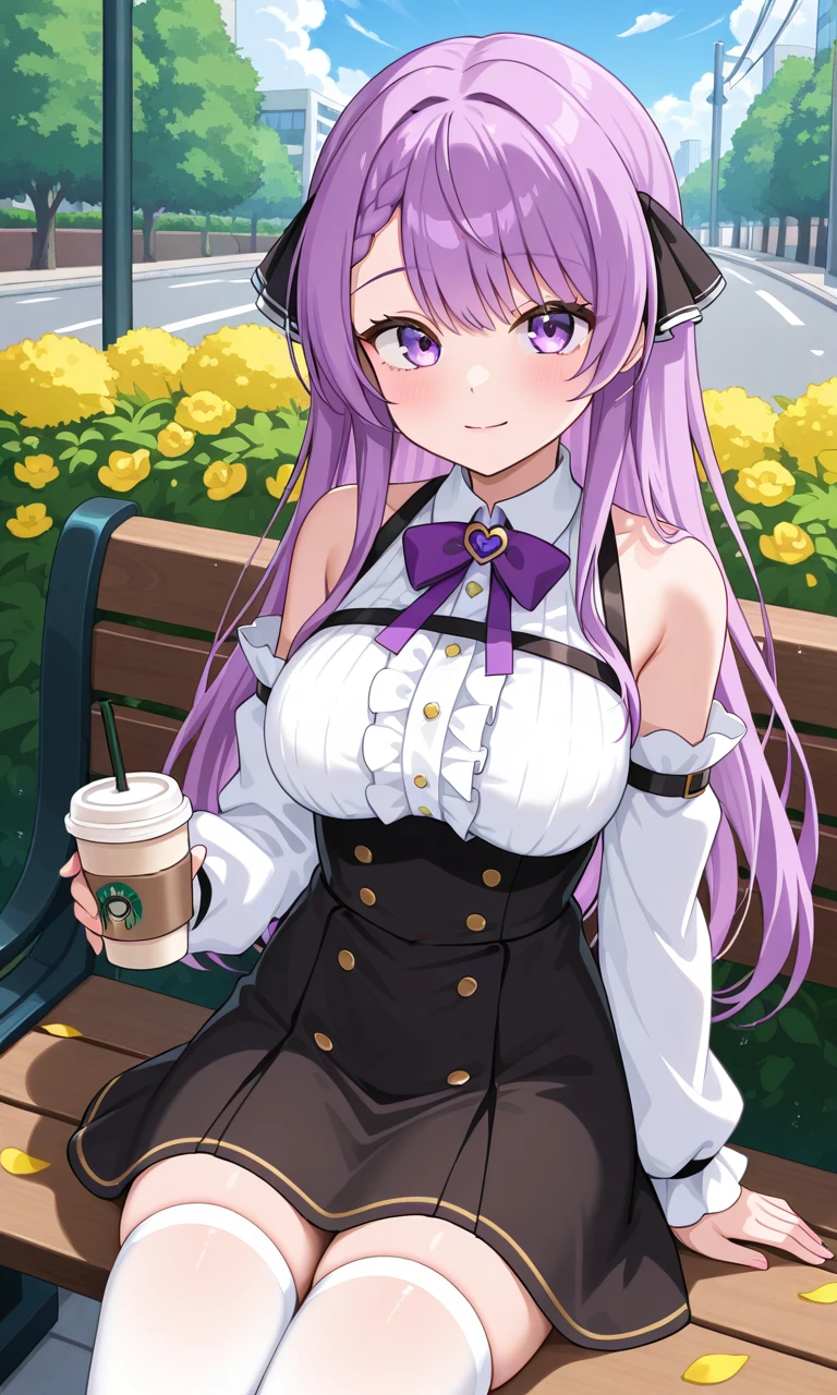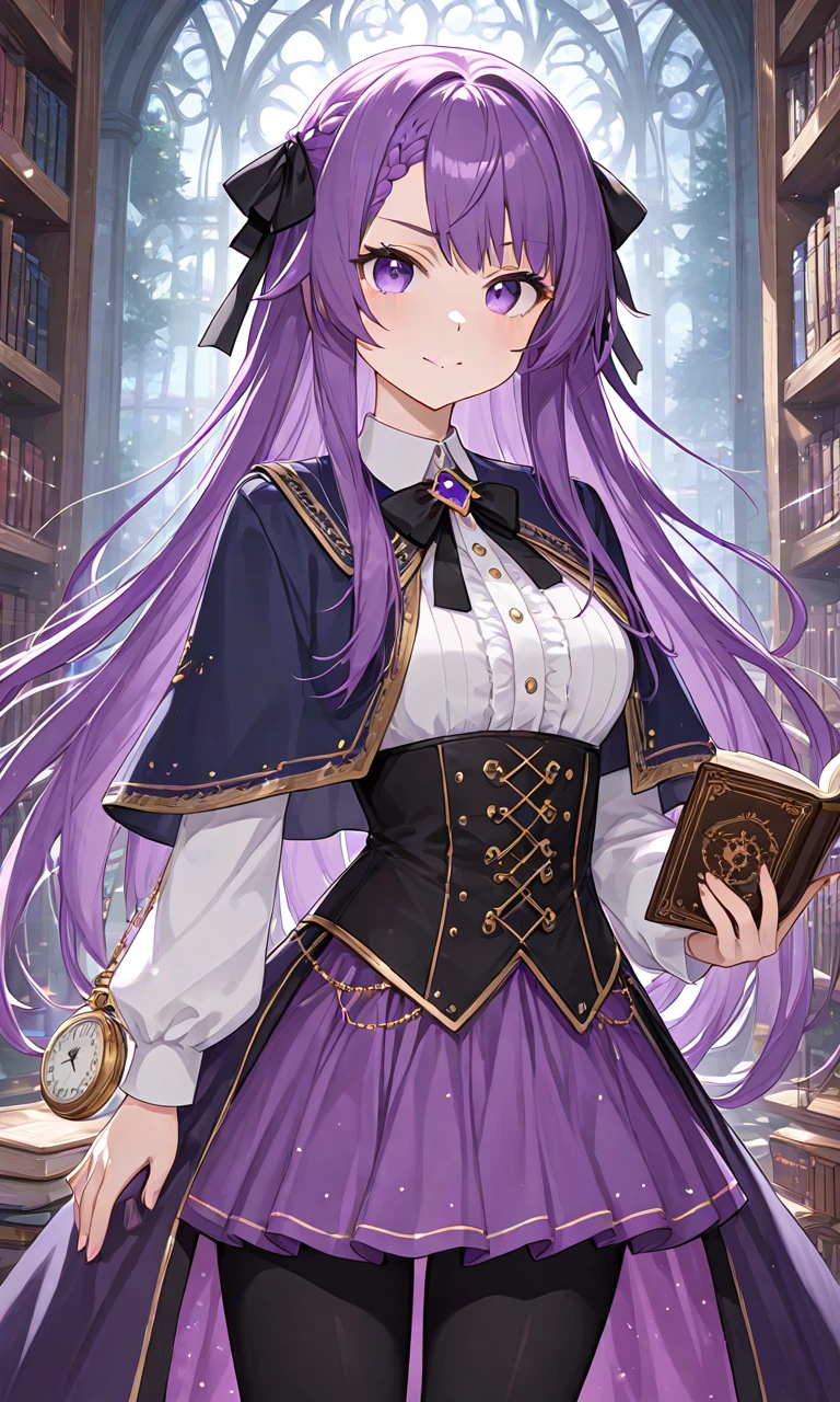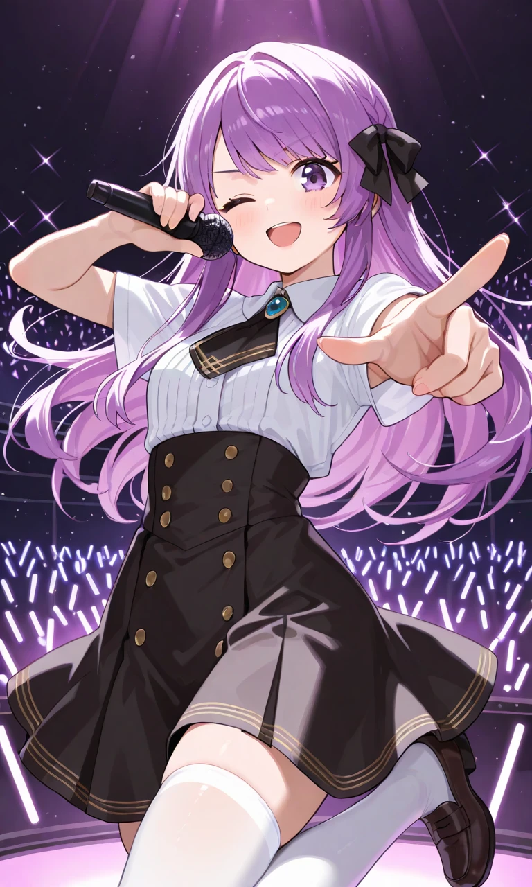 otsuka ray, long hair, braided bangs, hair ribbon, black ribbon, white shirt, center frills, detached sleeves, purple bowtie, high-waist skirt, black skirt, white thighhighs🐹Legacy Outfit :