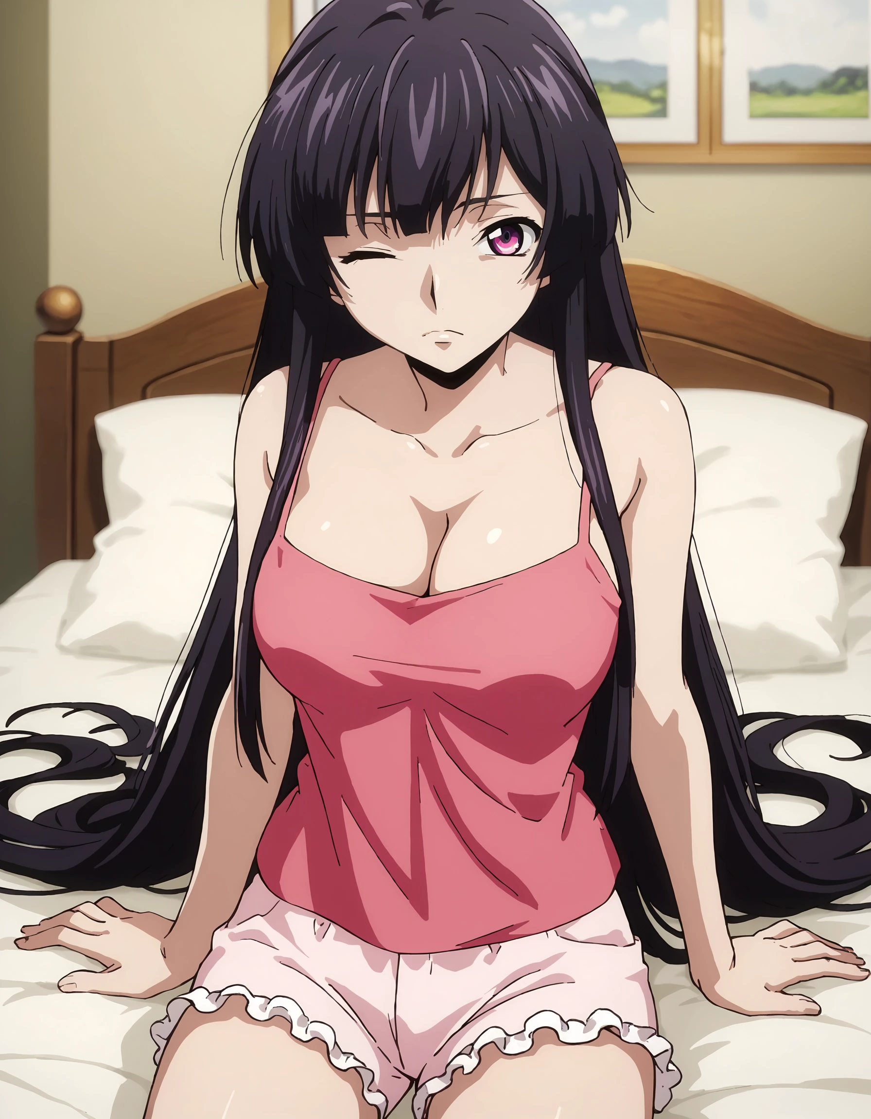 Sleepwear - pink camisole, cleavage, frilled shorts, pink shorts