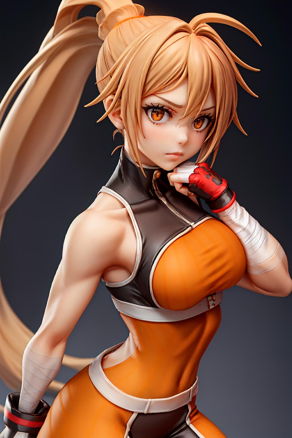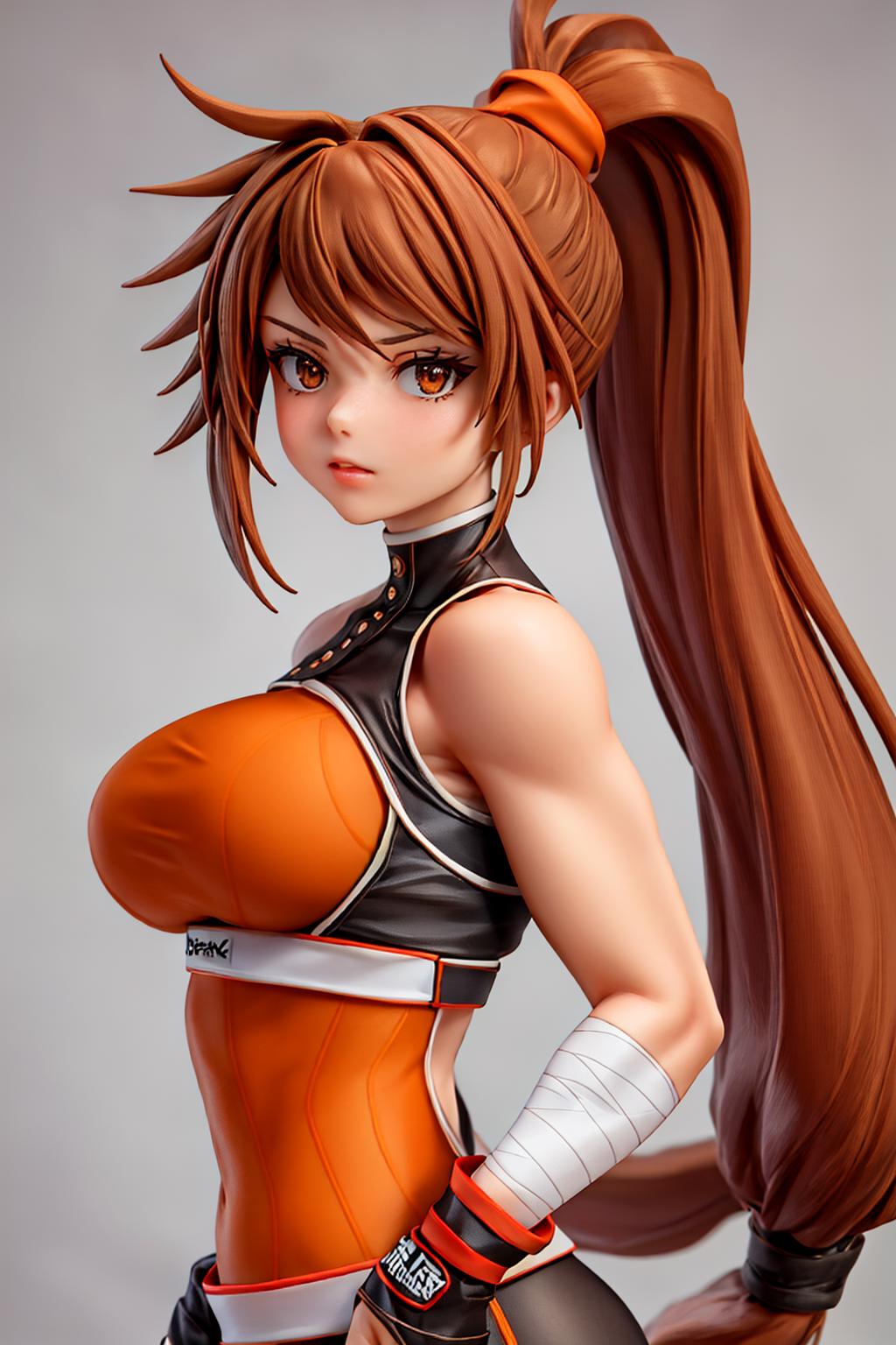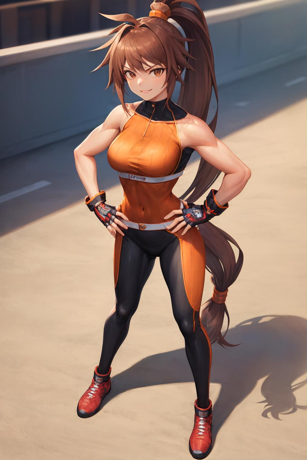 Add "ponytail, orange sleeveless turtleneck, fingerless gloves, black leggings, orange shoes" for her typical look.
