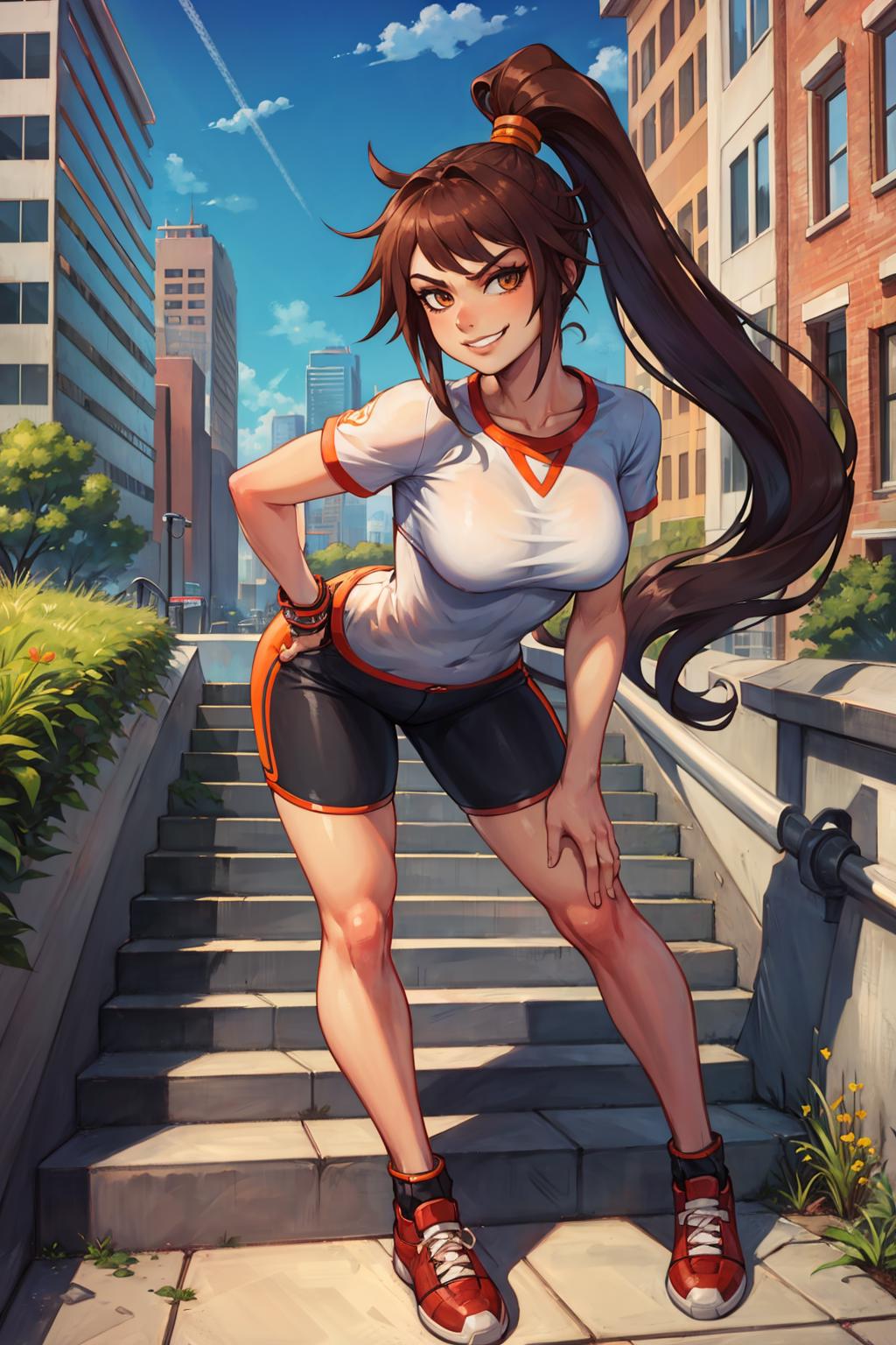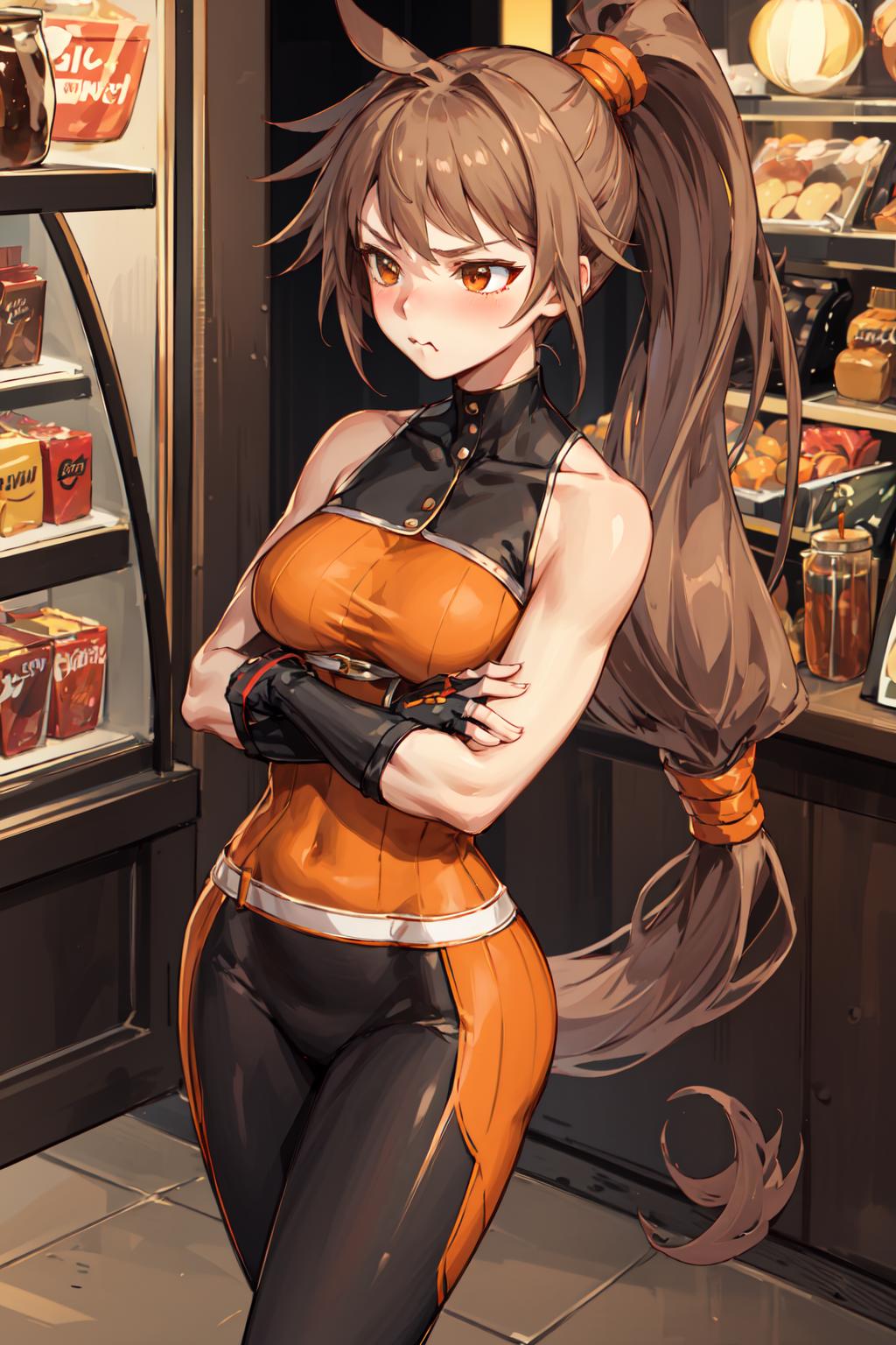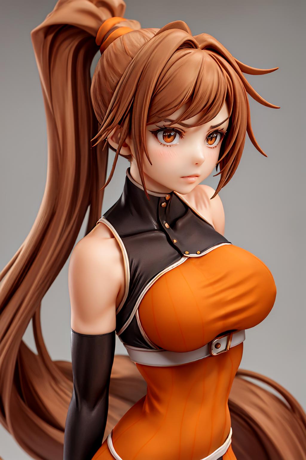 Add "ponytail, orange sleeveless turtleneck, fingerless gloves, black leggings, orange shoes" for her typical look.