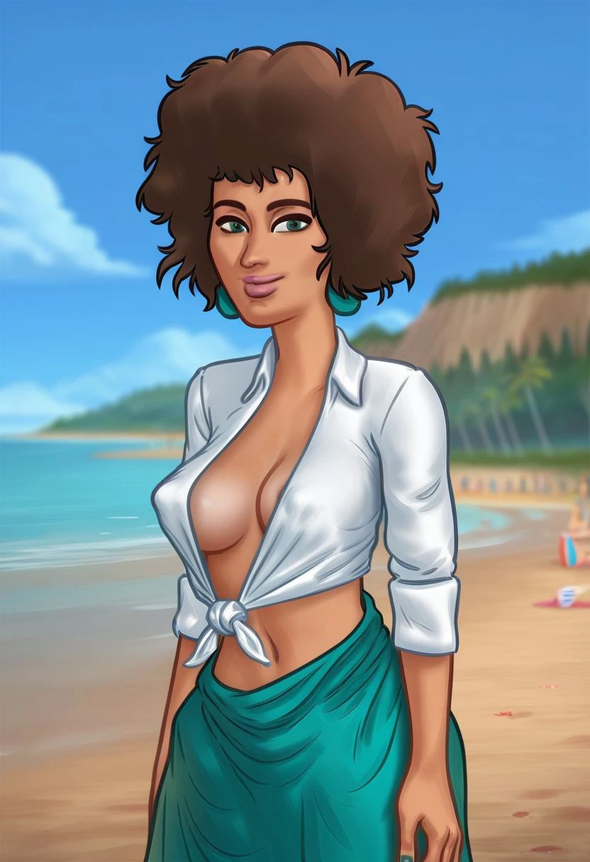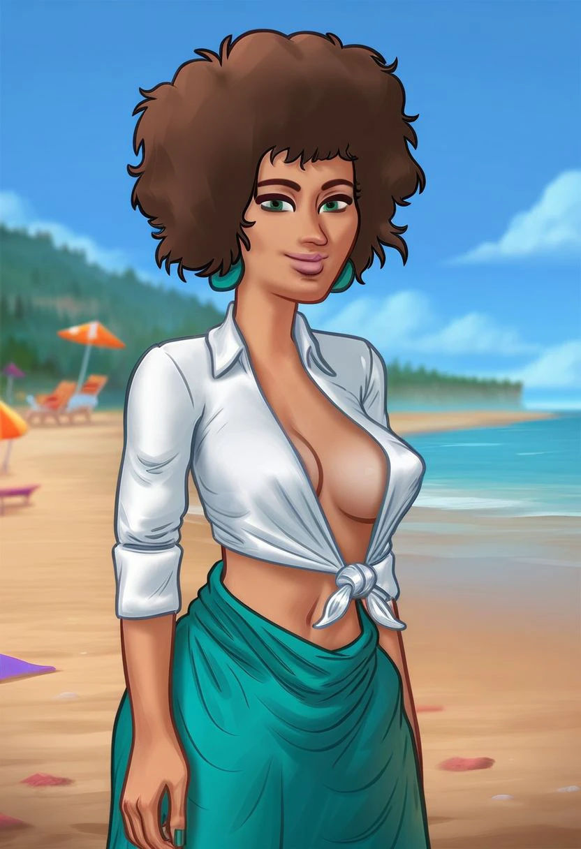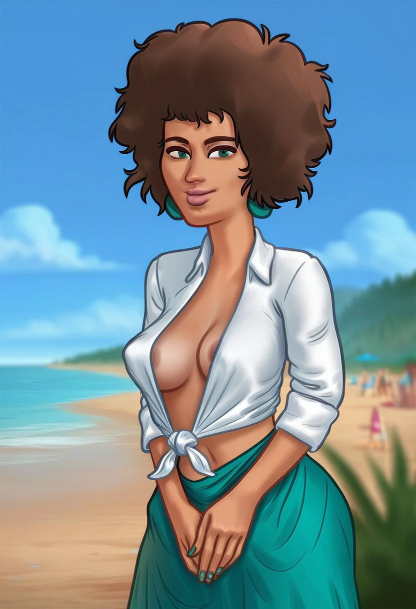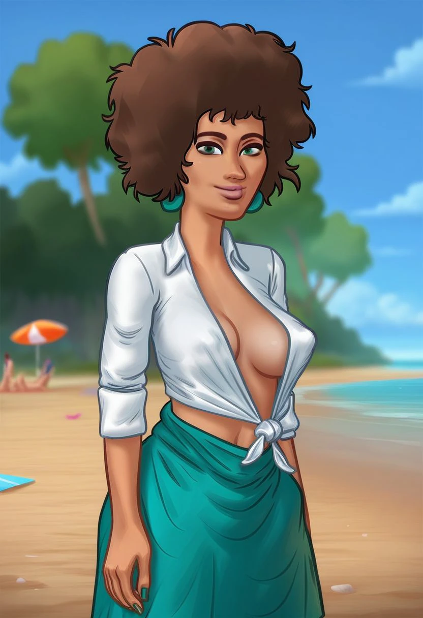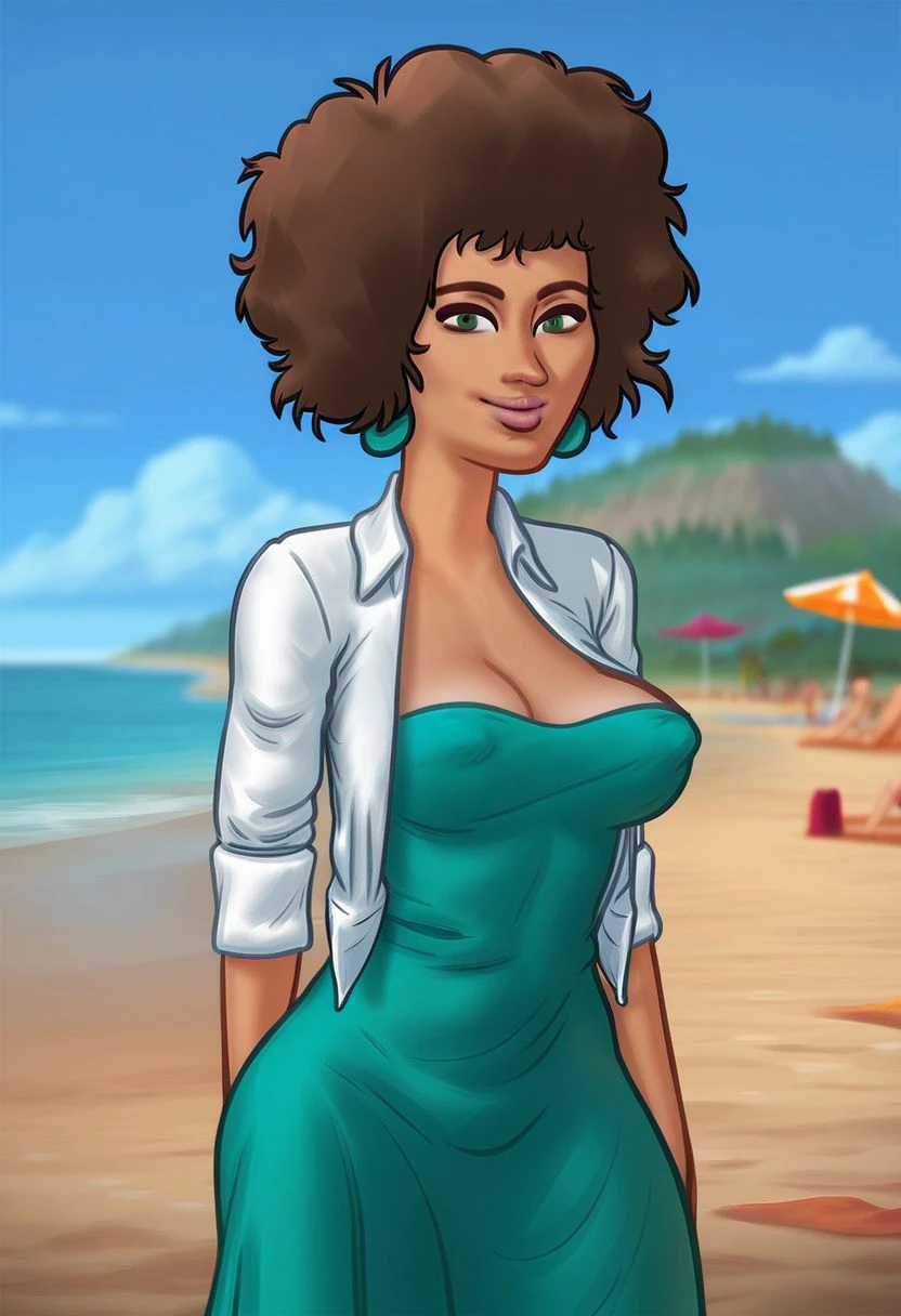 1girl, medium breasts, green eyes, brown hair, afro