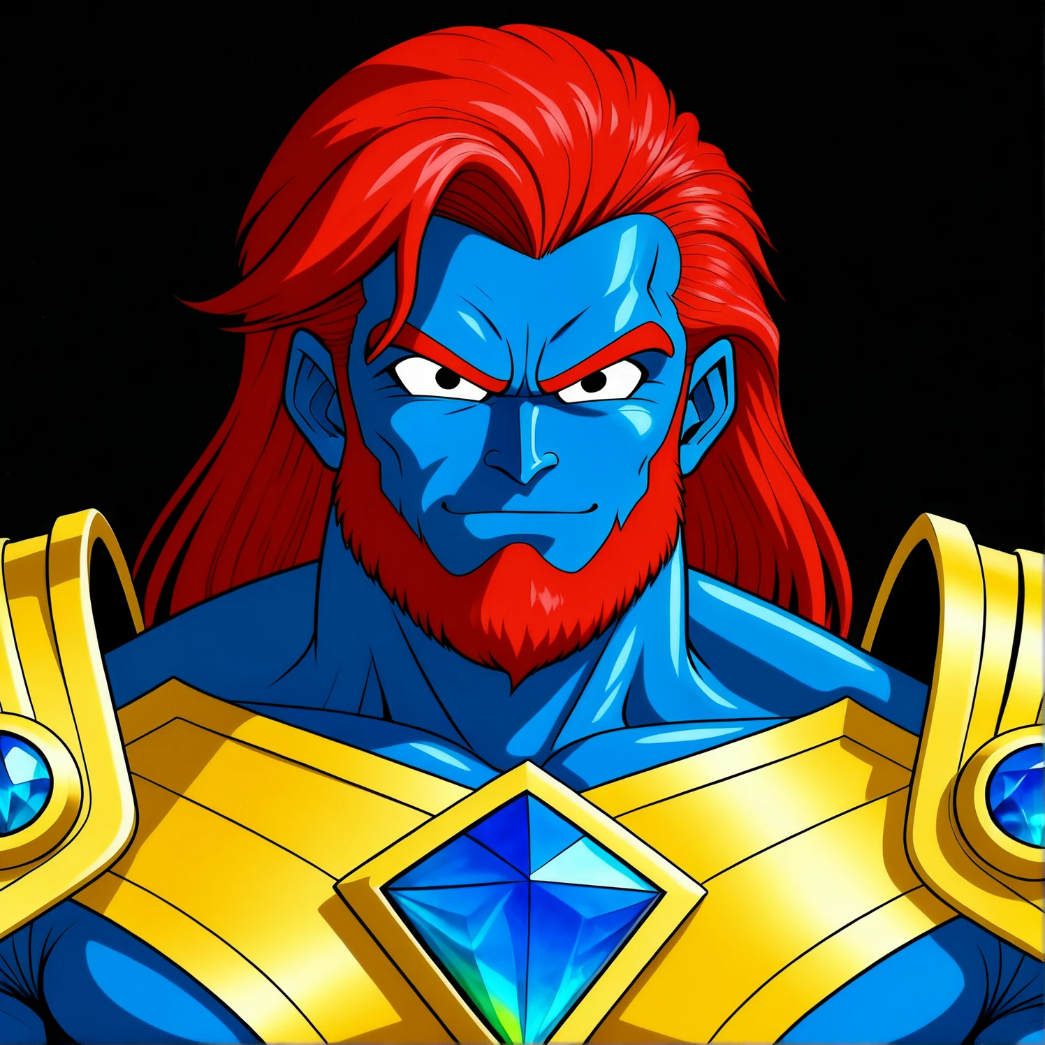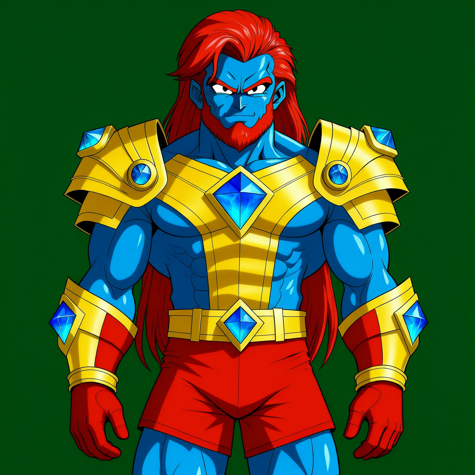 snapperzaff, tmsnapperzaff, snapperzafftm, male character, very muscular body, tall humanoid, full body, standing pose, front view, neutral stance, anime character, dragon ball inspired anime style, clean lineart, smooth anime shading, blue skin, long red hair reaching past the hips, thick chin beard along the jawline with clean upper lip, sharp eyebrows, human ears, golden smooth plate armor, t-shaped chest plate, double layered shoulder plates, embedded gemstones, large diamond gem, belt, shorts, leg armor with knee guards and shin armor, boots, symmetrical armor design