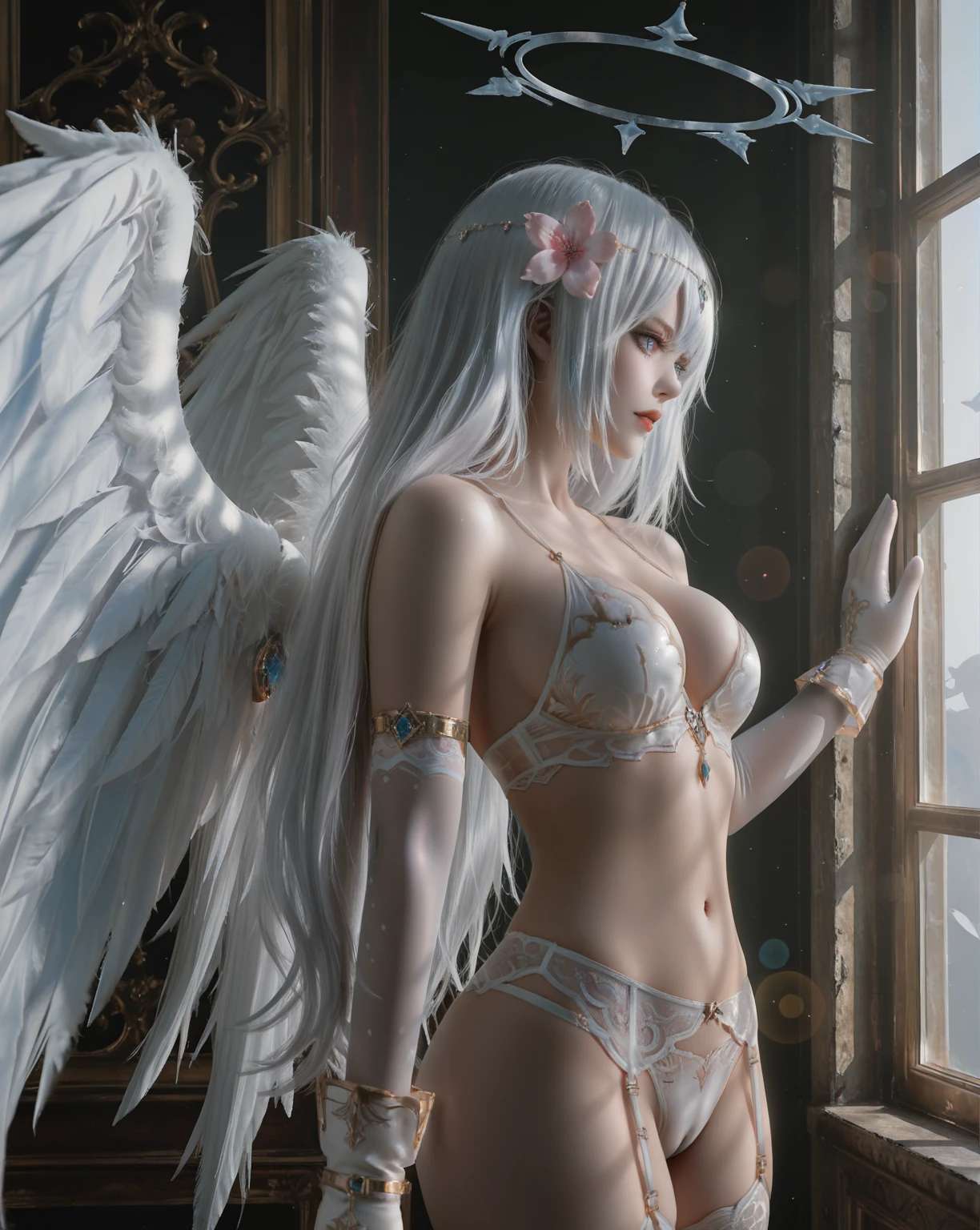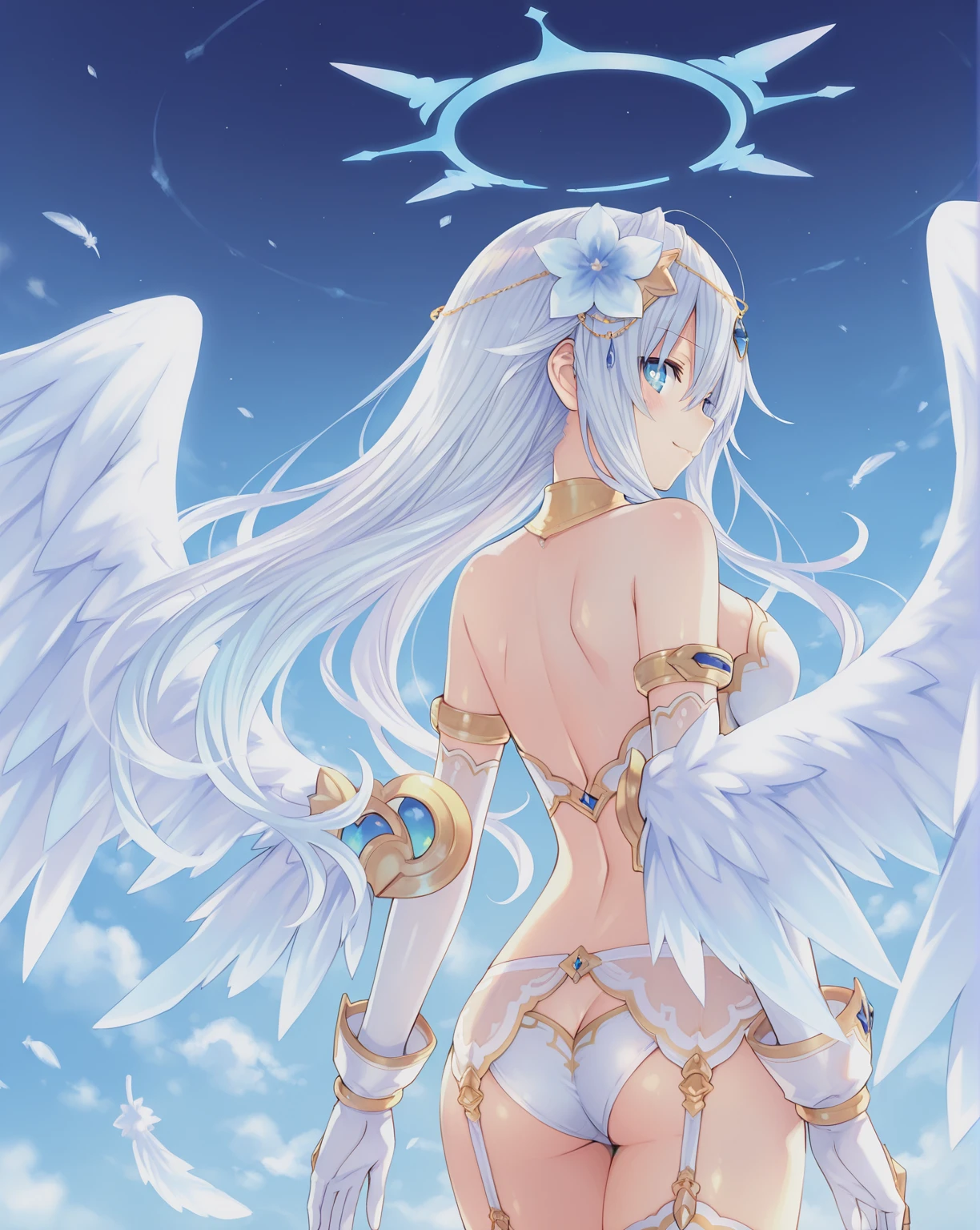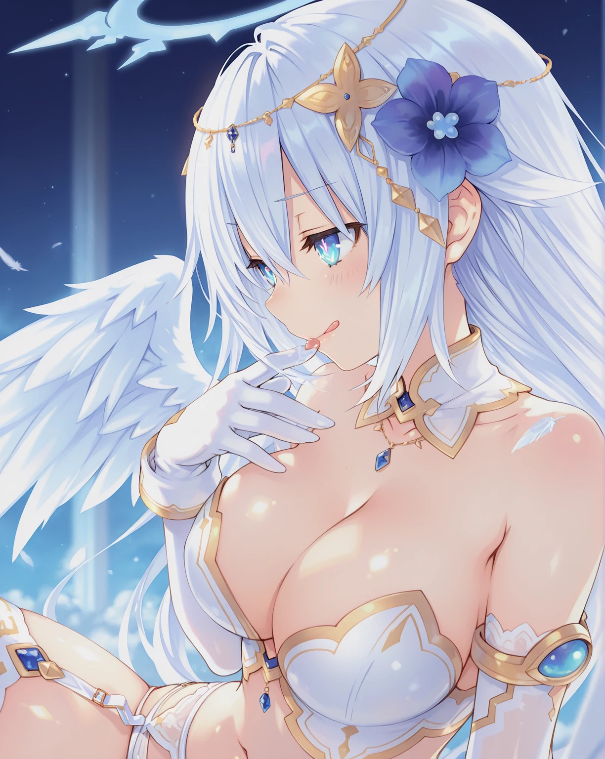 Black Heart Angel,1girl,angel,halo,solo,long hair,wings,white hair,symbol-shaped pupils,power symbol,hair ornament,navel,angel wings,gloves,garter belt,blue eyes,hair flower,feathered wings,thighhighs,elbow gloves,white gloves,bare shoulders,