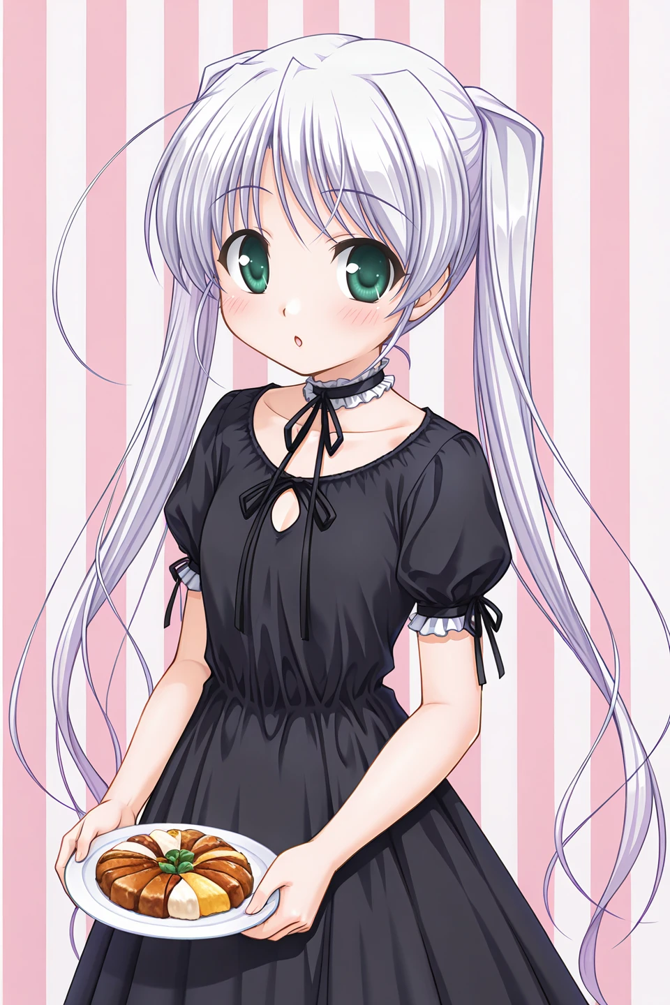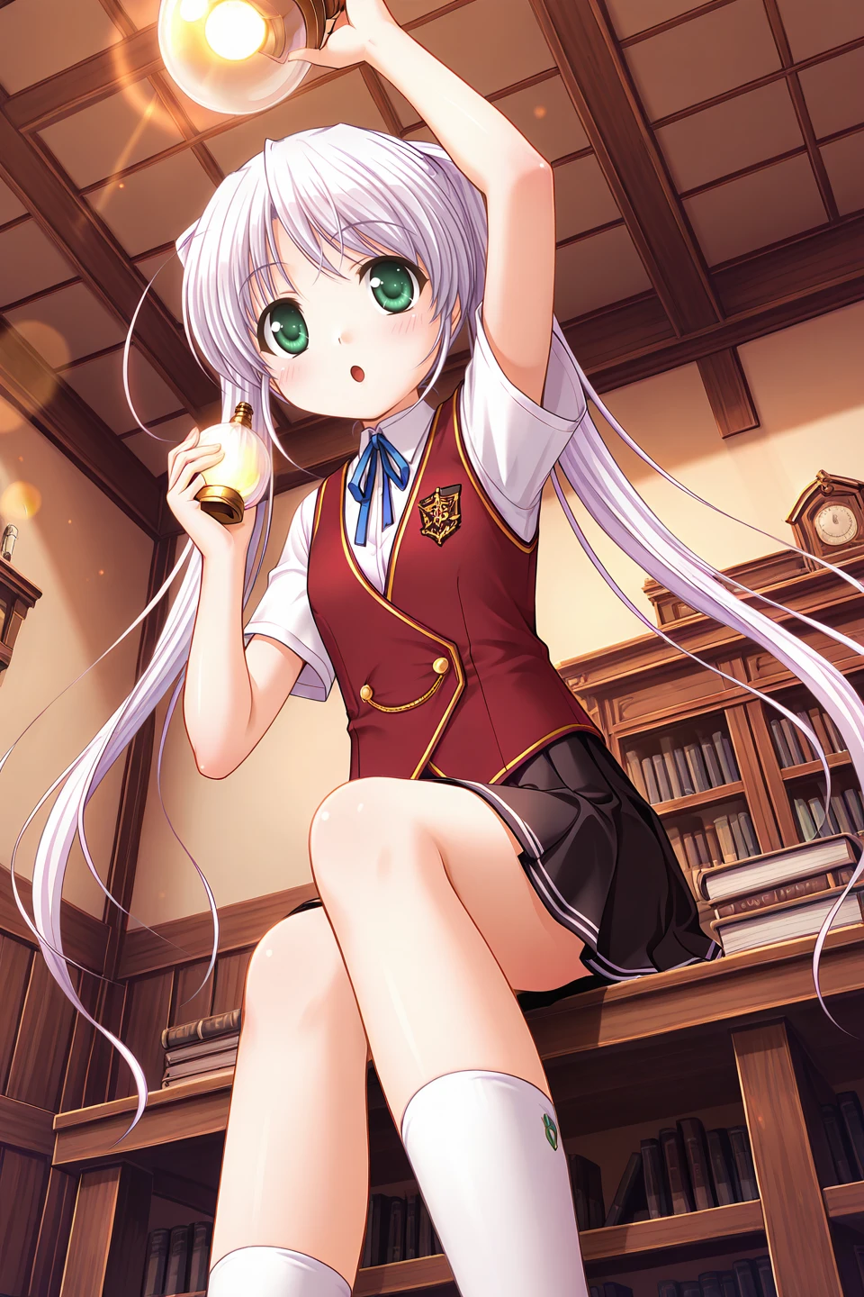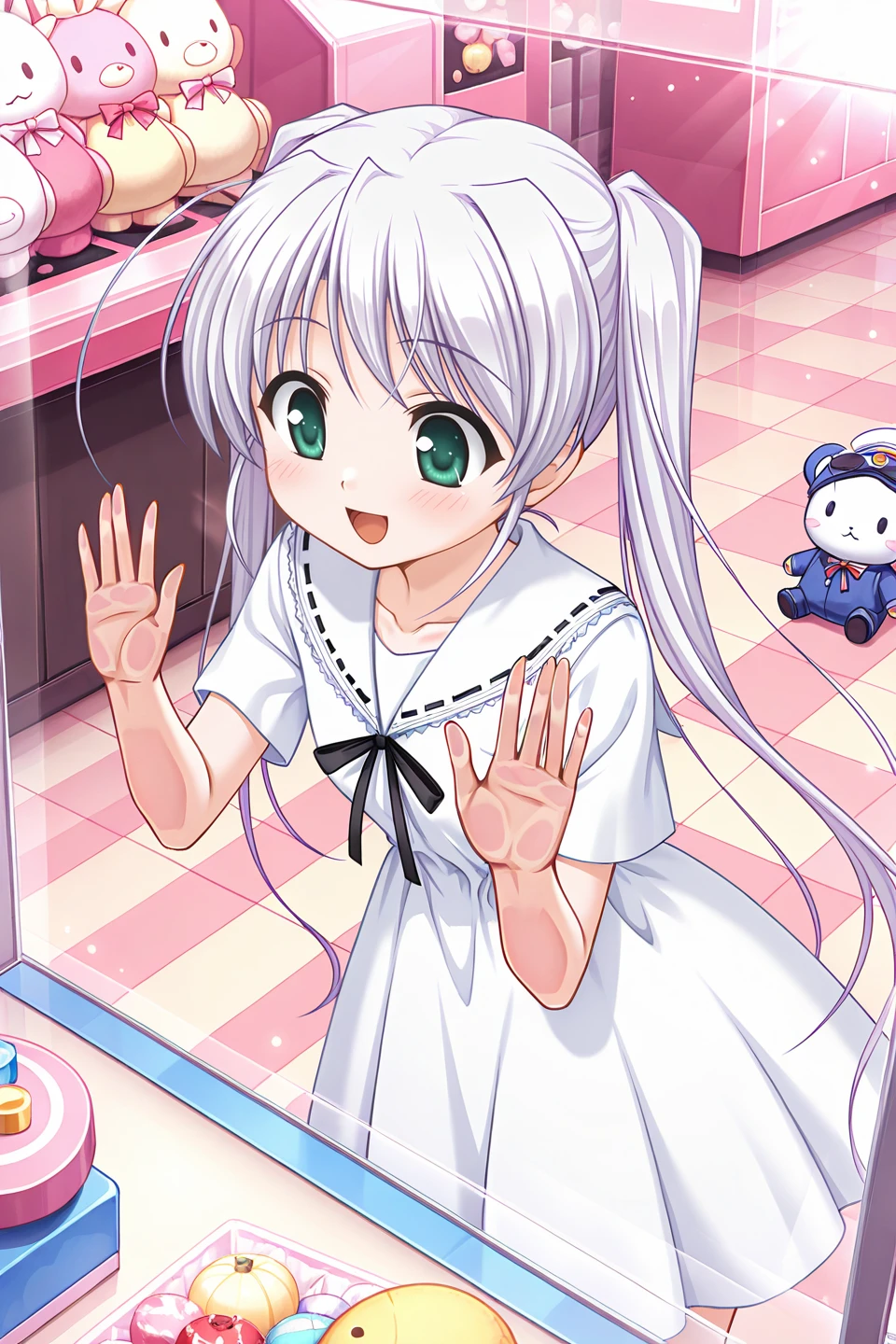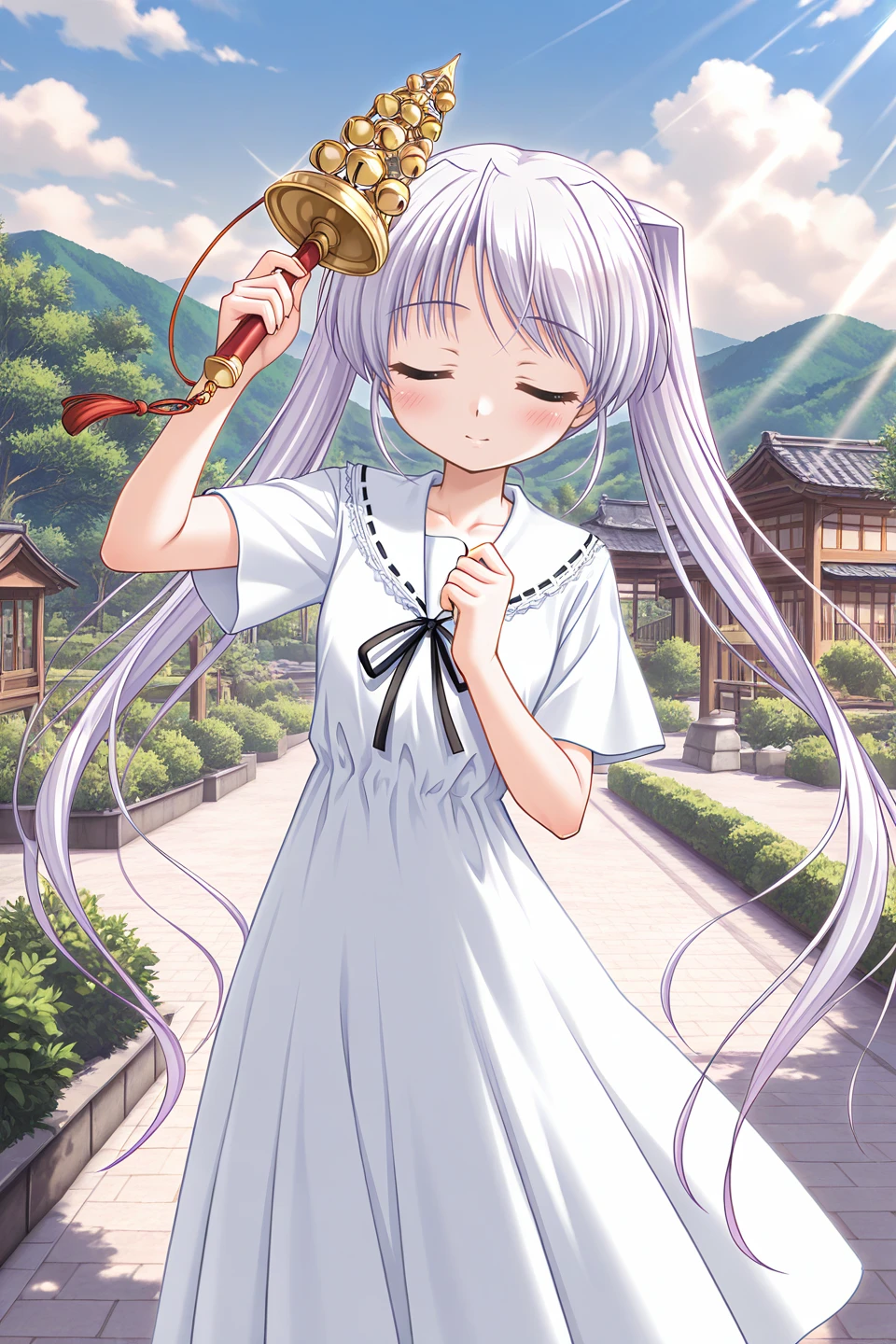 tougi shiro,green eyes,white hair,light purple hair,very long hair,sidelocks,huge ahoge,twintails,petite,