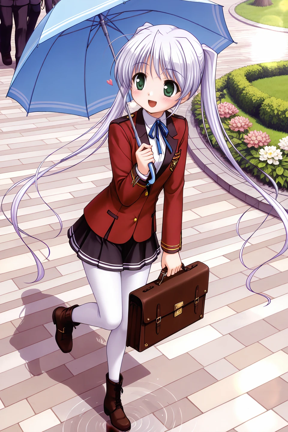school uniform,winter uniform,blazer,red jacket,long sleeves,white shirt,collared shirt,blue ribbon,neck ribbon,black skirt,miniskirt,pleated skirt,white pantyhose,ankle boots,brown footwear,