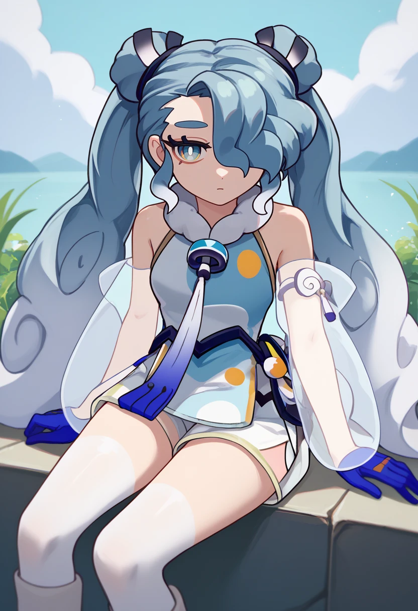 fluffy, white dress, short dress, sleeveless, detached sleeves, see-through sleeves, single glove, blue gloves, shorts, white thighhighs