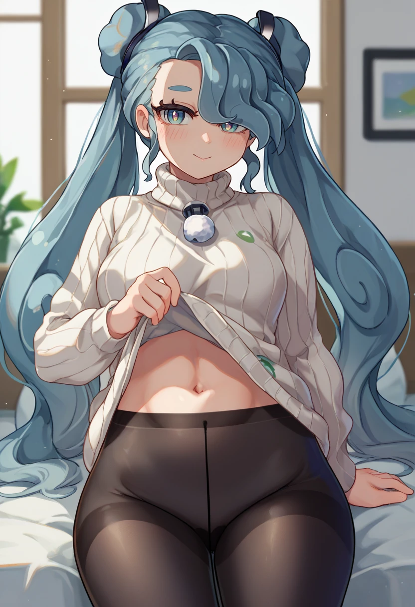 Trigger + Appearance: flyingmiku, hair over one eye, twintails, double bun