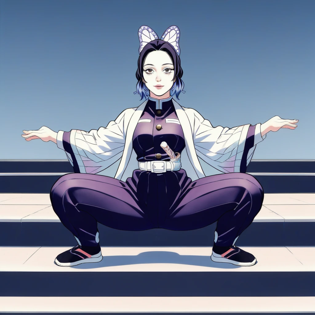 1girl, solo, shinobu_kocho, kocho_shinobu, demon_slayer, black_hair, long_hair, hair_bun, hair_ornament, purple_butterfly_hair_ornament, purple_eyes, looking_at_viewer, haori, open_haori, white_haori, butterfly_print, haori_ribbon, demon_slayer_uniform, purple_uniform, wide_pants, purple_pants, belt, thick_thighs, thunder_thighs, wide_hips, child_bearing_hips, large_ass, plump_ass, squatting, legs_spread, dynamic_pose, sword, katana, sheathed, holding_sword, holding_sheath, two-handed_grip, low_angle, from_below, detailed_background, dark_background
