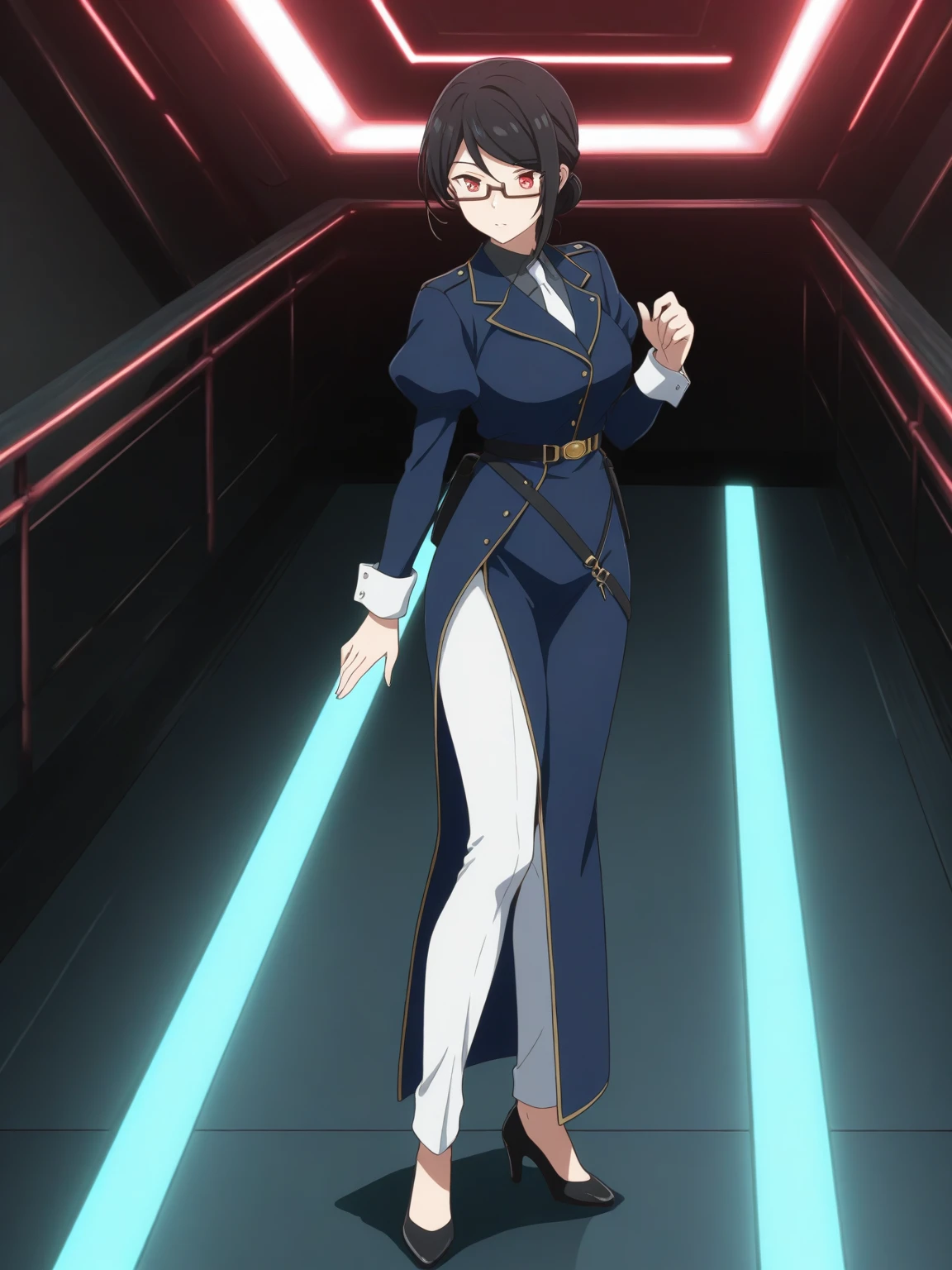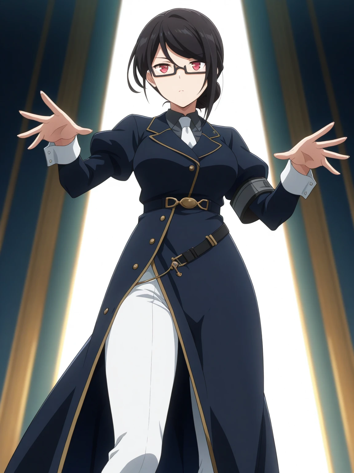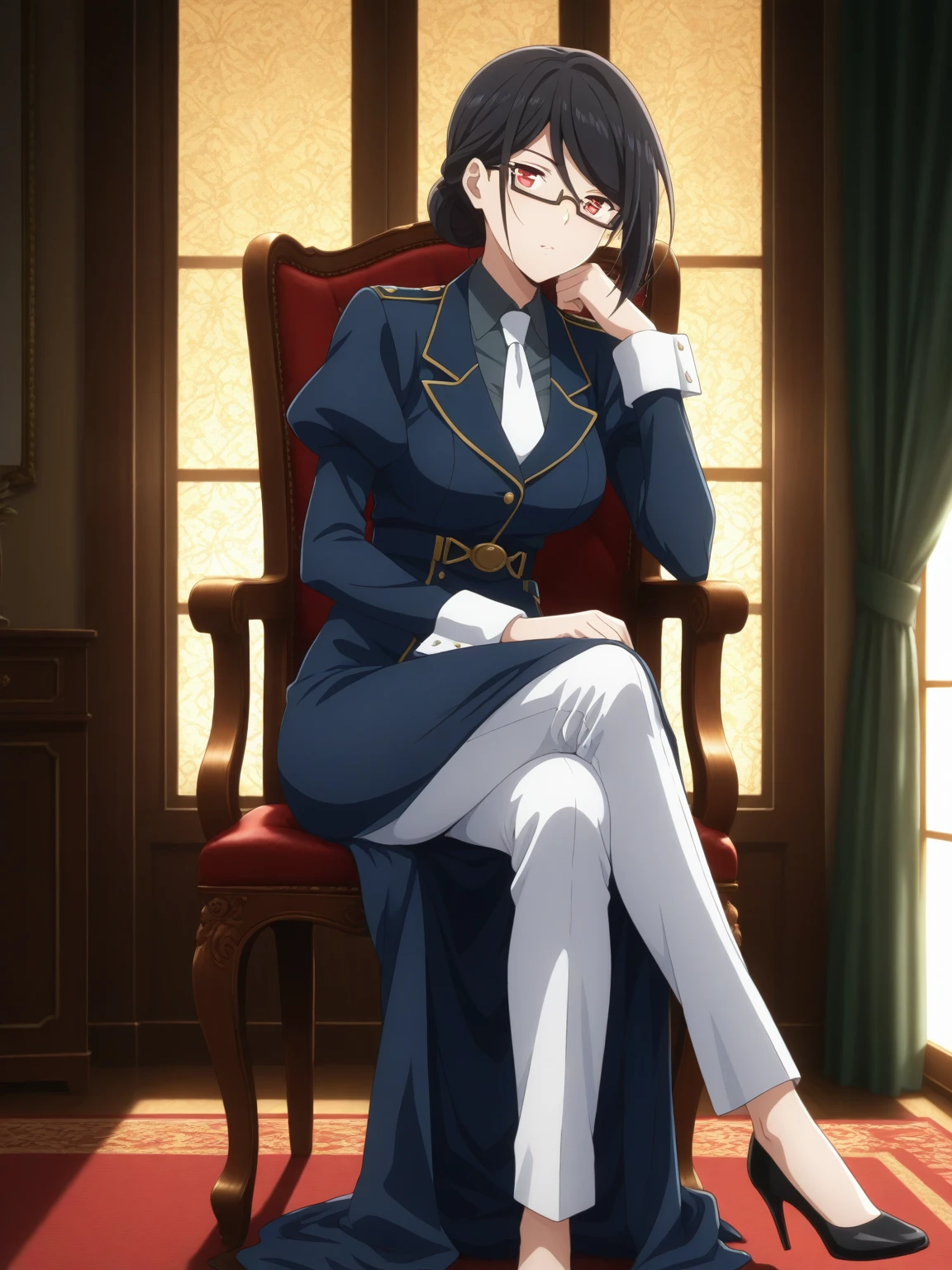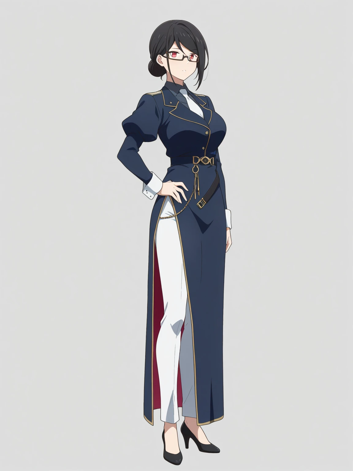 Clothes: military uniform, long sleeves, necktie, long dress, slit dress, white pants, black heels