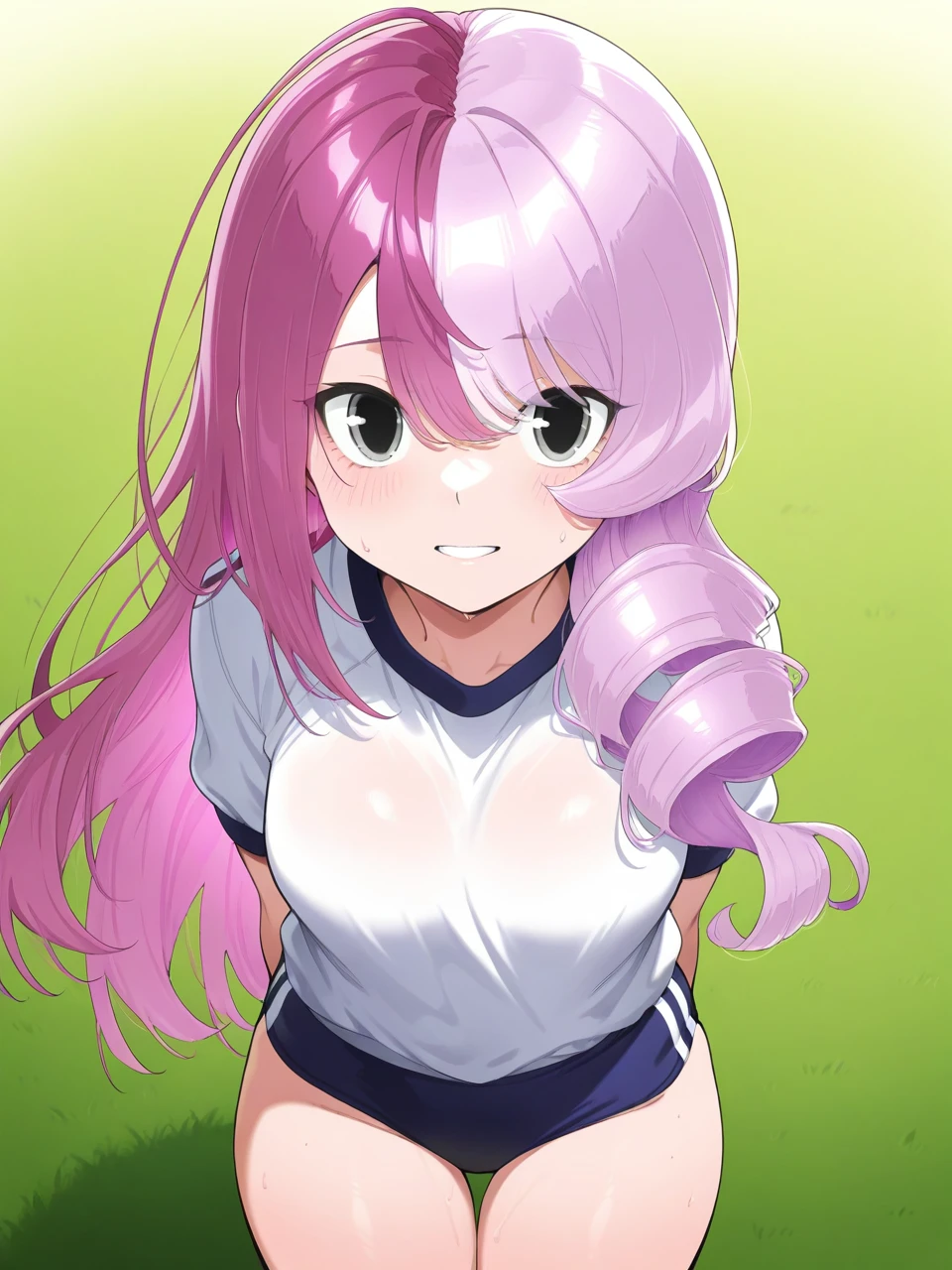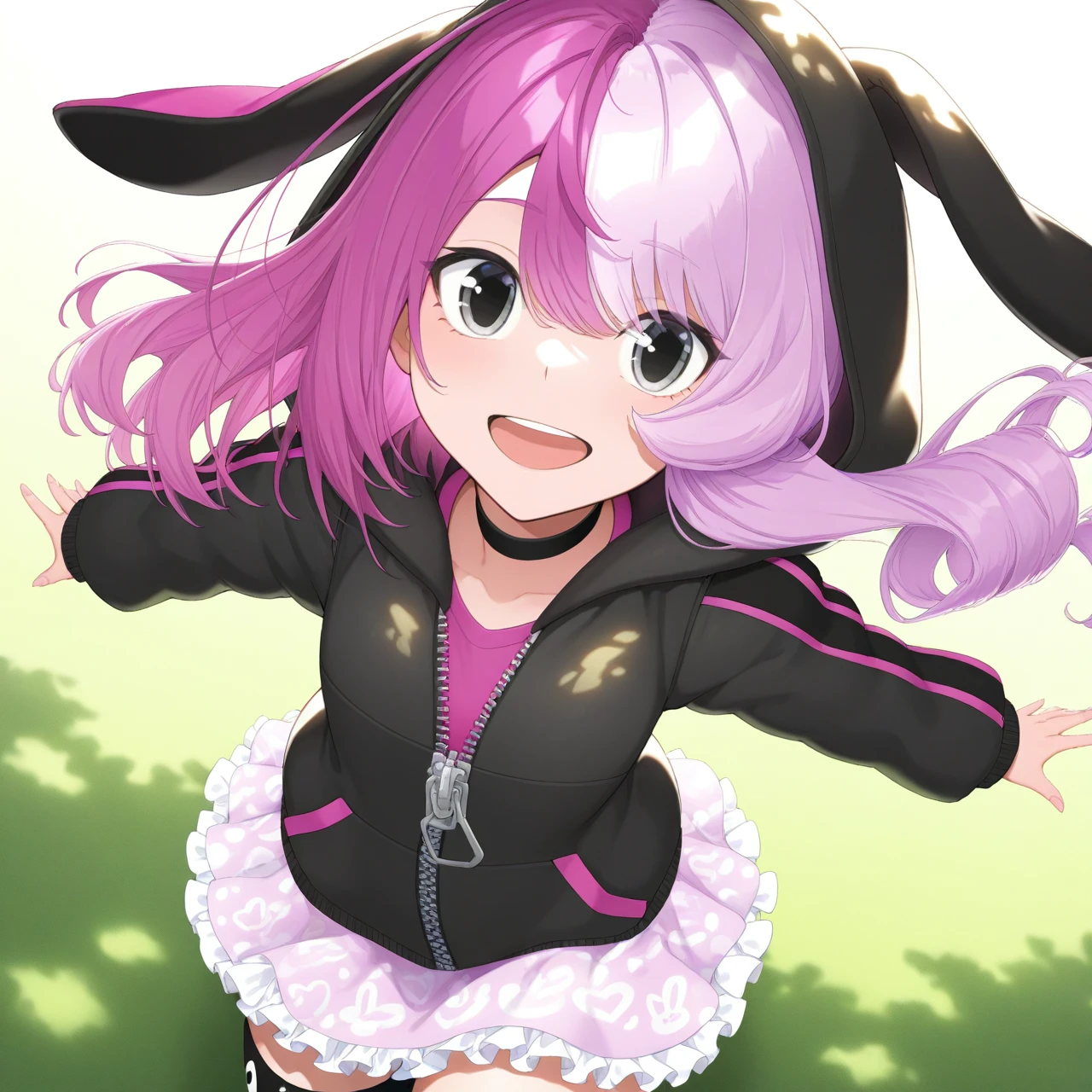 megumegu,asymmetrical hair,two-tone hair,pink and purple hair,black eyes,black choker,rabbit hood,pink shirt,hooded jacket,zipper,frilled skirt,asymmetrical legwear,white footwear,hood down