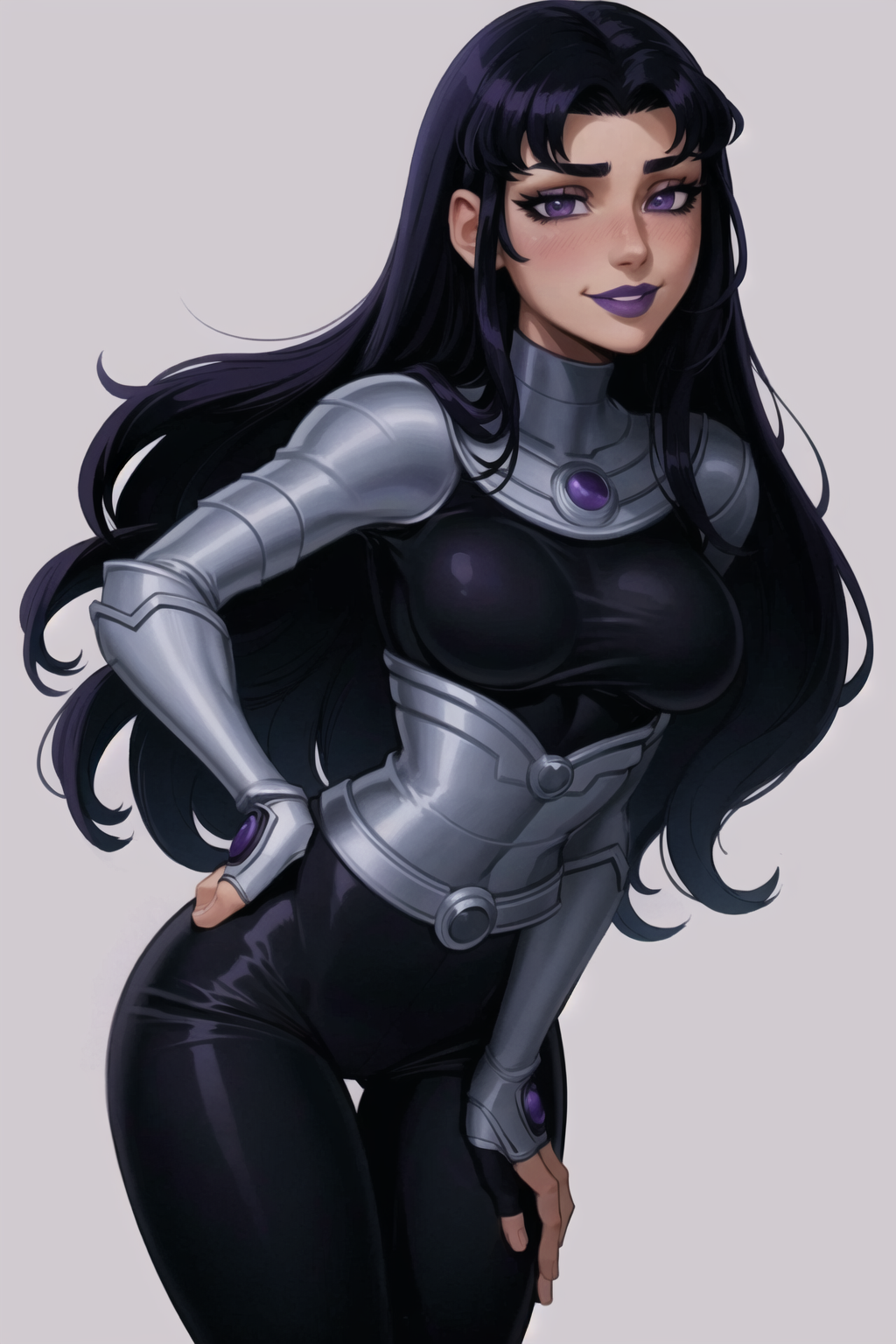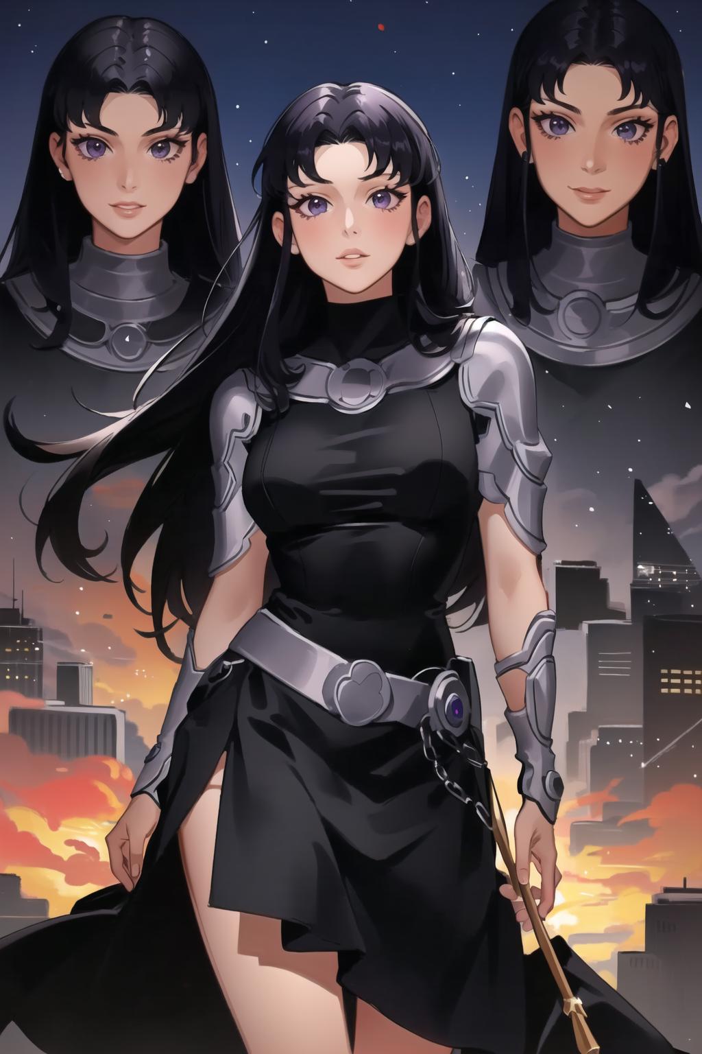 The main keyword is 'blackfire'. Additionally, other tags beginning with 'black' and 'purple' will help push it in the right direction. (i.e. 'black hair' or 'purple eyes', etc.) 'Long hair' and 'parted bangs' also helps.