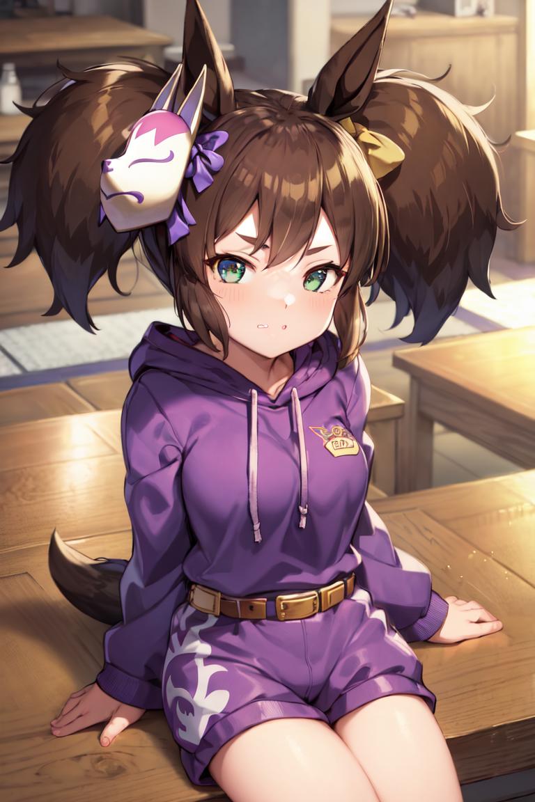 casual, mask on head, fox mask, hair bow, yellow bow, drawstring, purple hoodie, long sleeves, belt, purple bow, black shorts, sneakers, white footwear