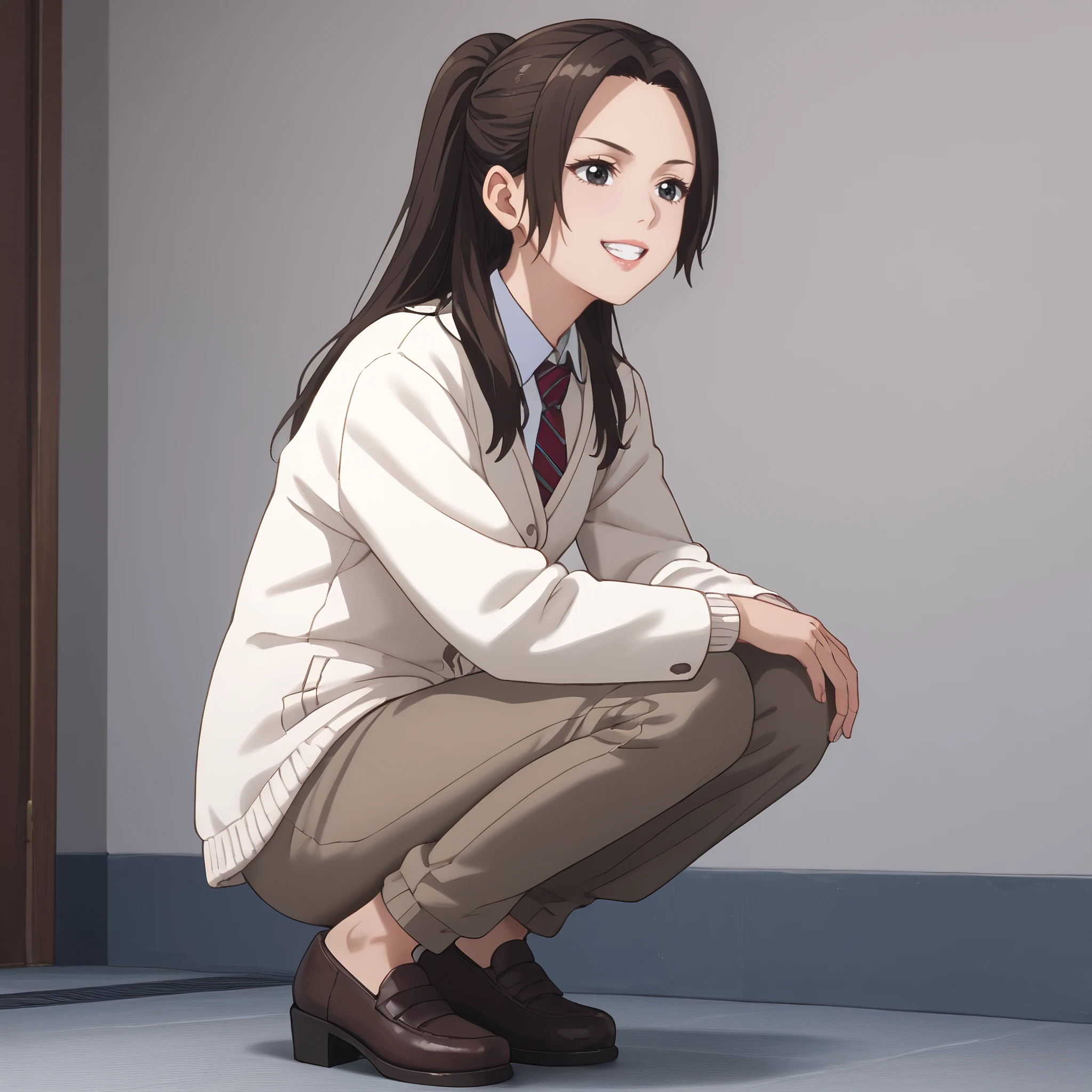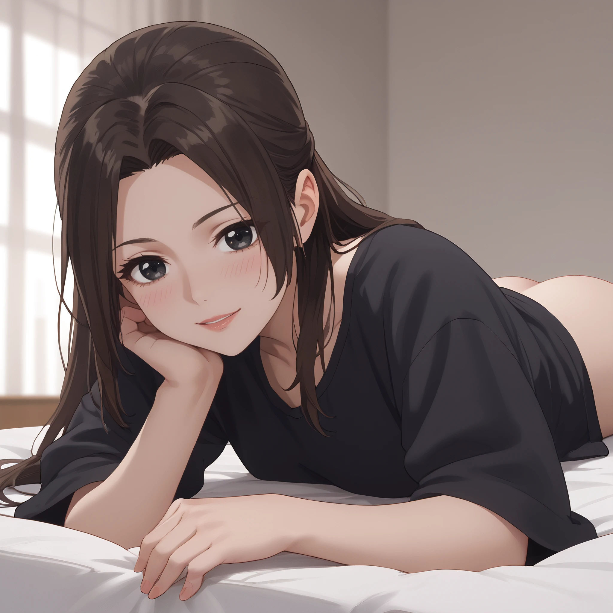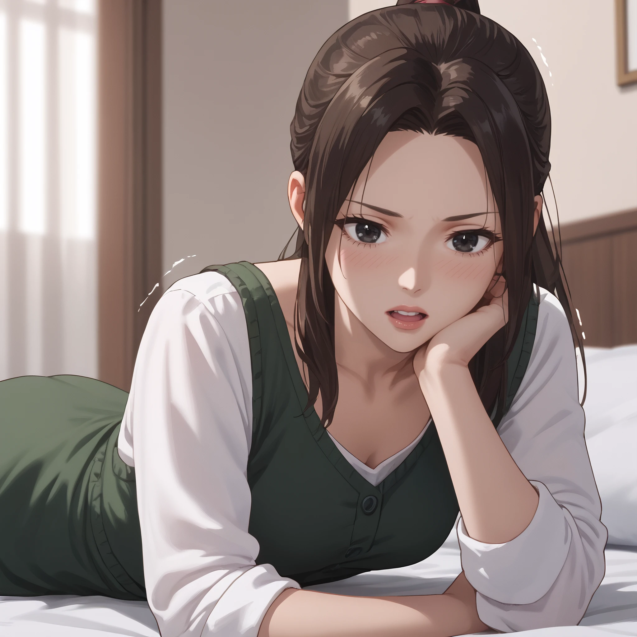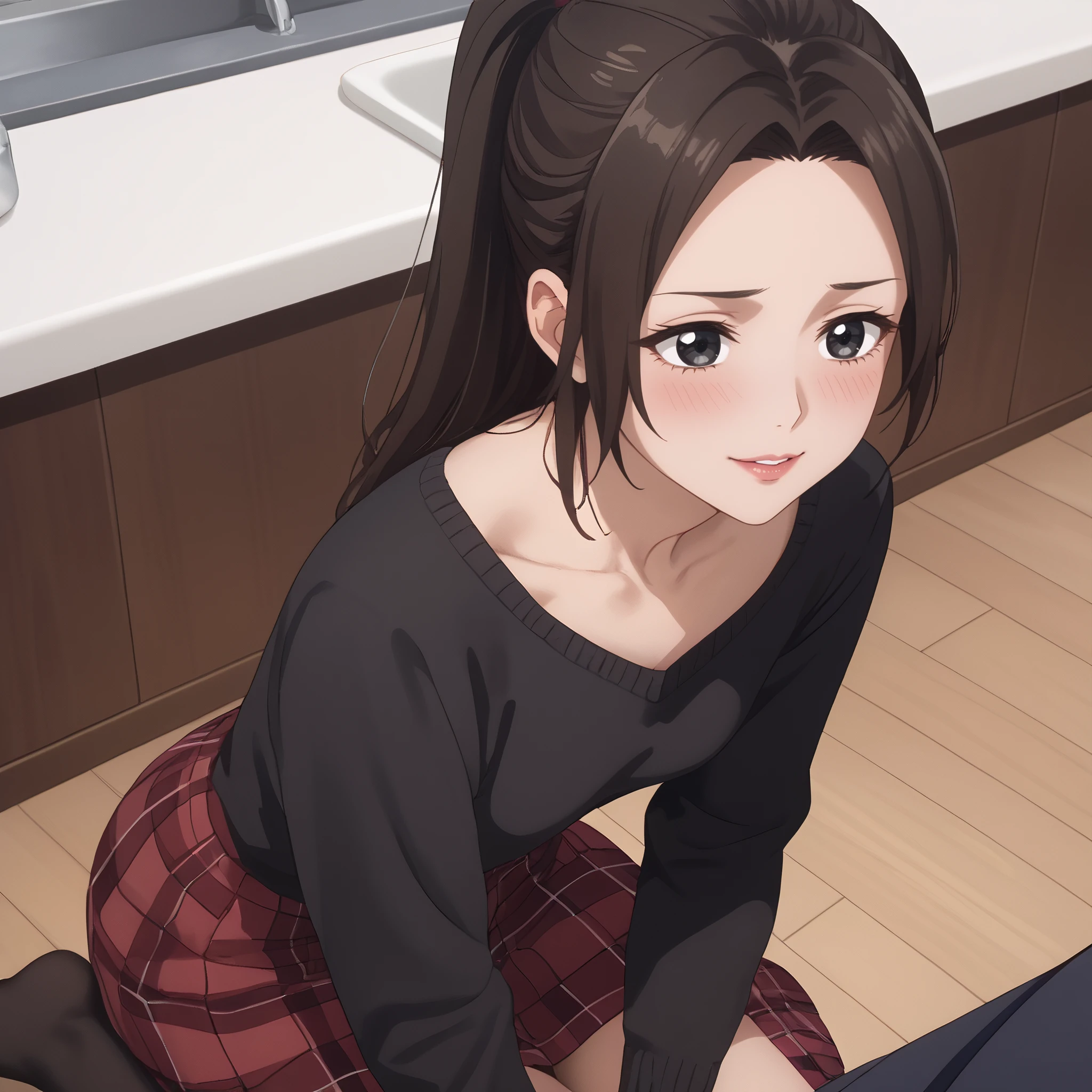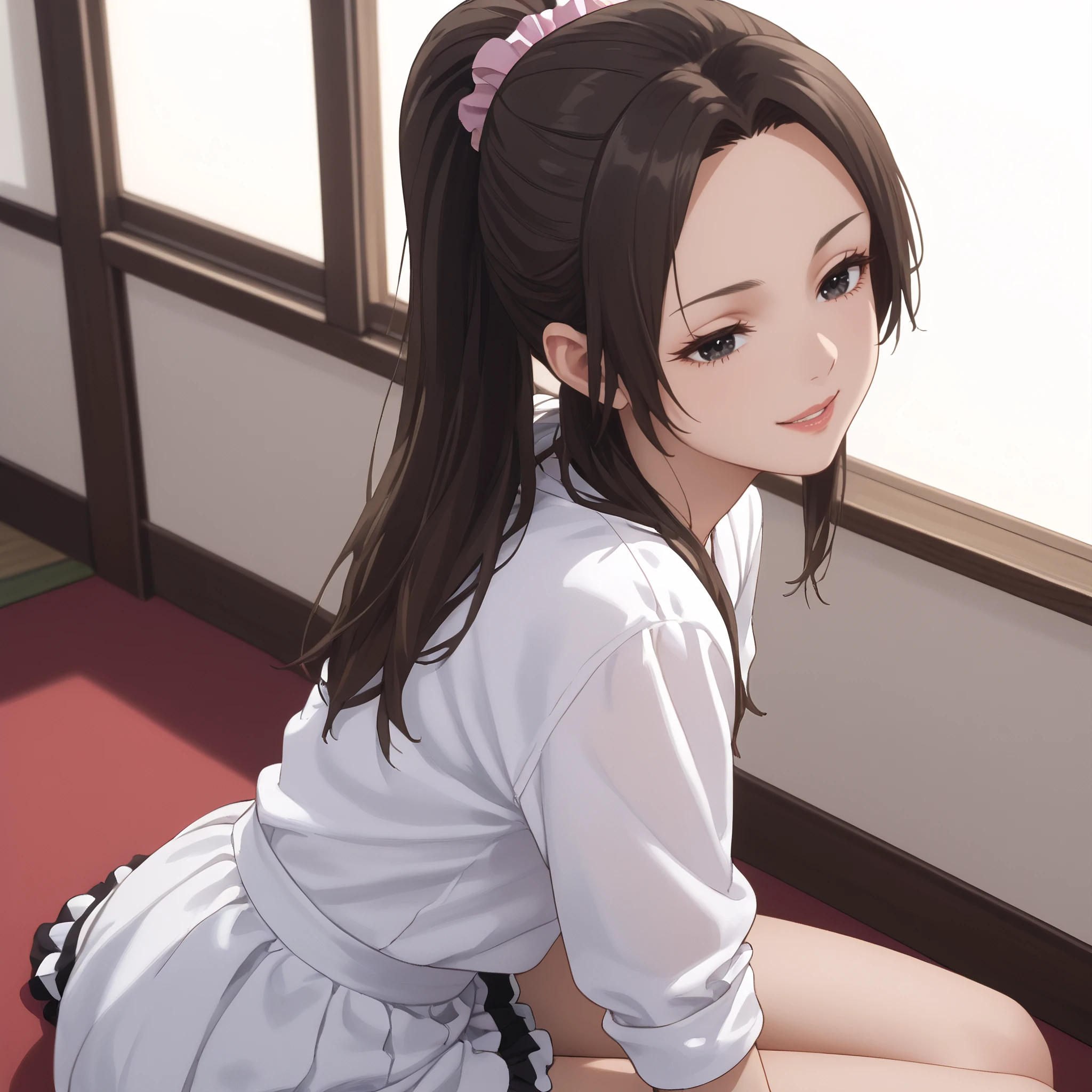 ATNMomoka, long hair, brown hair, bangs, black eyes, ponytail, parted bangs, hair tie, hair pulled back, hair intakes,