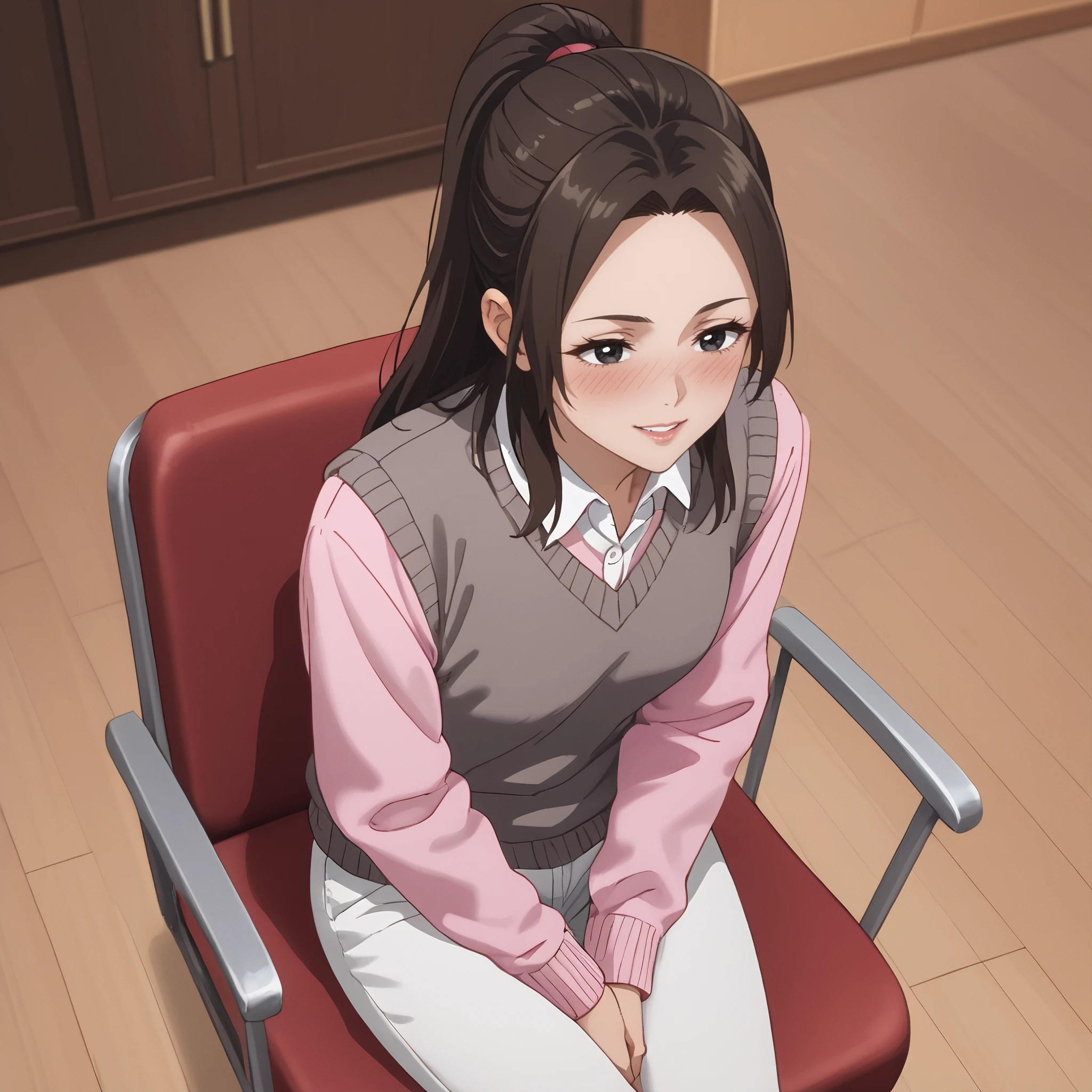 MomokaSweater, sweater, shirt, long sleeves, grey sweater, sweater vest, collared shirt, vest, pink shirt, ribbed sweater, pants, white pants,