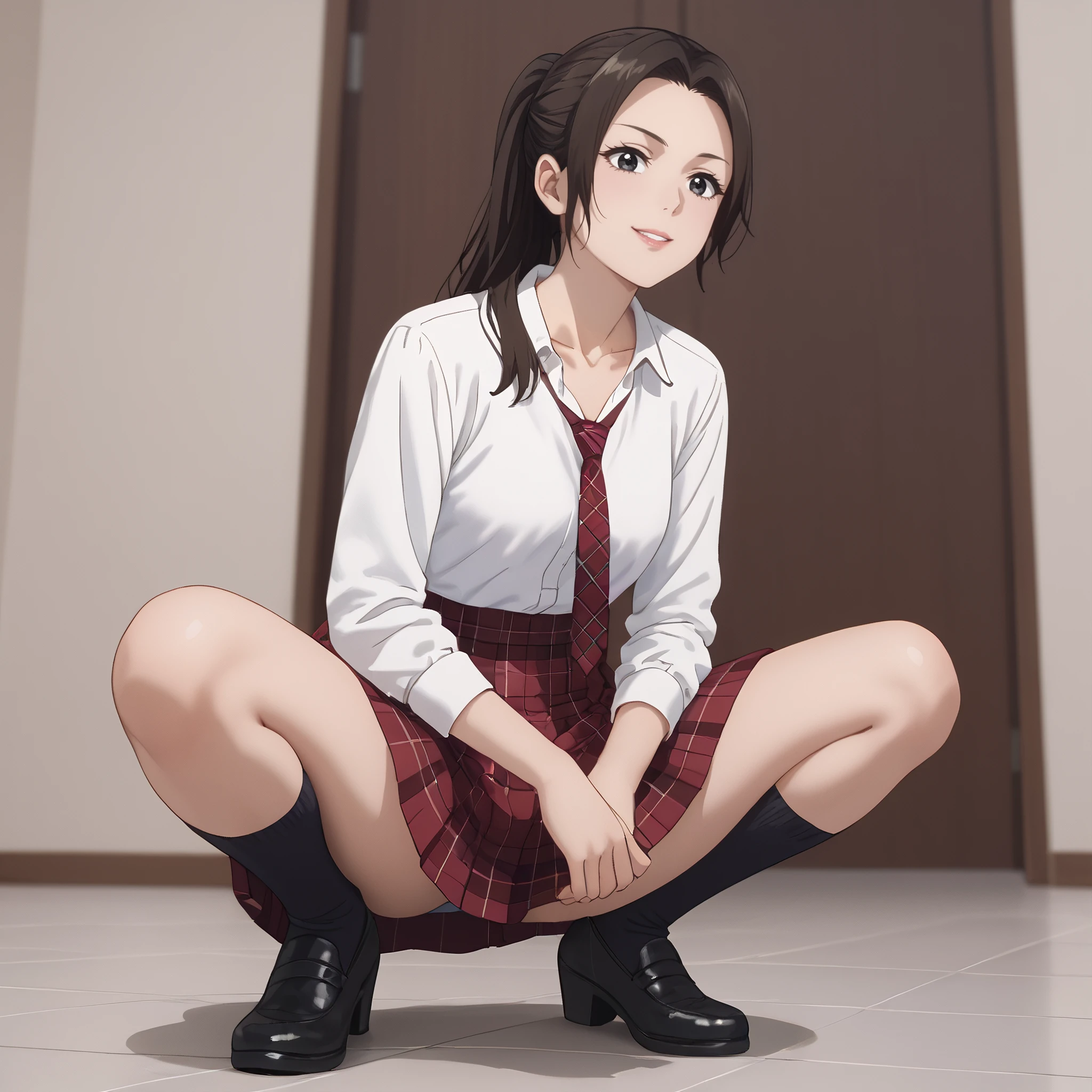 MomokaShirt, shirt, collarbone, long sleeves, black shirt, skirt, red skirt, checkered, plaid, dress shirt,
