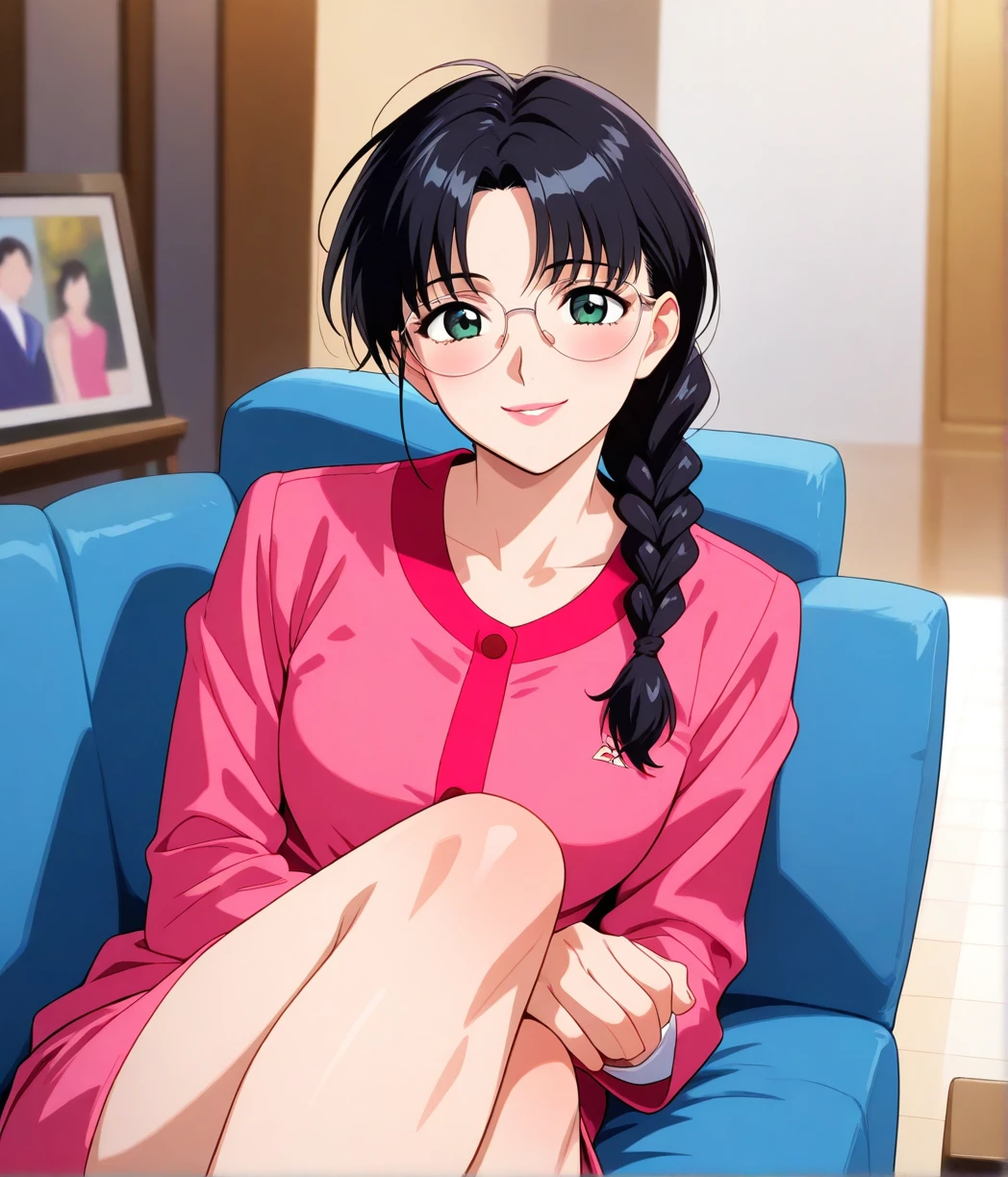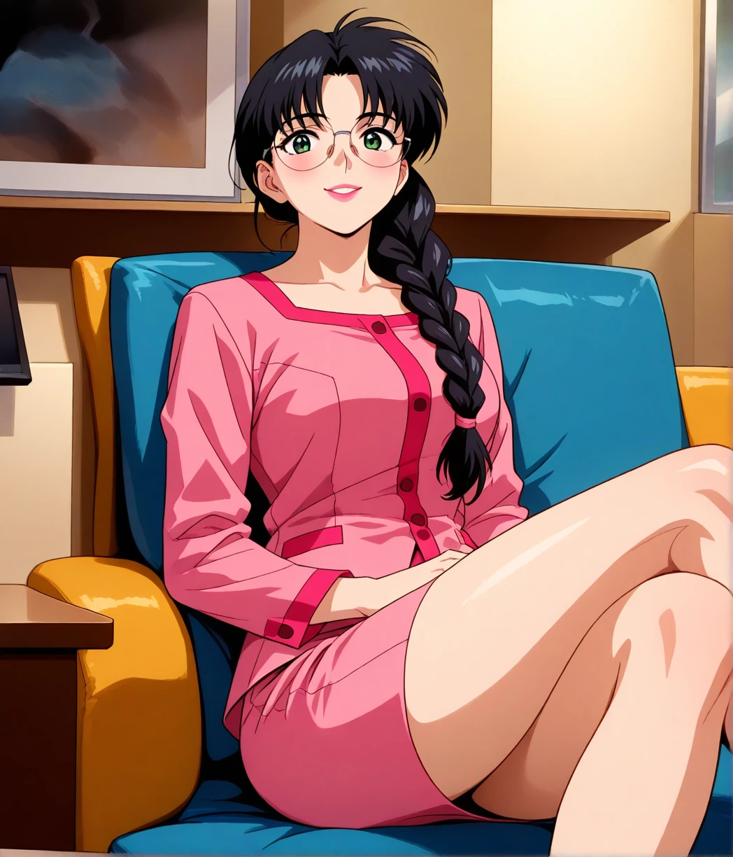 arima_ayumi,long_hair,black_hair,green eyes,25_year_old woman,large_breast, one pigtail,pink lip, glasses,pink suit,one braid,short skirt,hair over shoulder, single braid,