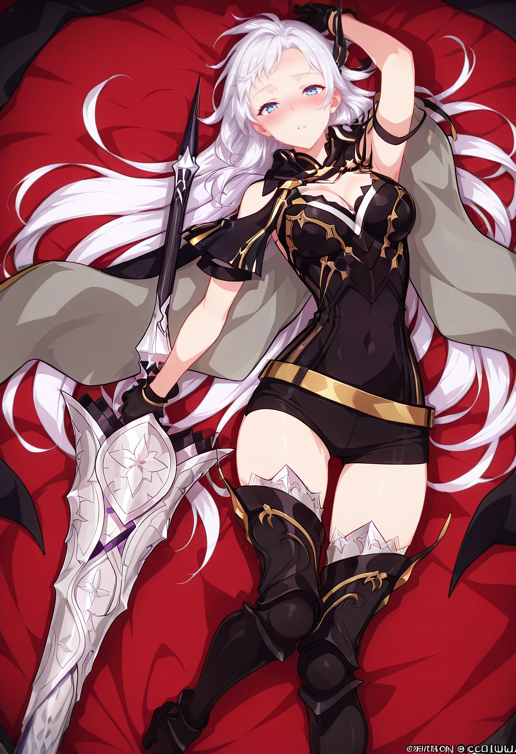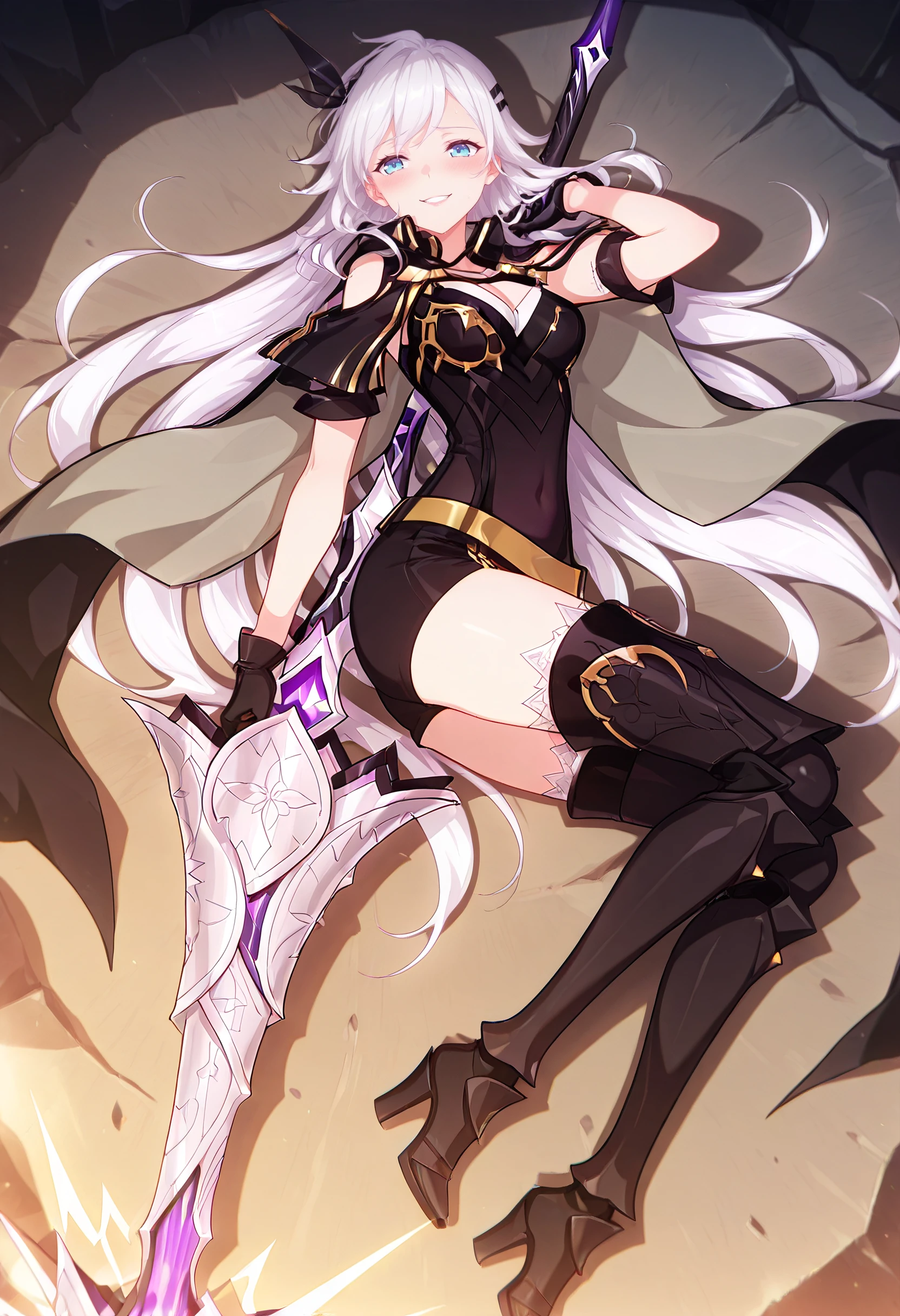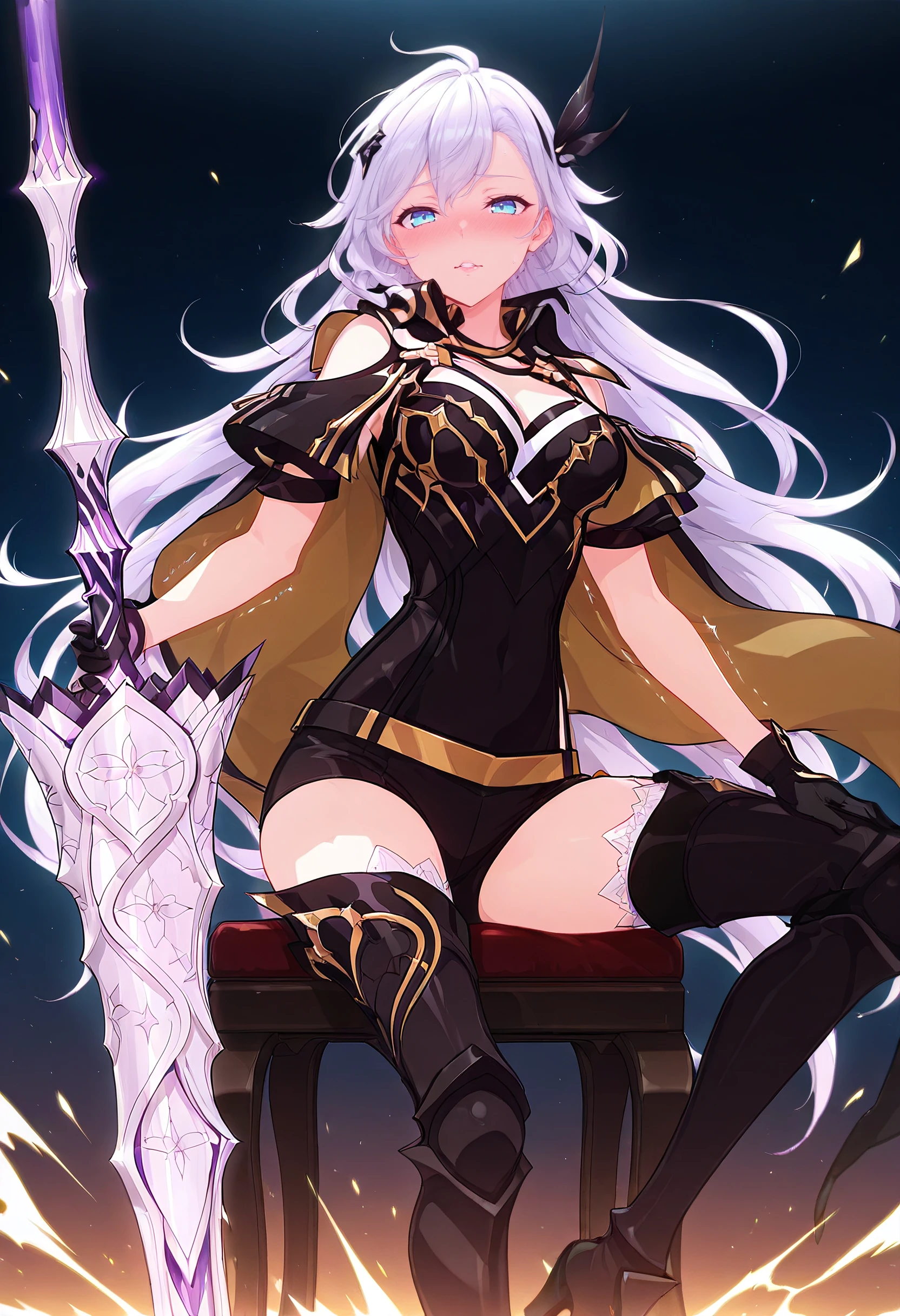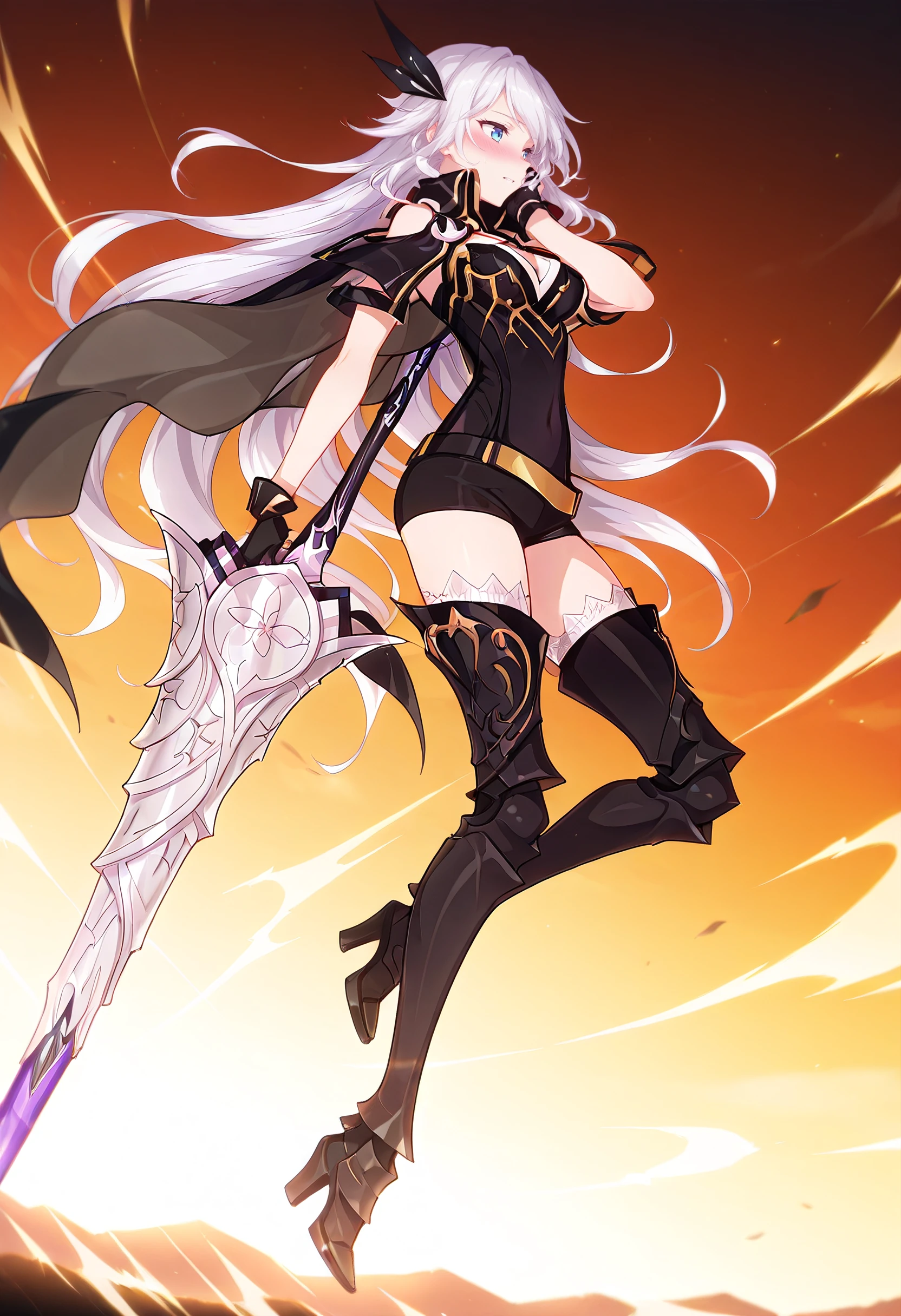 CeciliaOutfit, gloves, holding weapon, hair ornament, cape, cleavage, thighhighs, armor, boots, black thighhighs, black gloves, thigh boots, armored boots, belt, covered navel, shorts, black footwear, high heel boots,