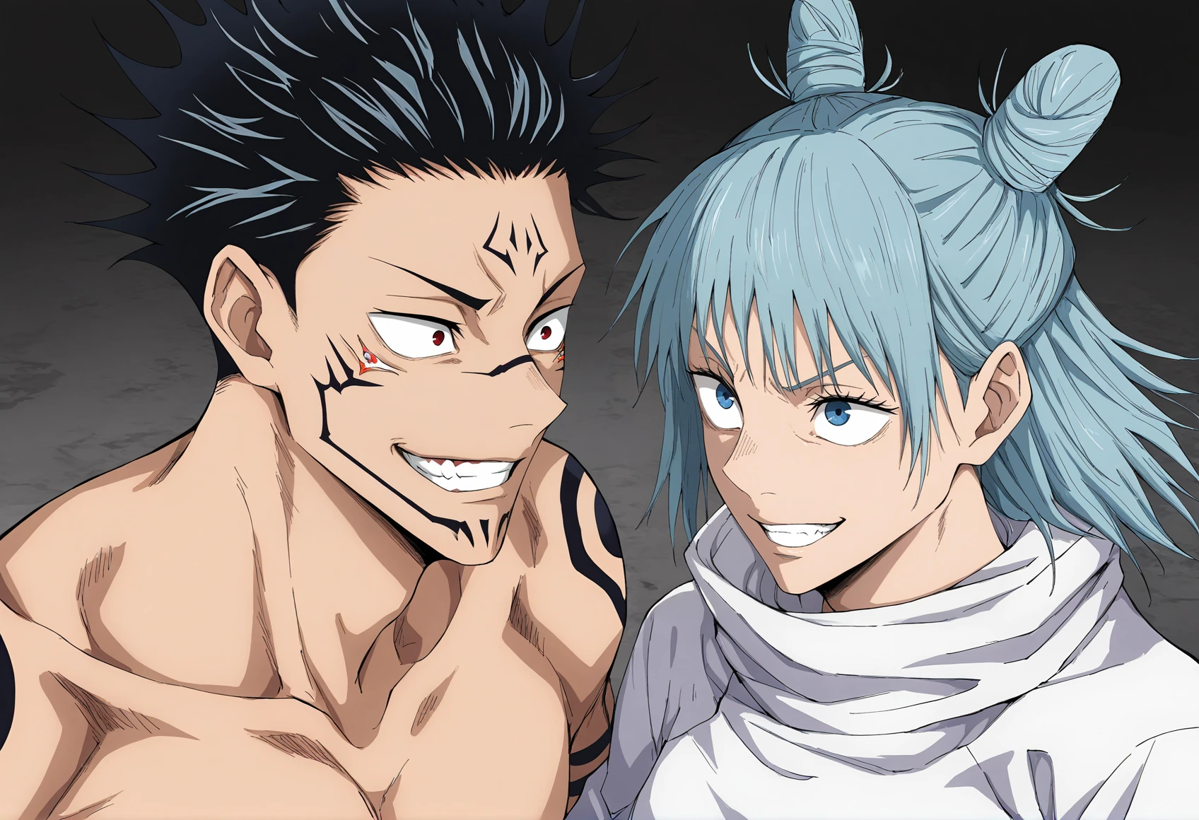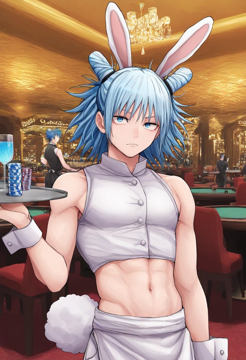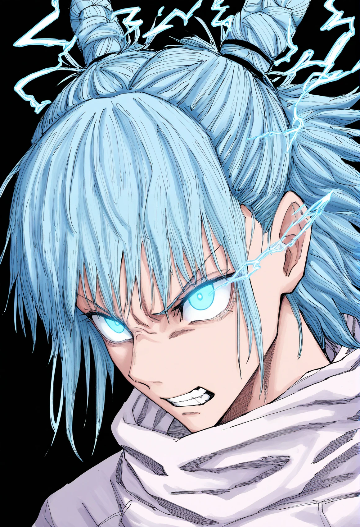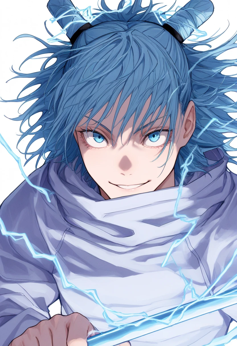 1boy, kashimo, SOLO, male focus, BLUE eyes, BLUE hair, hair bun, medium hair,