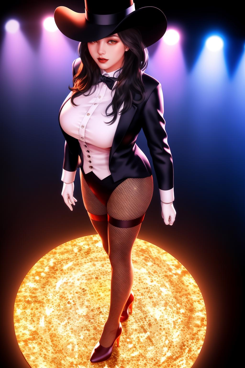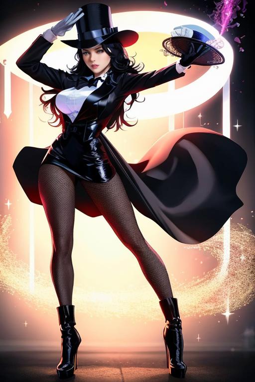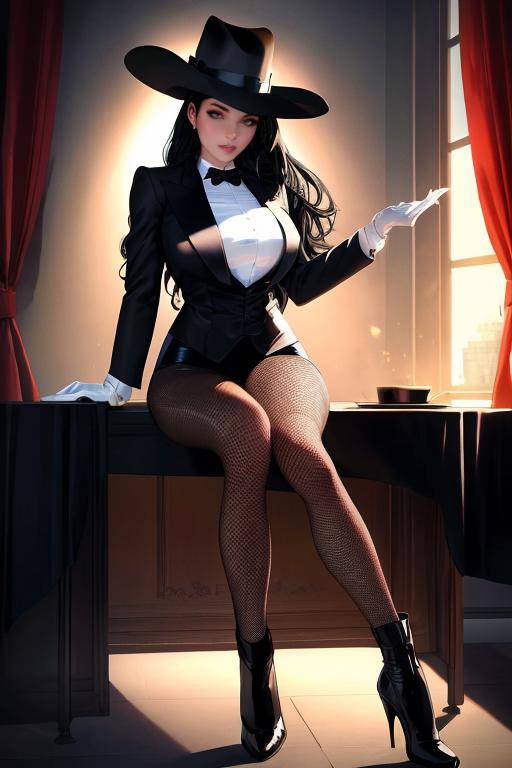 black_hair, long_hair, hat, fishnet_legwear, pantyhose, magician, white_gloves