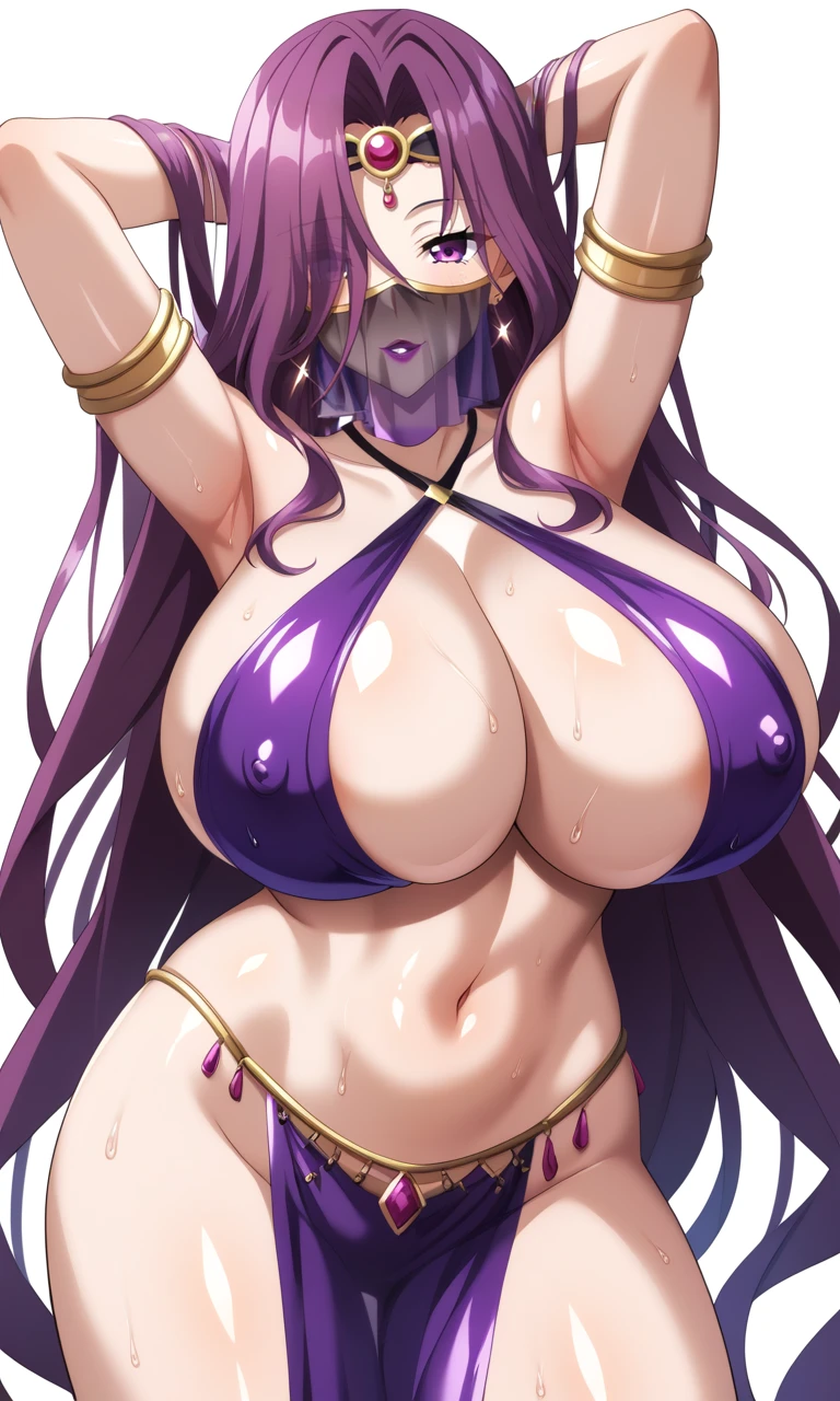 Yubelluna, 1girl, solo, very long hair, , purple eyes, purple hair, hair over one eye, circlet, purple lips, jewelry, big breast, curvy, wide hips,