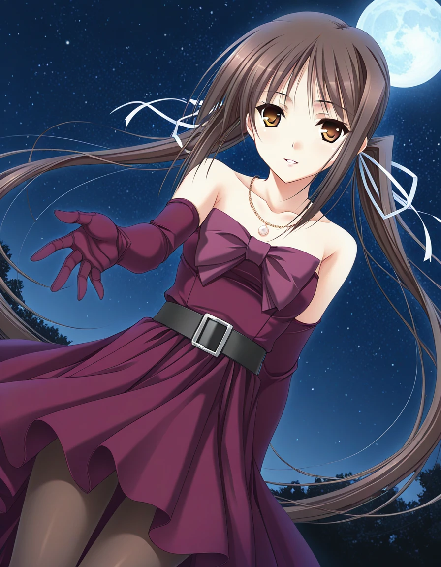Seika_Dress, purple dress, elbow gloves, bow, black belt, necklace, pantyhose